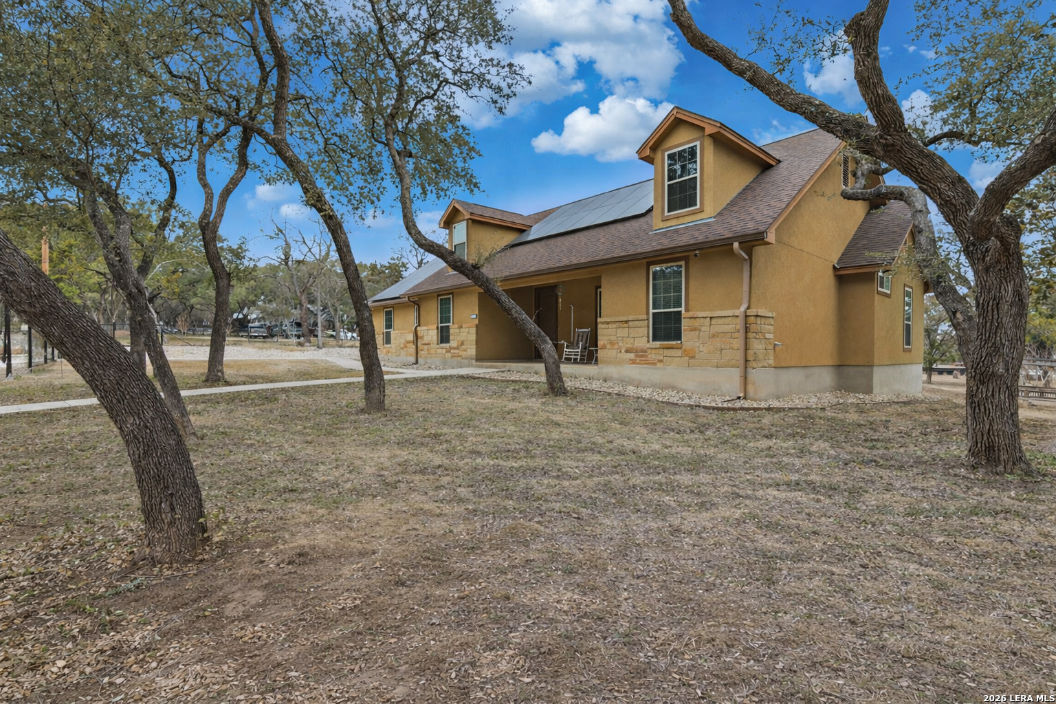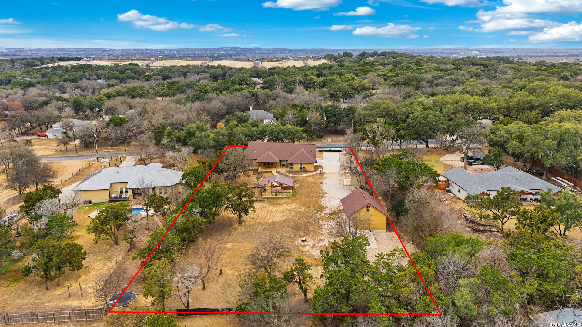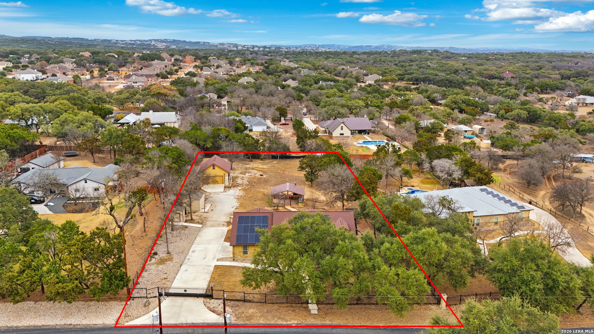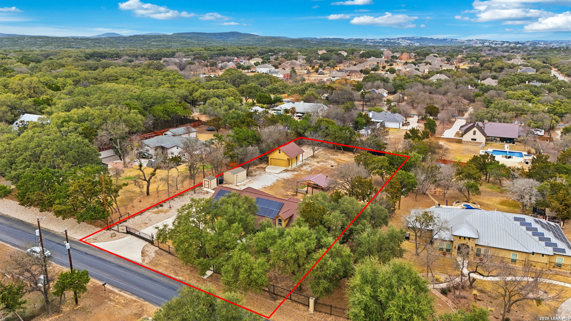 Open House: February 13, 2026 from 1PM - 4PM. Tucked beneath mature oaks on a sprawling lot, this stunning Helotes home offers a rare combination of privacy, efficiency, and thoughtful upgrades. Freshly repainted interiors welcome you with a warm, modern palette and light wood flooring throughout. The chef's kitchen features granite counters, stainless steel appliances, and ample cabinetry, all anchored by a striking stone breakfast bar. The spacious living area boasts a vaulted ceiling and floor-to-ceiling stone fireplace, perfect for cozy evenings. The split bedroom layout offers comfort and flexibility, with secondary bedrooms served by a full bathroom-ideal for guests, family, or a home office. The primary suite features a private en-suite with a shower only, creating a spa-like escape. Outside, an entertainer's dream awaits-a fully equipped outdoor kitchen under a custom metal-roofed pavilion. Enjoy the Texas sunsets or host unforgettable gatherings with ease. The home is also equipped with solar panels and includes a massive 1,200 sqft detached two-story garage, ideal for a workshop, home business, or future conversion. The neighborhood does not have an HOA so your options are limitless.This Hill Country retreat is ready to impress!