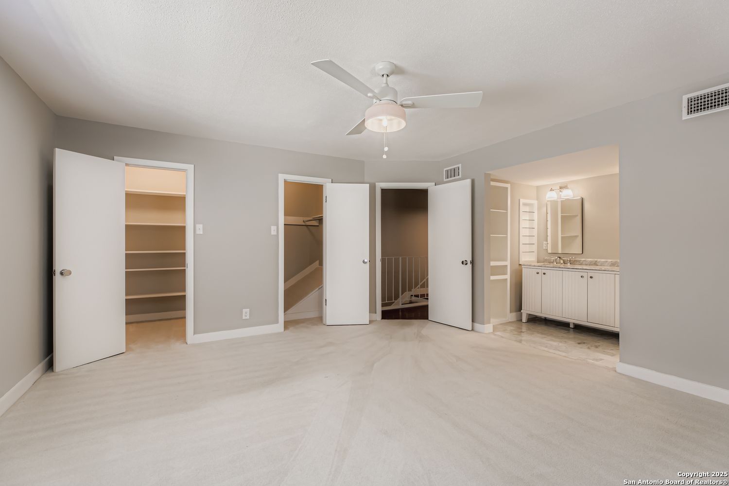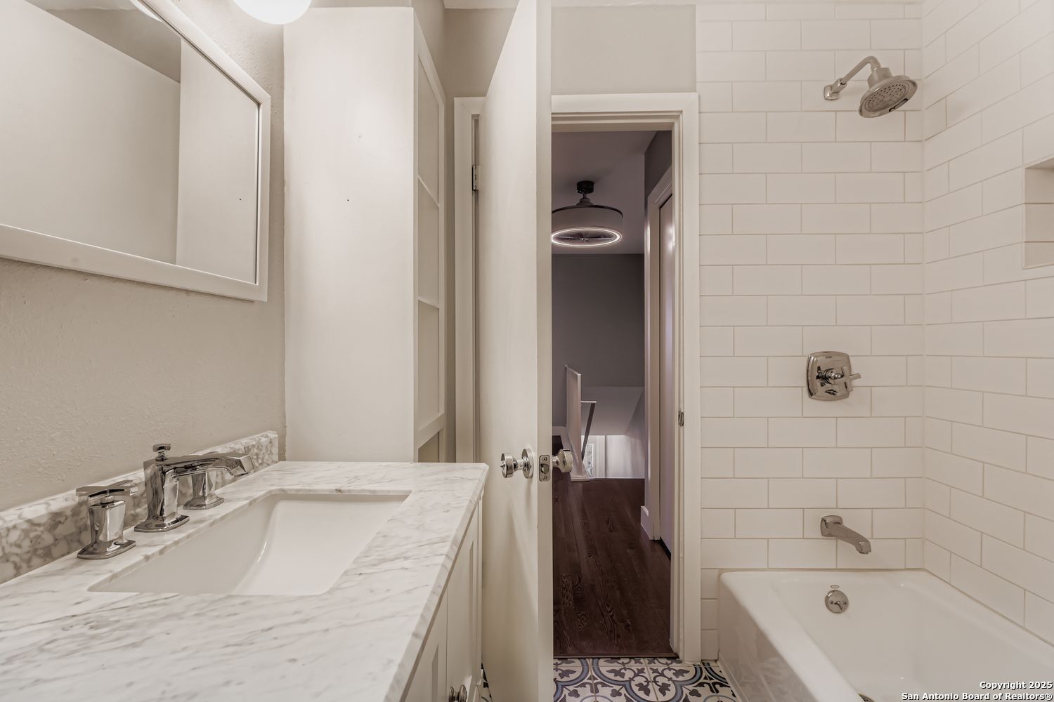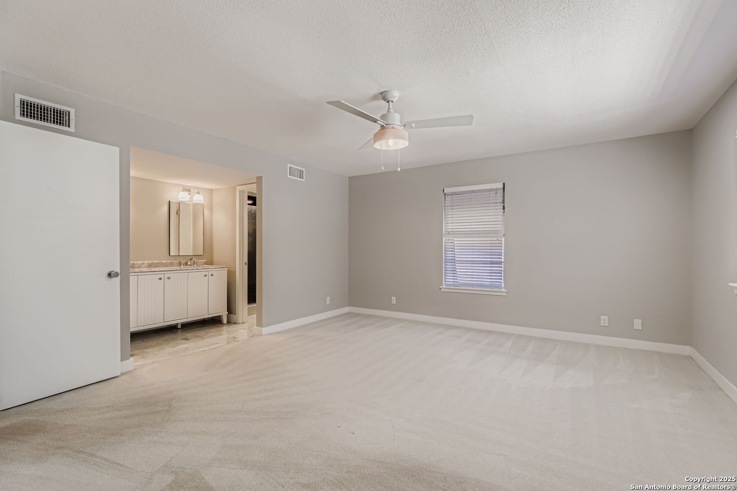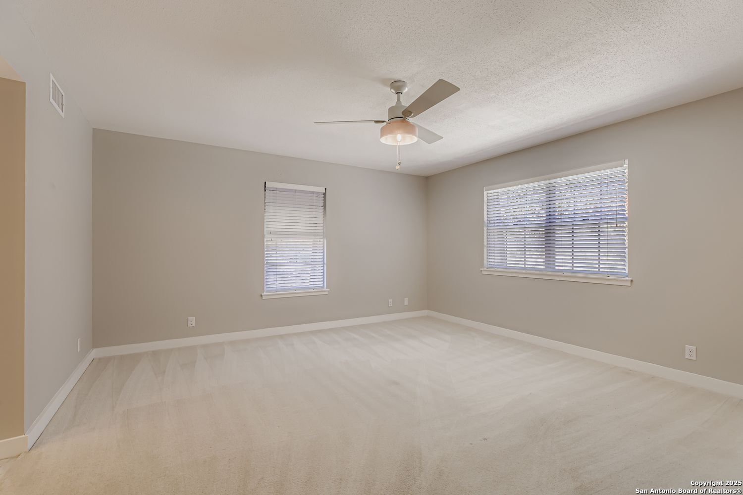 Discover effortless living in this beautifully updated townhome in the desirable Whispering Oaks community. This spacious two-story layout features 2 bedrooms and 2 full bathrooms plus a 1/2 bathroom along with multiple living and flex spaces designed for comfort and versatility. Step inside to find modern lighting/ceiling fans and porcelain tile and flooring that carry throughout the main living areas. Living room and family room boast wood floors. Kitchen with plenty of cabinets and stone counters its ready for your gourmet meal prep. Includes refrigerator. The home offers both a living room and a separate family room with a cozy wood-burning fireplace, plus a dedicated dining room for gatherings. An extra featured flex room provides the perfect spot for a home office, movie room, gaming space, or creative studio-whatever suits your lifestyle. The owners suite with updated marble vanity and shower area are the perfect retreat after a long day. Enjoy the convenience of a 2-car side-entry garage and the privacy of a greenbelt behind the home. Located in one of San Antonio's most established and tree-filled neighborhoods, this house combines modern updates with classic Whispering Oaks charm-a perfect blend of comfort, style, and convenience.