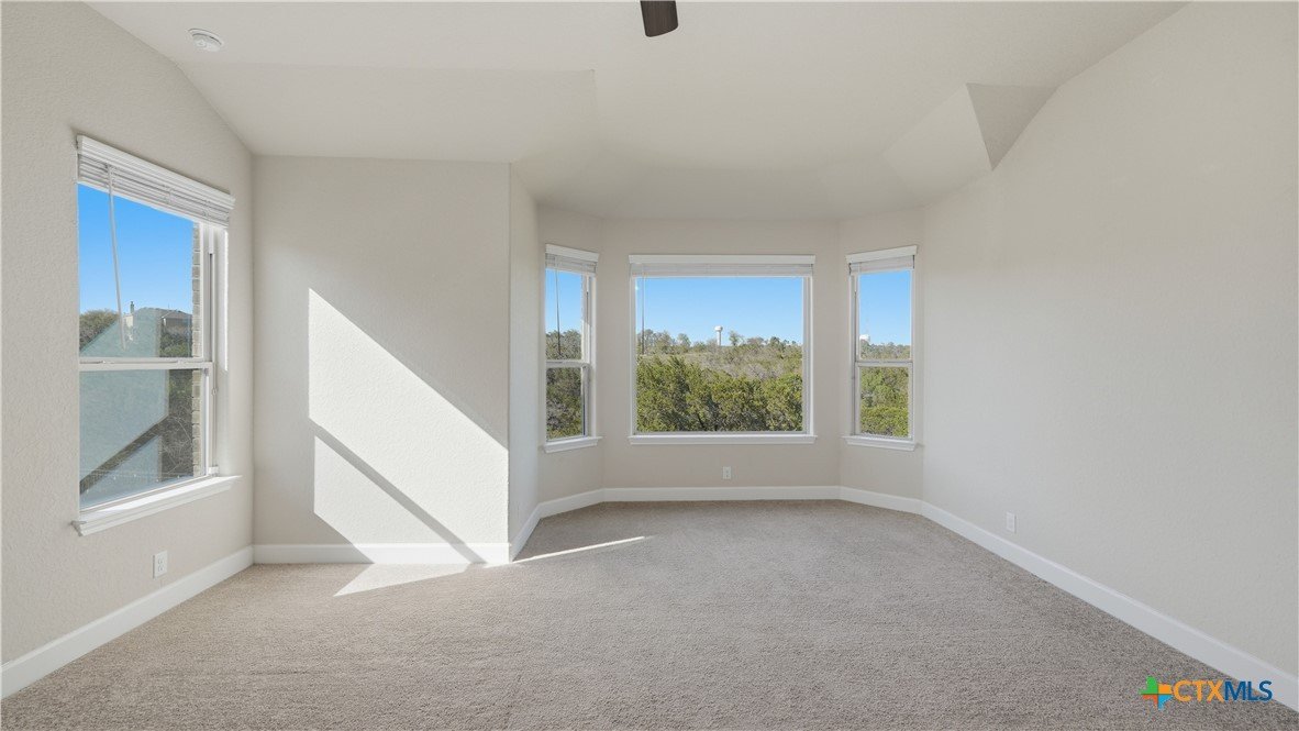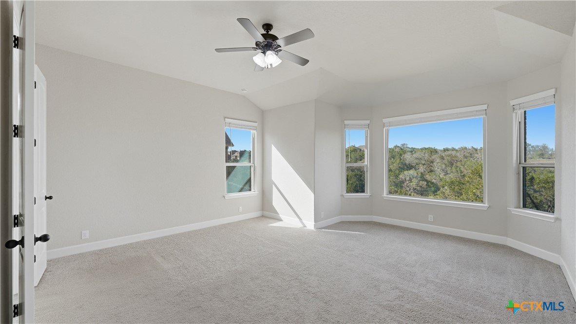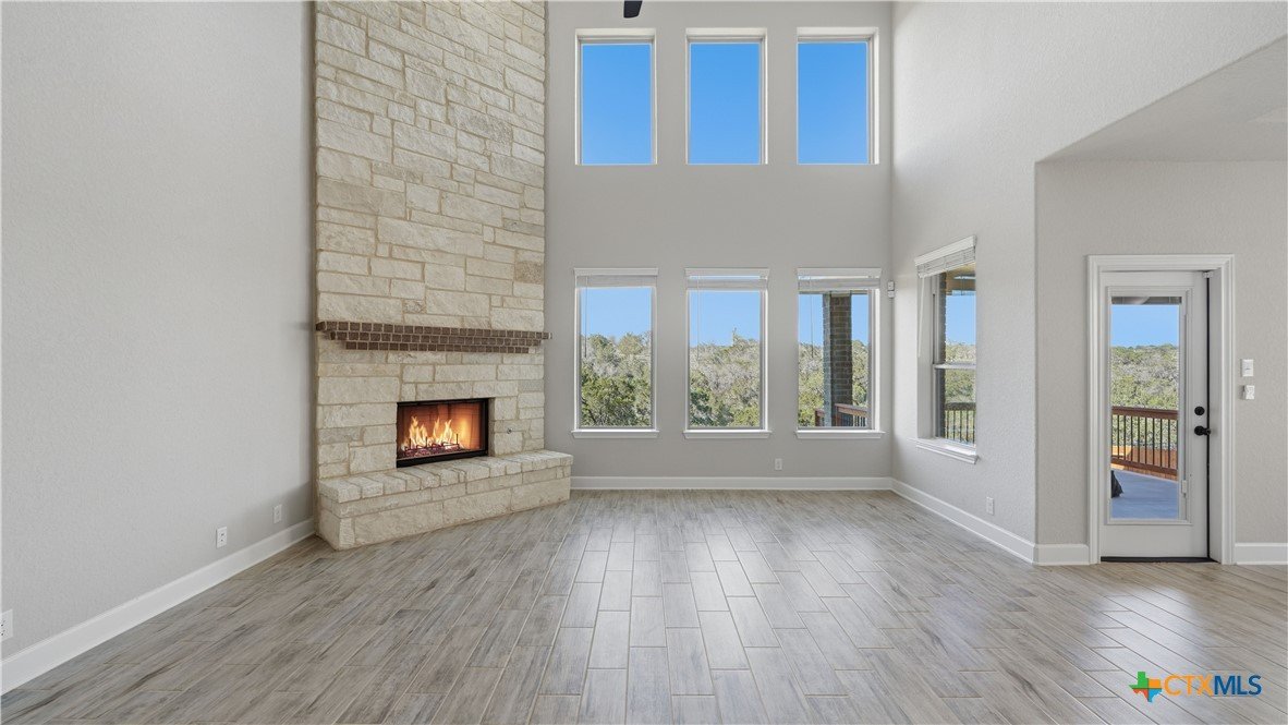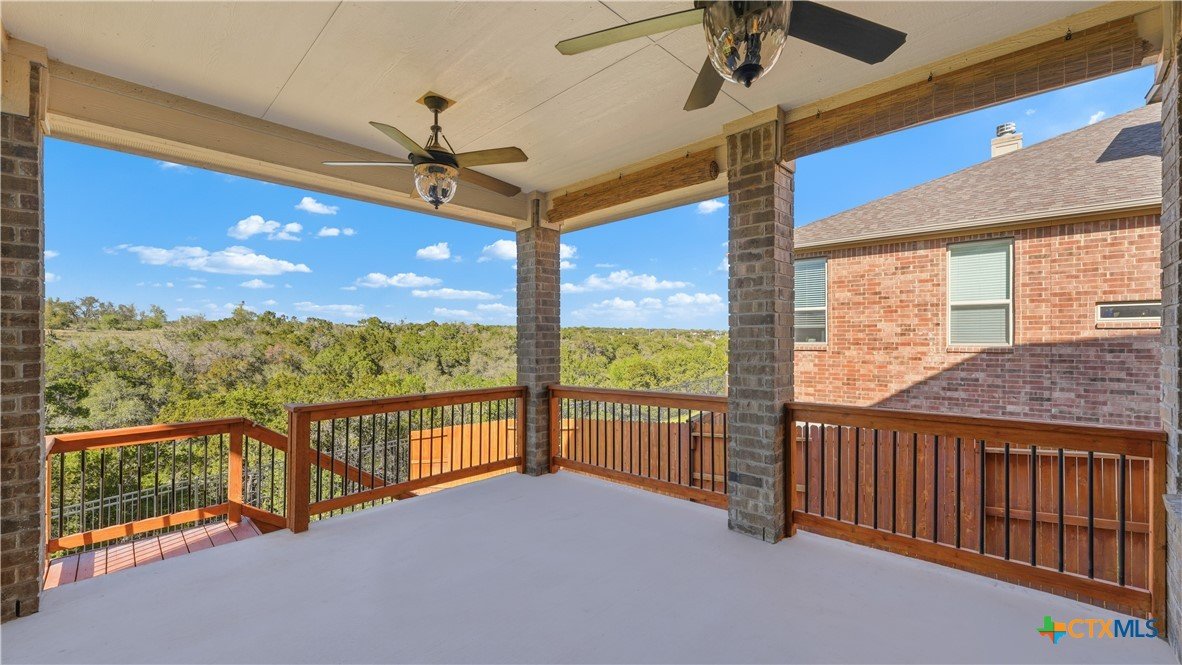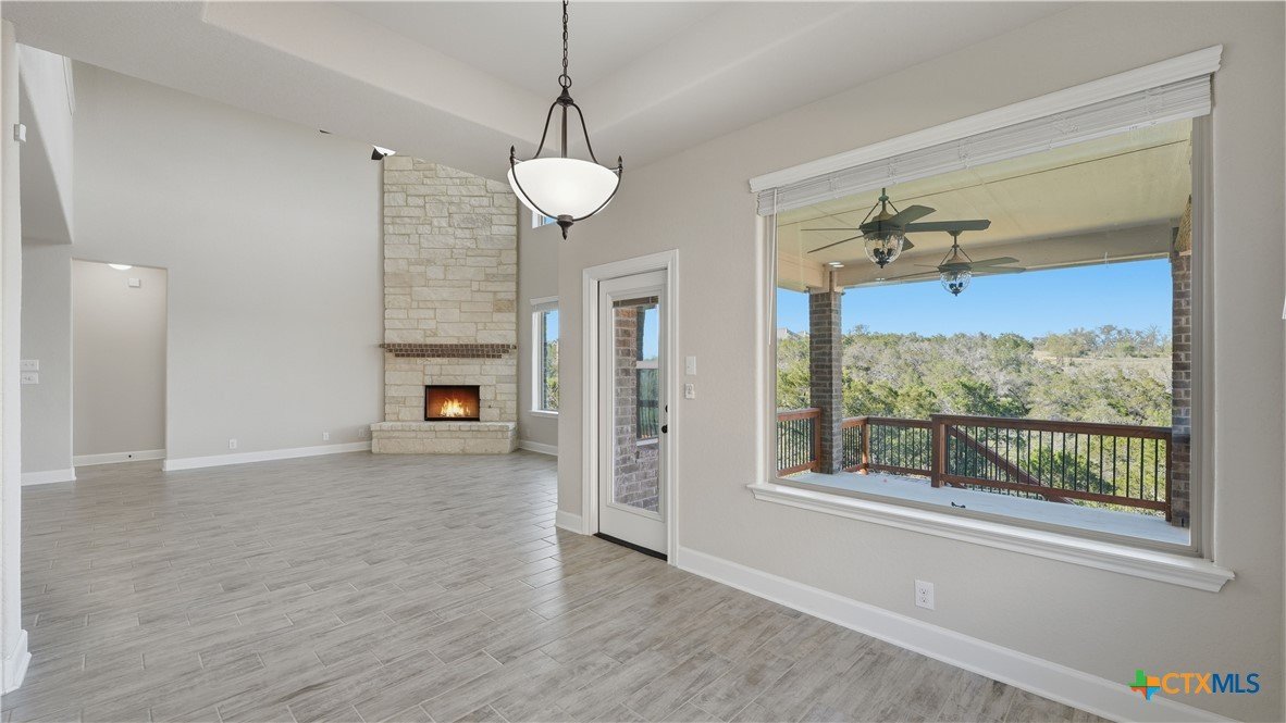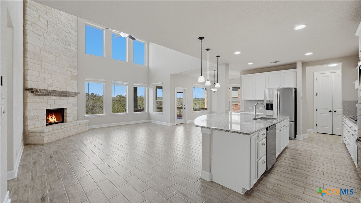 Roaring Falls Overlook is positioned in the sought-after Estates at Stone Crossing, a beautifully designed Ashton Woods home capturing sweeping Hill Country views with no rear neighbors, creating a private and peaceful backdrop that is increasingly rare in New Braunfels. From the moment you step inside, soaring ceilings, expansive windows, and an open-concept layout showcase the natural beauty beyond the home while filling the interior with abundant natural light. The thoughtfully designed floor plan offers both functionality and flexibility with multiple living and dining areas, ideal for everyday living and entertaining. The spacious living room is anchored by a stunning floor-to-ceiling stone gas fireplace and framed by dramatic windows that highlight the elevated views. The open kitchen is designed for both everyday living and entertaining, featuring custom cabinetry, double ovens, gas cooking, generous counter space, and an oversized breakfast bar with additional seating. A walk-through butler's pantry connects the dining room to the kitchen, adding both convenience and additional storage. The primary suite is conveniently located on the main level and offers a private retreat with large windows overlooking the serene landscape. A secondary bedroom with its own bathroom is also located downstairs, providing an ideal setup for guests, multigenerational living, or a private home office. Upstairs, additional living space includes a media room and flexible space for a game room, study, or secondary lounge. Designed to maximize the scenery, the home opens to a covered outdoor living area where you can enjoy panoramic views of New Braunfels and the surrounding Hill Country with no homes directly behind you. Whether hosting gatherings or enjoying quiet mornings, the outdoor space offers both privacy and tranquility. This home offers a rare combination of privacy, views, and convenience in one of New Braunfels' desirable communities.