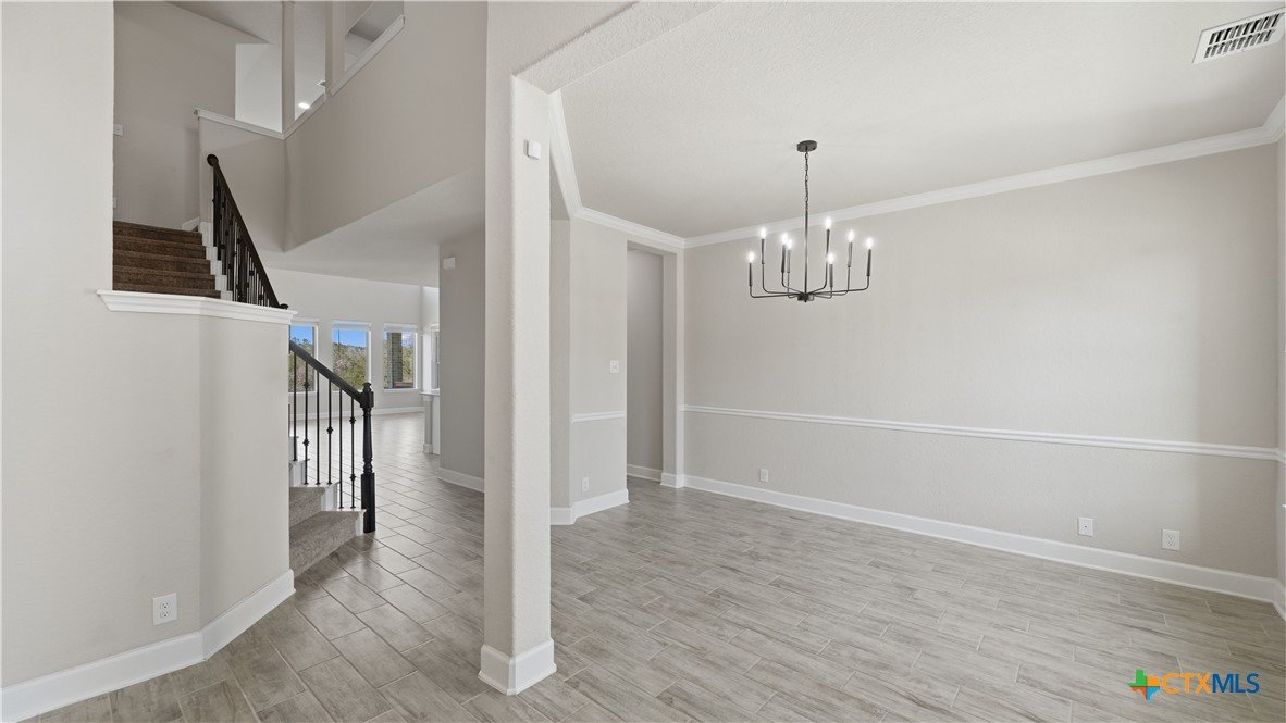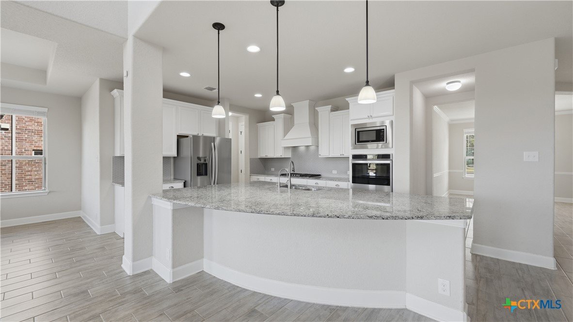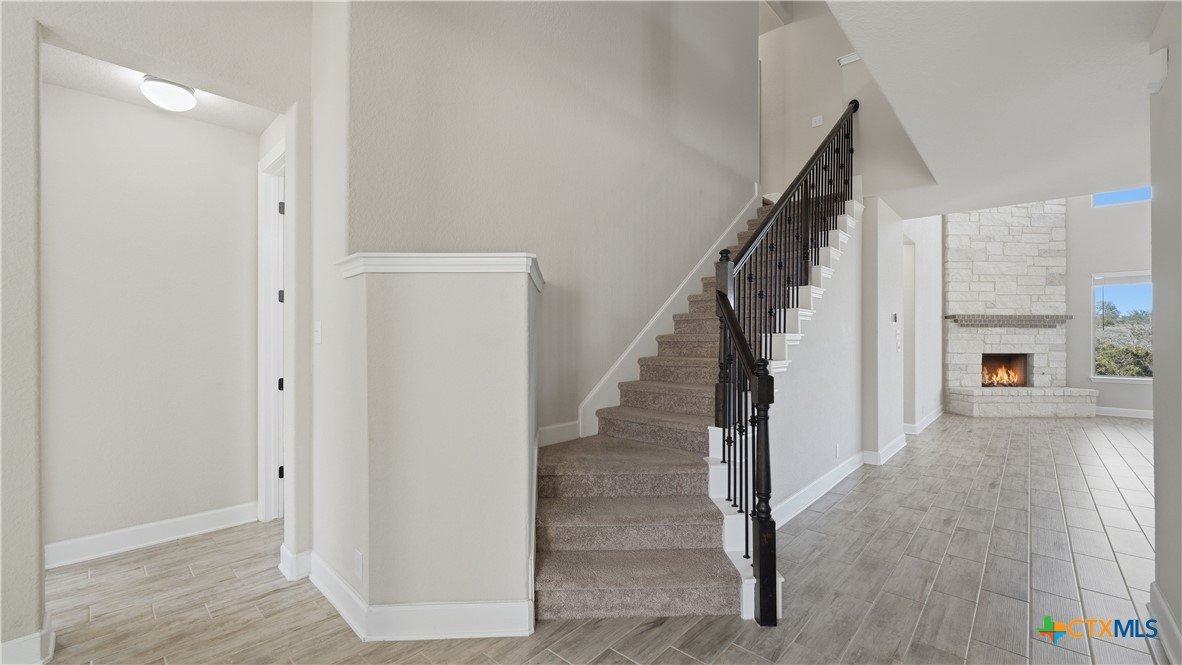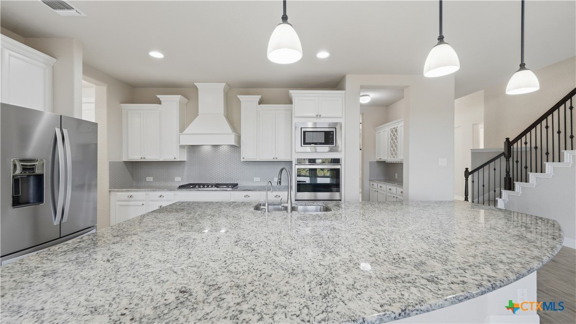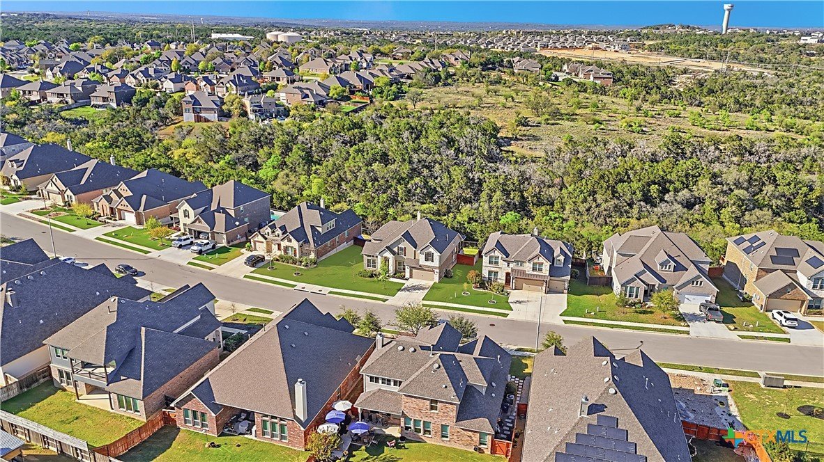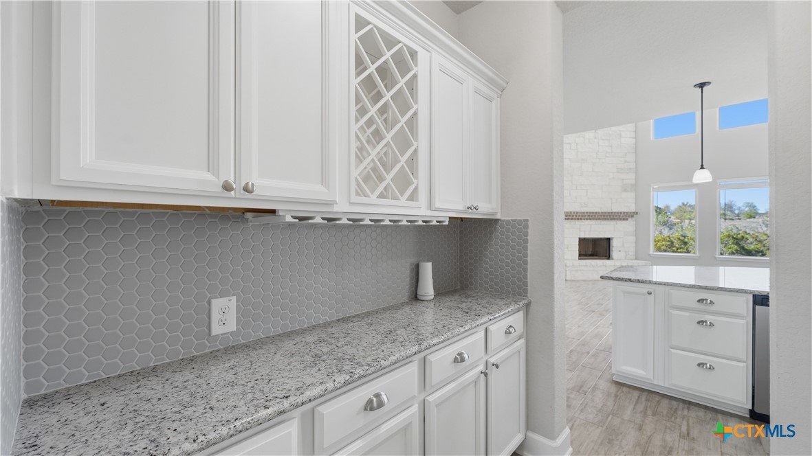 Roaring Falls Overlook is positioned in the sought-after Estates at Stone Crossing, a beautifully designed Ashton Woods home capturing sweeping Hill Country views with no rear neighbors, creating a private and peaceful backdrop that is increasingly rare in New Braunfels. From the moment you step inside, soaring ceilings, expansive windows, and an open-concept layout showcase the natural beauty beyond the home while filling the interior with abundant natural light. The thoughtfully designed floor plan offers both functionality and flexibility with multiple living and dining areas, ideal for everyday living and entertaining. The spacious living room is anchored by a stunning floor-to-ceiling stone gas fireplace and framed by dramatic windows that highlight the elevated views. The open kitchen is designed for both everyday living and entertaining, featuring custom cabinetry, double ovens, gas cooking, generous counter space, and an oversized breakfast bar with additional seating. A walk-through butler's pantry connects the dining room to the kitchen, adding both convenience and additional storage. The primary suite is conveniently located on the main level and offers a private retreat with large windows overlooking the serene landscape. A secondary bedroom with its own bathroom is also located downstairs, providing an ideal setup for guests, multigenerational living, or a private home office. Upstairs, additional living space includes a media room and flexible space for a game room, study, or secondary lounge. Designed to maximize the scenery, the home opens to a covered outdoor living area where you can enjoy panoramic views of New Braunfels and the surrounding Hill Country with no homes directly behind you. Whether hosting gatherings or enjoying quiet mornings, the outdoor space offers both privacy and tranquility. This home offers a rare combination of privacy, views, and convenience in one of New Braunfels' desirable communities.