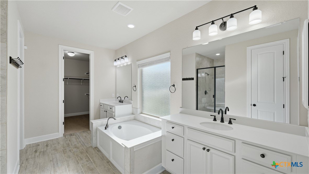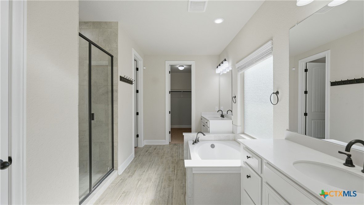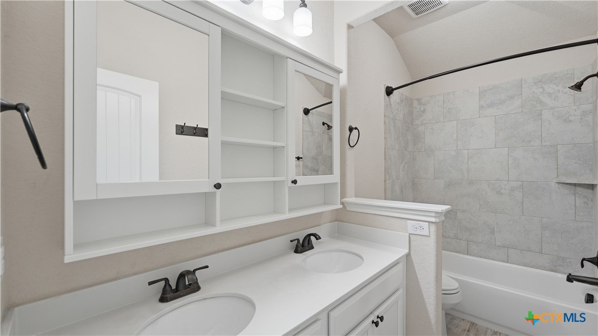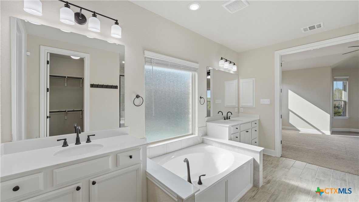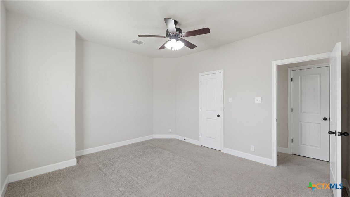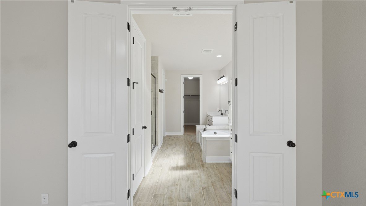 Roaring Falls Overlook is positioned in the sought-after Estates at Stone Crossing, a beautifully designed Ashton Woods home capturing sweeping Hill Country views with no rear neighbors, creating a private and peaceful backdrop that is increasingly rare in New Braunfels. From the moment you step inside, soaring ceilings, expansive windows, and an open-concept layout showcase the natural beauty beyond the home while filling the interior with abundant natural light. The thoughtfully designed floor plan offers both functionality and flexibility with multiple living and dining areas, ideal for everyday living and entertaining. The spacious living room is anchored by a stunning floor-to-ceiling stone gas fireplace and framed by dramatic windows that highlight the elevated views. The open kitchen is designed for both everyday living and entertaining, featuring custom cabinetry, double ovens, gas cooking, generous counter space, and an oversized breakfast bar with additional seating. A walk-through butler's pantry connects the dining room to the kitchen, adding both convenience and additional storage. The primary suite is conveniently located on the main level and offers a private retreat with large windows overlooking the serene landscape. A secondary bedroom with its own bathroom is also located downstairs, providing an ideal setup for guests, multigenerational living, or a private home office. Upstairs, additional living space includes a media room and flexible space for a game room, study, or secondary lounge. Designed to maximize the scenery, the home opens to a covered outdoor living area where you can enjoy panoramic views of New Braunfels and the surrounding Hill Country with no homes directly behind you. Whether hosting gatherings or enjoying quiet mornings, the outdoor space offers both privacy and tranquility. This home offers a rare combination of privacy, views, and convenience in one of New Braunfels' desirable communities.