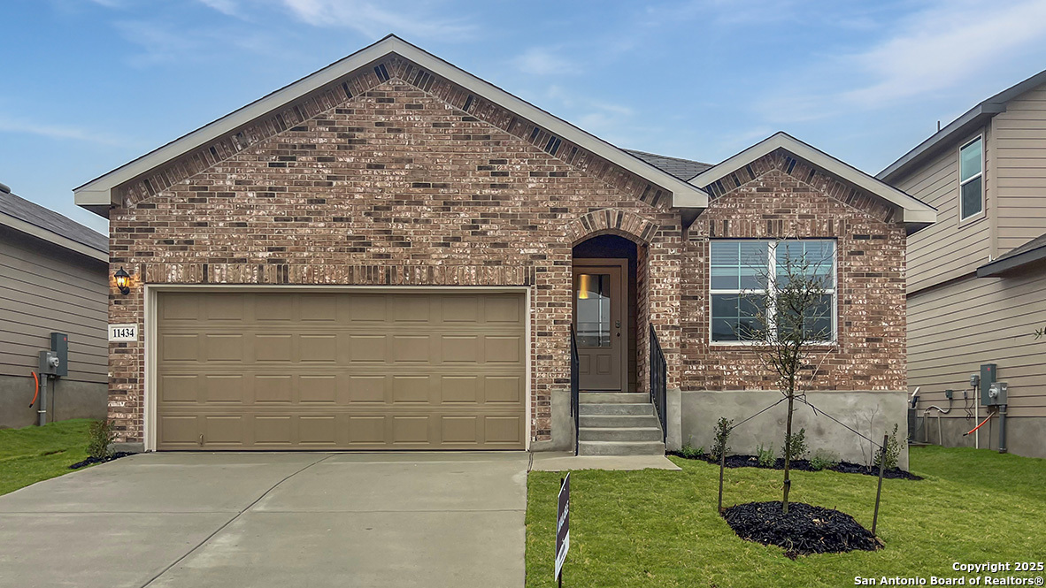 The Bryant is a single-story, 1703 square foot, 4-bedroom, 2 bathroom, layout designed to provide you with spacious, open concept living. Welcome guests as they walk through the elongated foyer with decorative nook to the spacious eat-in kitchen. Facing the family room area, the kitchen includes an oversized island, corner pantry with shelving, plenty of cabinet storage, granite countertops, stylish subway tile backsplash, stainless steel appliances, and electric cooking range. The private main bedroom is located at the back of the house and features a relaxing ensuite complete with double vanities, separate tub and walk-in shower, water closet, and spacious walk-in closet. One secondary bedroom is located off the entry and is ideal for an office space. The remaining secondary bedrooms and second full bath are centrally located off the kitchen, and a spacious utility room is conveniently located adjacent to the family room. Additional features include tall 9-foot ceilings, 2-inch faux wood blinds throughout the home, luxury vinyl plank flooring in the entry, family room, kitchen, and dining area, ceramic tile in the bathrooms and utility room, and pre-plumb for water softener loop. You'll enjoy added security in your new home with our Home is Connected features. Using one central hub that talks to all the devices in your home, you can control the lights, thermostat and locks, all from your cellular device. Relax outside on a covered patio (per plan) located off the family room and enjoy full yard landscaping and full yard irrigation.