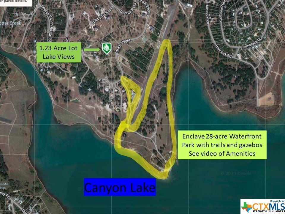 Canyon Lakes premier gated community. With 28 Acre waterfront park, hiking and biking trials, gazebo, pavilion, and fantastic pool with great views of lake. If interested access to adjacent Canyon Lake Private Airport (34TS) is available with hangar purchase, but also may be used by friends or family with an airplane. Large lot, good views of the lake and marina on the far shore. Fantastic location, WNW side of Lake about equal distance (1 hr) between San Antonio and Austin. 30 min to San Marco and New Braunfels