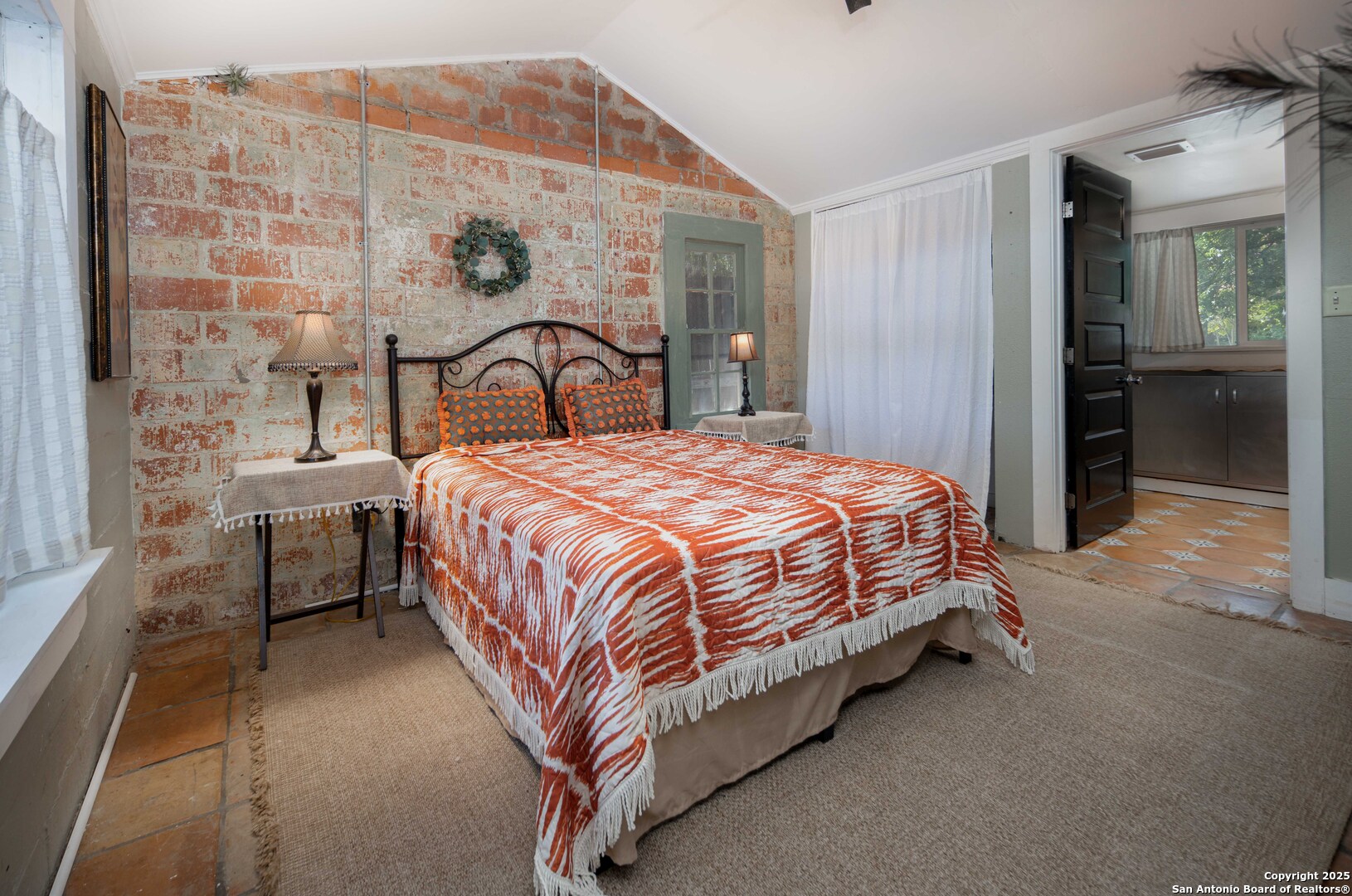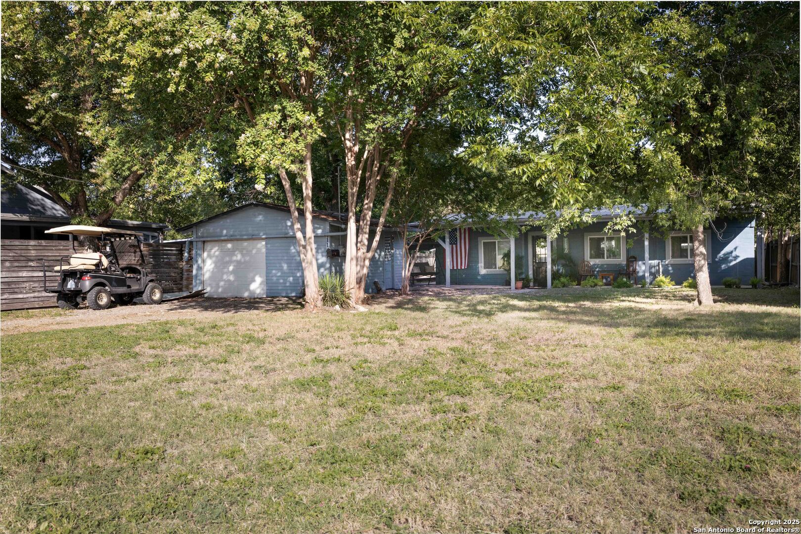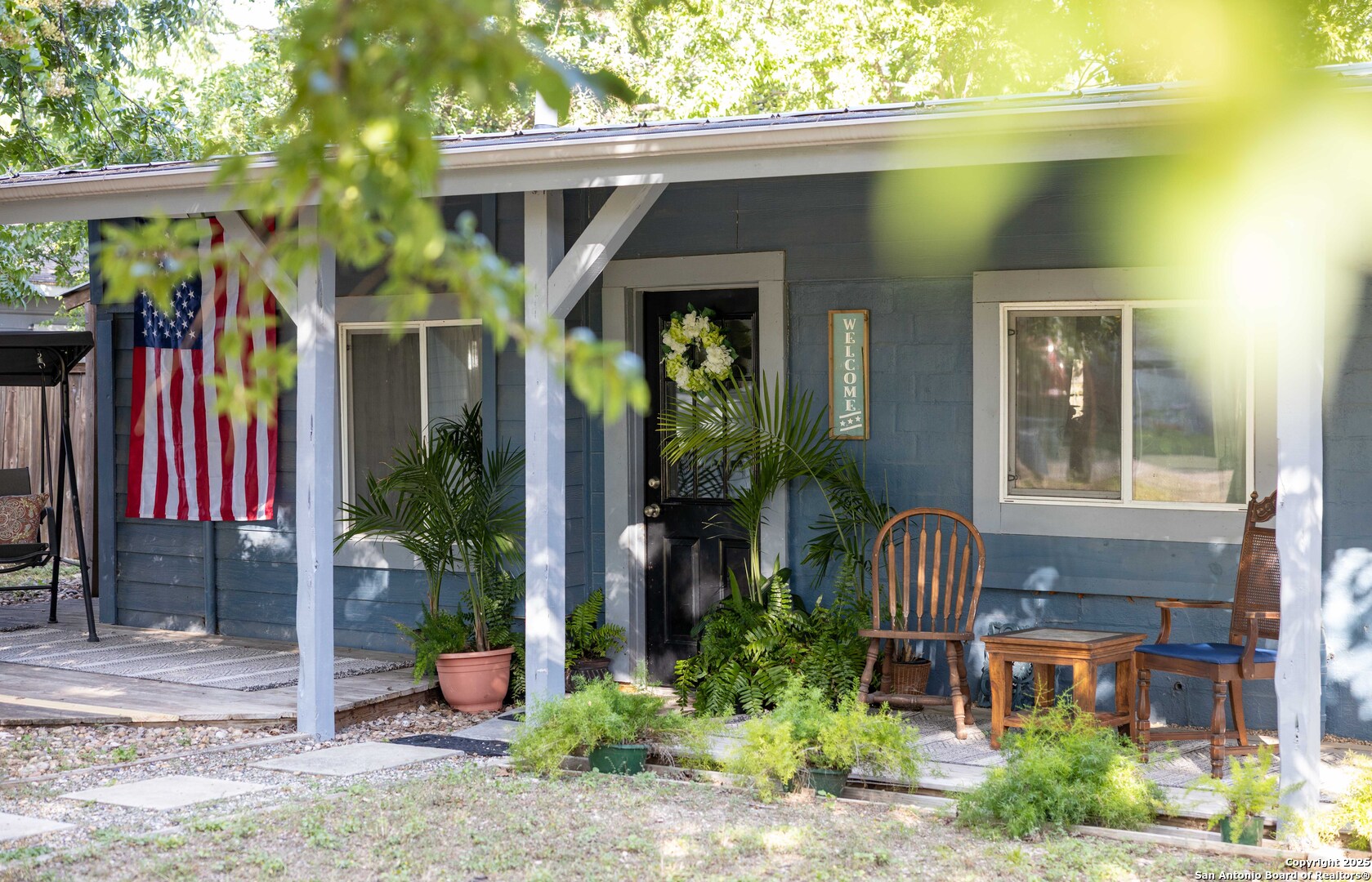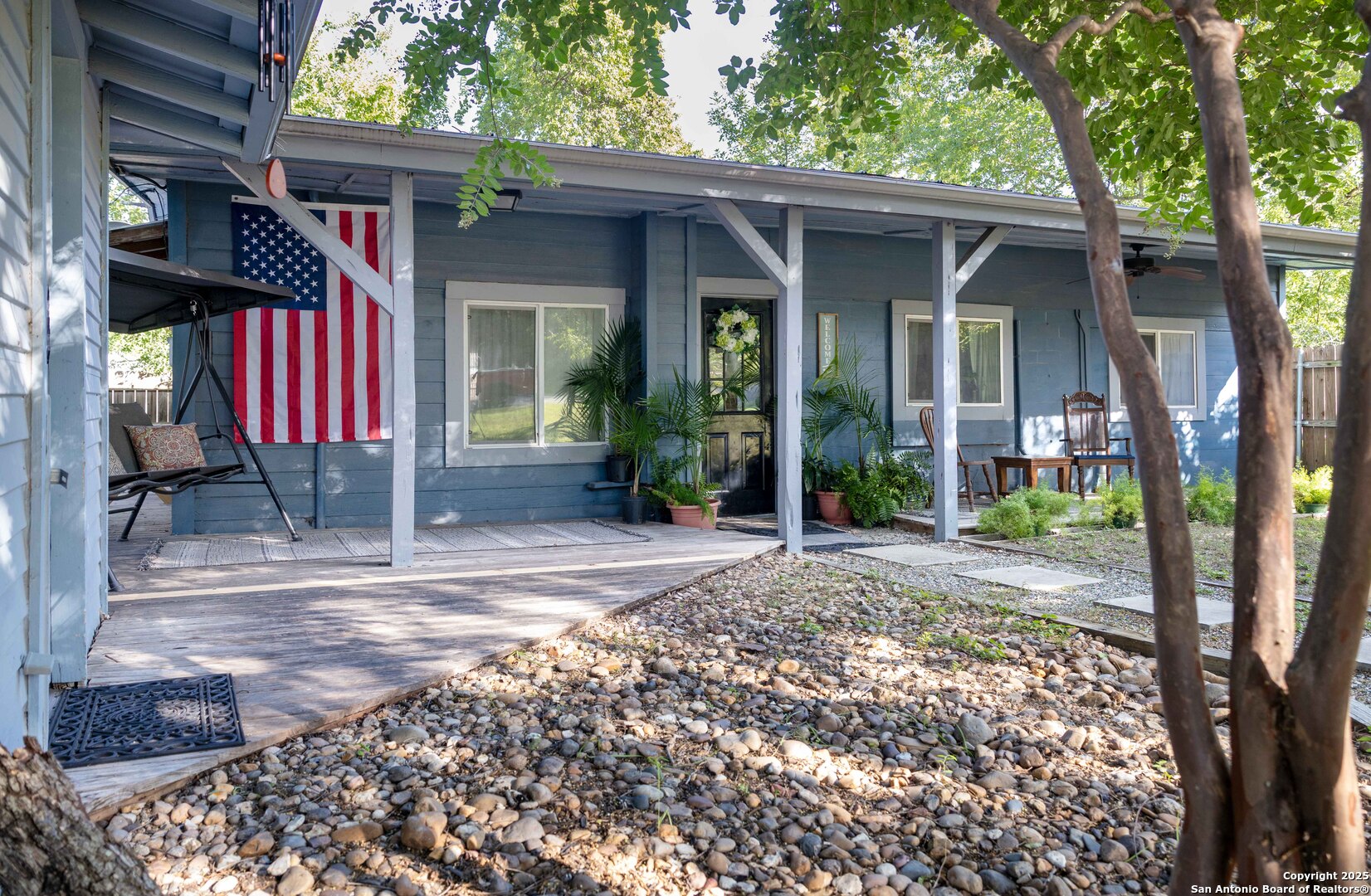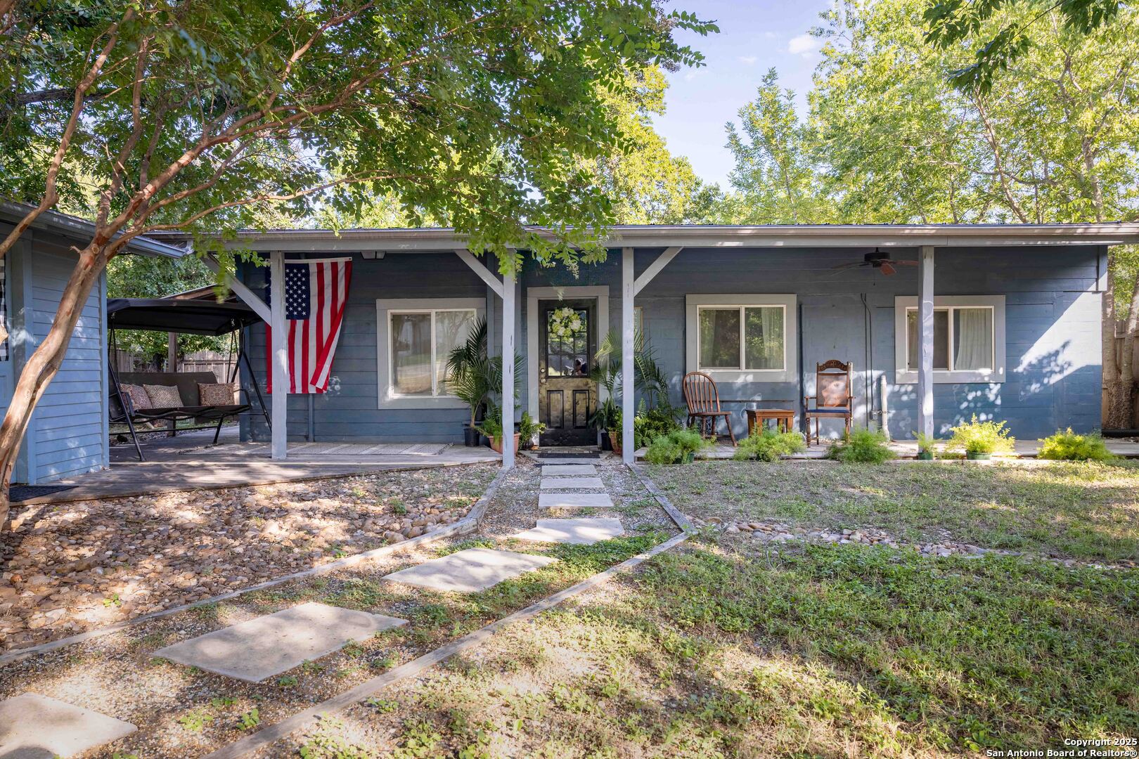 Located in the heart of New Braunfels, this quaint 1947 home has been made to provide a cozy retreat with simplicity and privacy. Tucked back amongst Native Pecans and mature shade trees, this 1 bedroom, 1 bath home is teeming with character and privacy. Exposed brick walls, Saltillo tile, and beaded-ceilings are some of the features which adorn this charming New Braunfels bungalow. Including appliances such as microwave, stove, and nearly-new stainless refrigerator, this house is ready to call home. A small, yet inviting space which is easily maintained and boasts low utility costs. Concrete-countertop peninsula offers an open floor plan with clear view of the living, dining, and kitchen. More than 450 sq. ft. of wraparound porch and patio. Oversized 1- car garage, pecan-producing trees, and easy-access to rivers, schools, shopping and dining. Situated near the back of the lot, this property may also be IDEAL for anyone looking to build a new home, while enjoying the existing home as a guest suite, office space, or perhaps an artistic oasis. A rare opportunity at this price point. Whether it's a night-in, or enjoying cool evenings on the expansive porch and patio, this spot truly embraces the New Braunfels lifestyle.