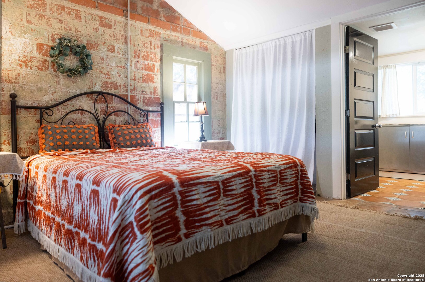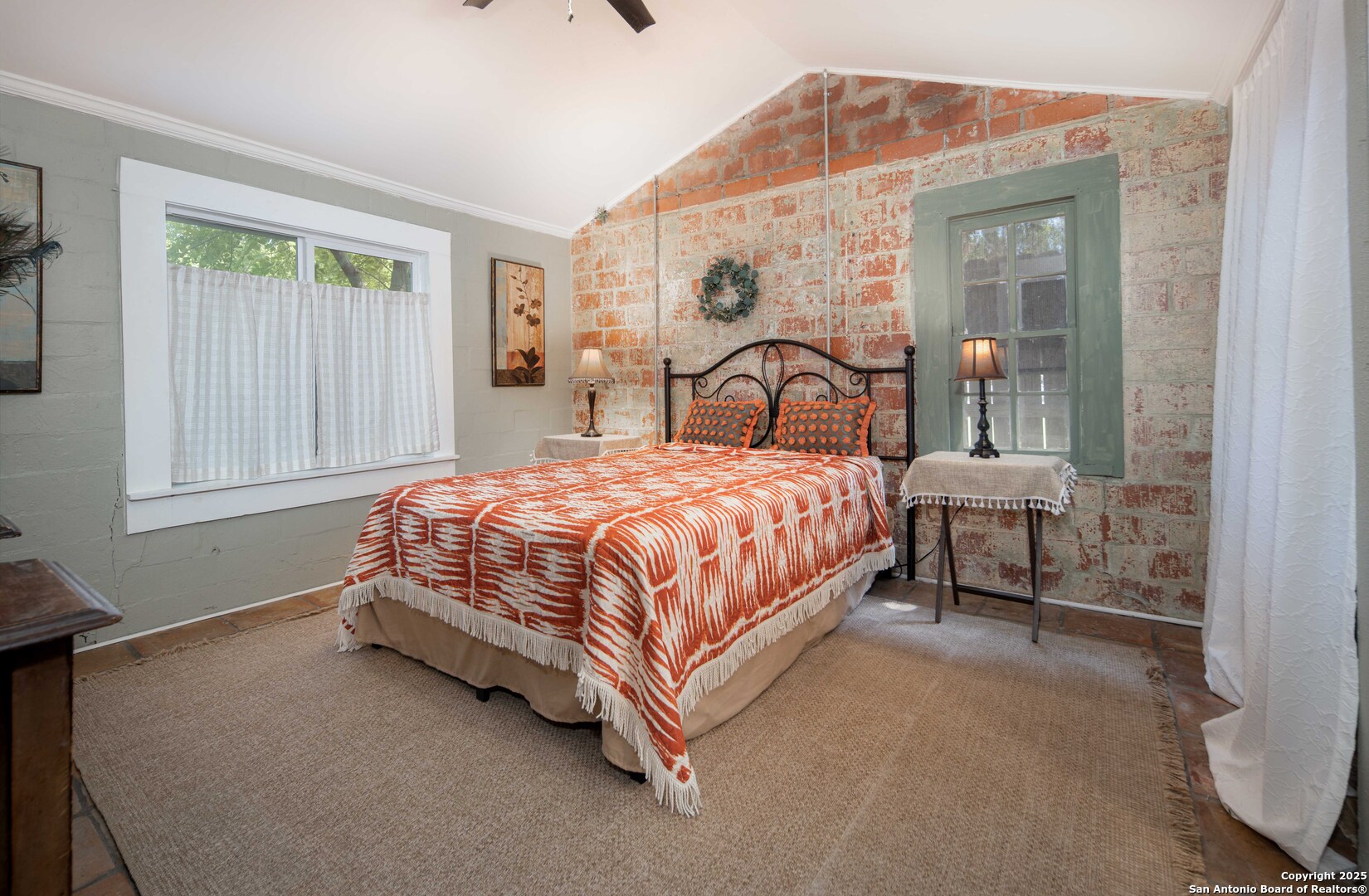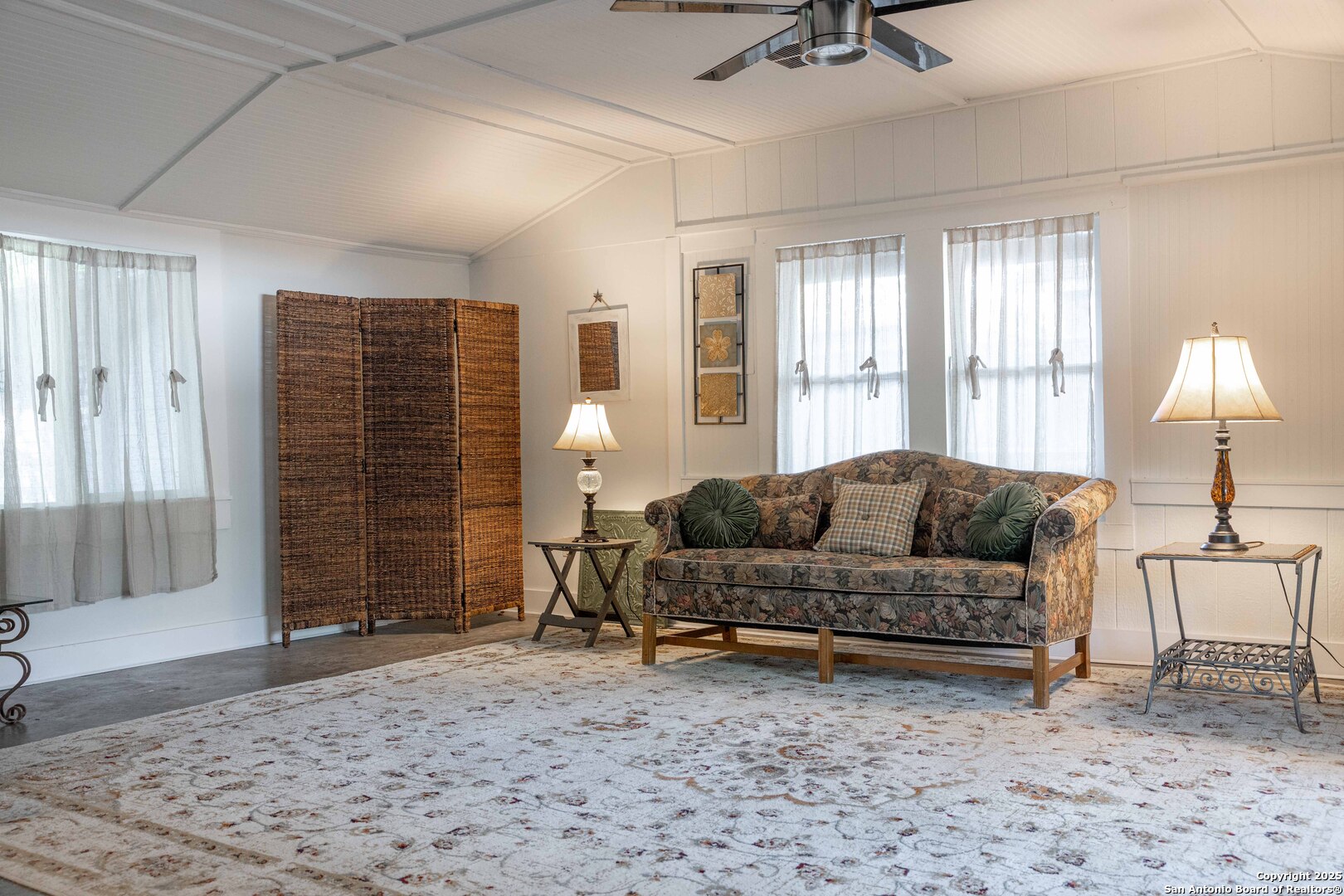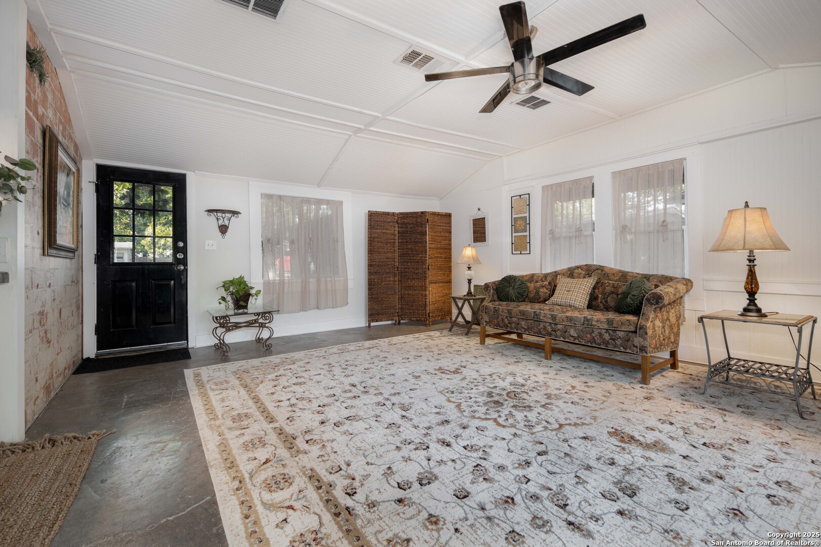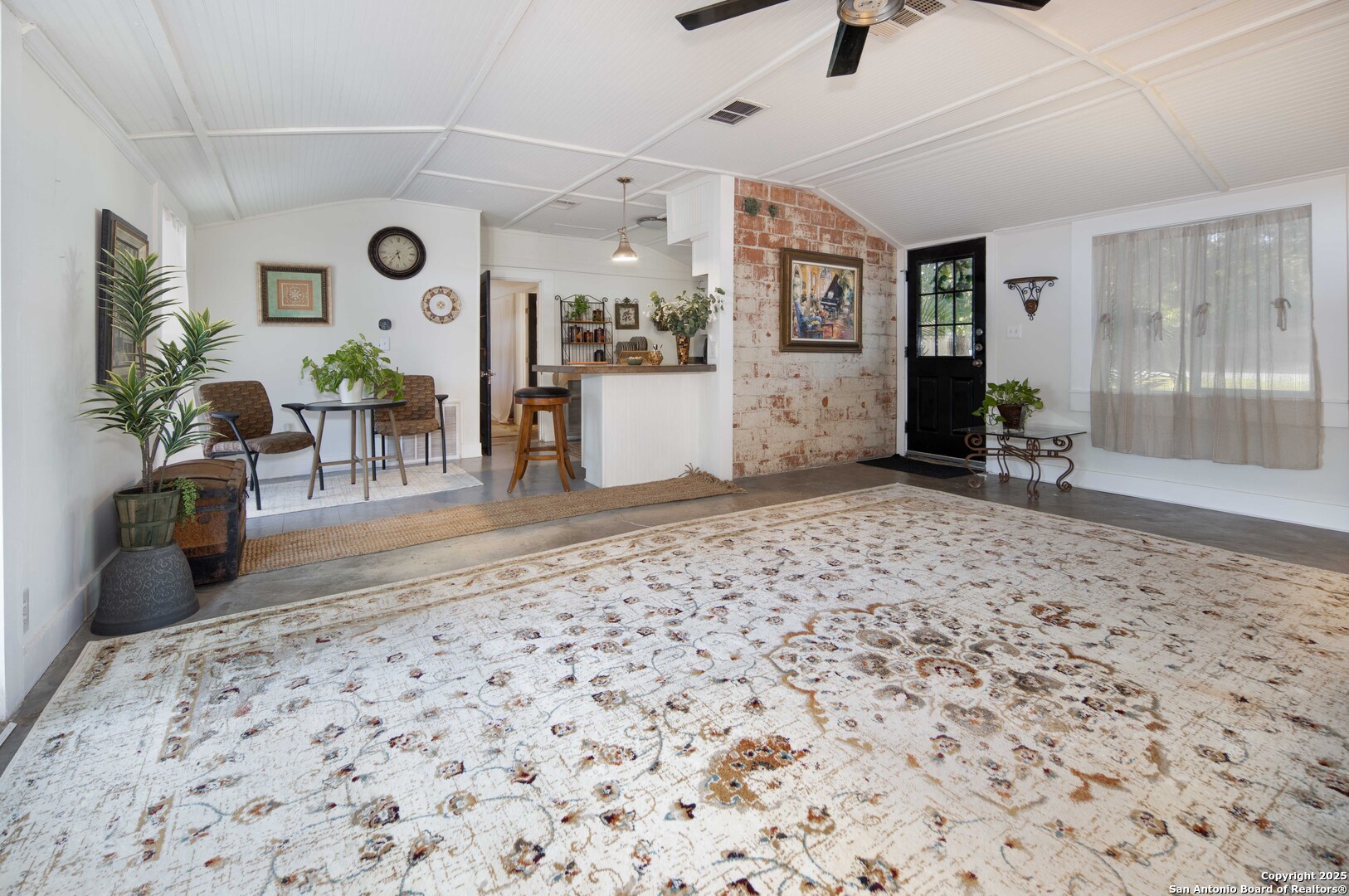 Located in the heart of New Braunfels, this quaint 1947 home has been made to provide a cozy retreat with simplicity and privacy. Tucked back amongst Native Pecans and mature shade trees, this 1 bedroom, 1 bath home is teeming with character and privacy. Exposed brick walls, Saltillo tile, and beaded-ceilings are some of the features which adorn this charming New Braunfels bungalow. Including appliances such as microwave, stove, and nearly-new stainless refrigerator, this house is ready to call home. A small, yet inviting space which is easily maintained and boasts low utility costs. Concrete-countertop peninsula offers an open floor plan with clear view of the living, dining, and kitchen. More than 450 sq. ft. of wraparound porch and patio. Oversized 1- car garage, pecan-producing trees, and easy-access to rivers, schools, shopping and dining. Situated near the back of the lot, this property may also be IDEAL for anyone looking to build a new home, while enjoying the existing home as a guest suite, office space, or perhaps an artistic oasis. A rare opportunity at this price point. Whether it's a night-in, or enjoying cool evenings on the expansive porch and patio, this spot truly embraces the New Braunfels lifestyle.