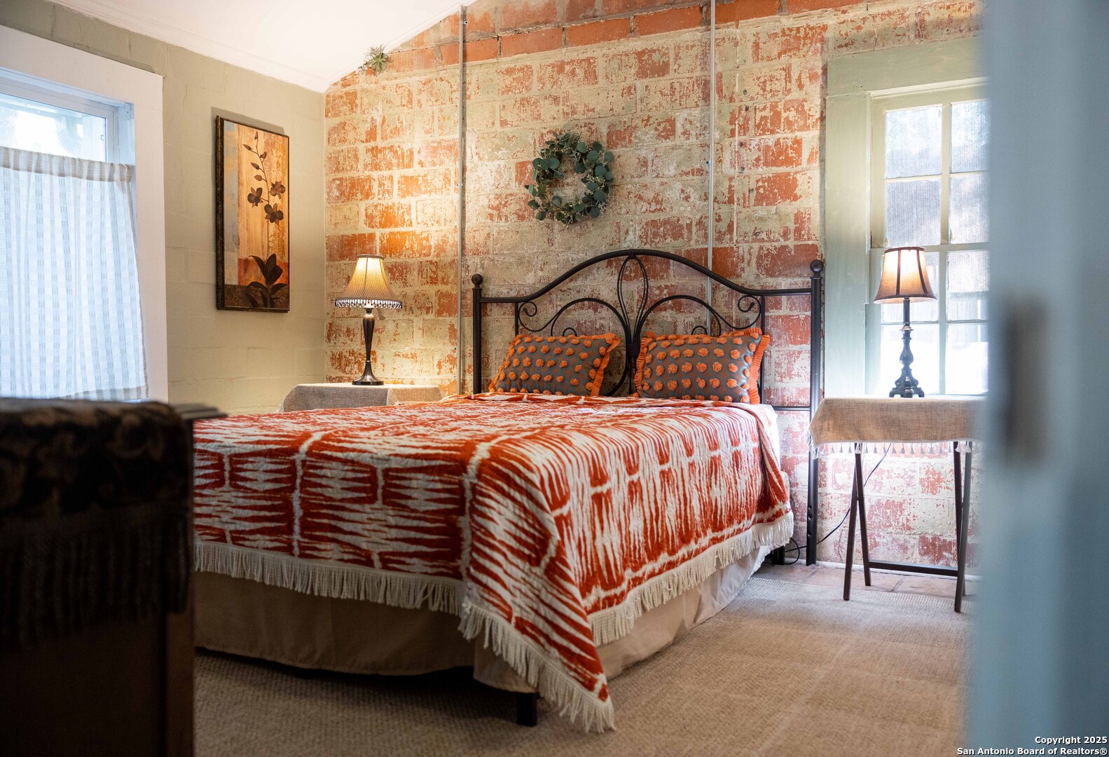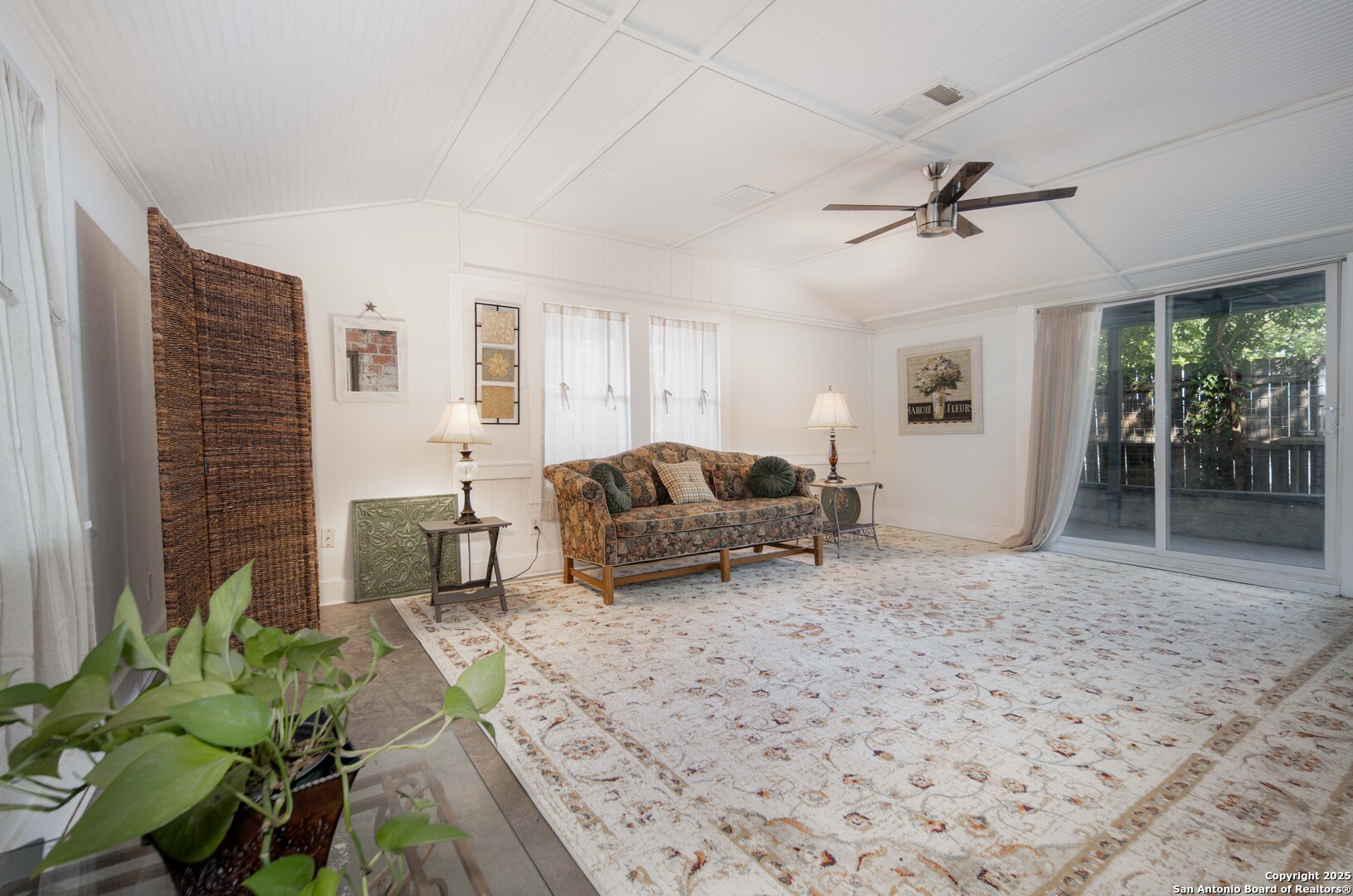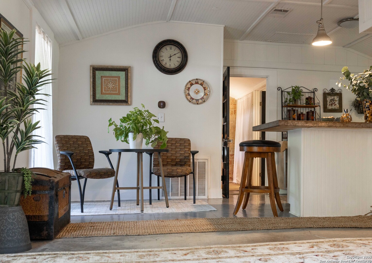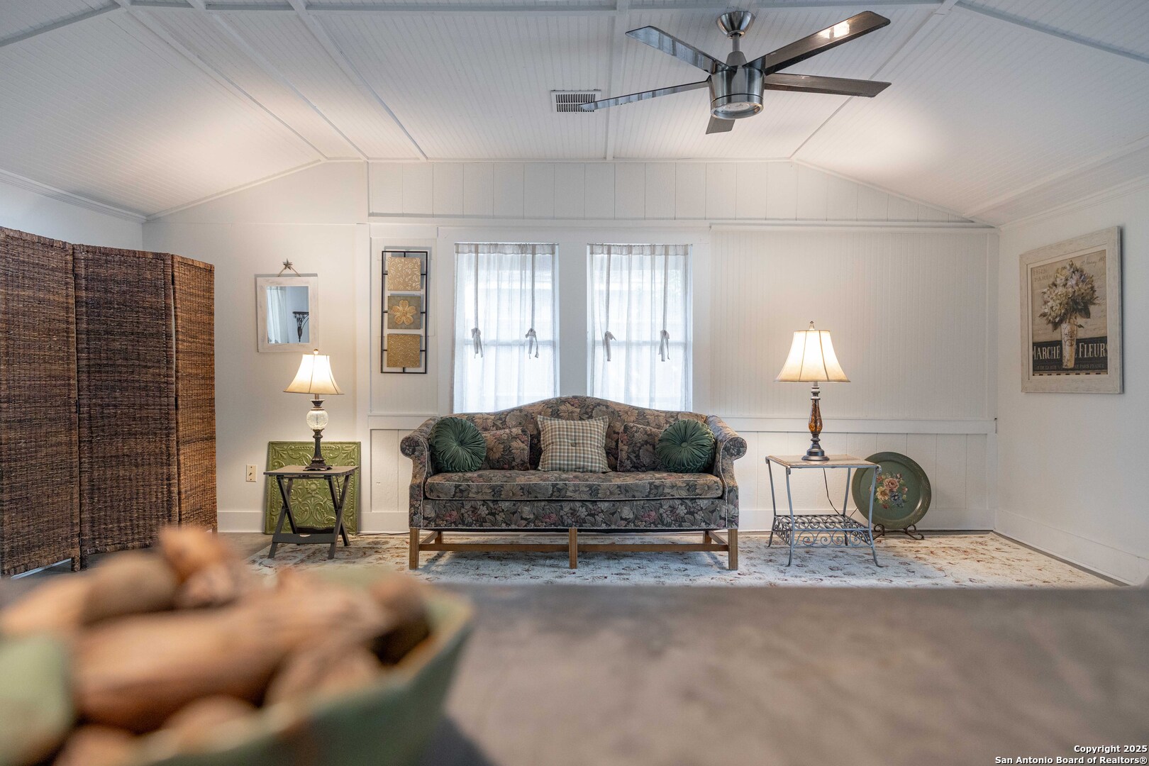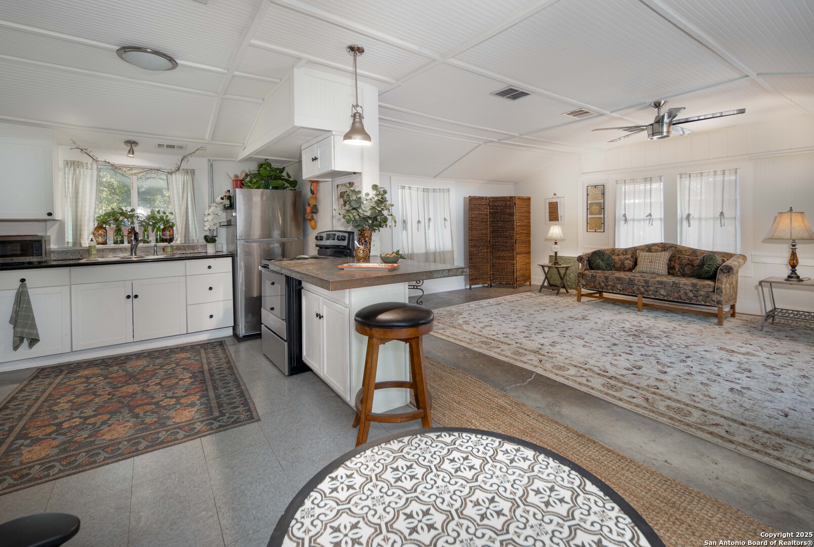 Located in the heart of New Braunfels, this quaint 1947 home has been made to provide a cozy retreat with simplicity and privacy. Tucked back amongst Native Pecans and mature shade trees, this 1 bedroom, 1 bath home is teeming with character and privacy. Exposed brick walls, Saltillo tile, and beaded-ceilings are some of the features which adorn this charming New Braunfels bungalow. Including appliances such as microwave, stove, and nearly-new stainless refrigerator, this house is ready to call home. A small, yet inviting space which is easily maintained and boasts low utility costs. Concrete-countertop peninsula offers an open floor plan with clear view of the living, dining, and kitchen. More than 450 sq. ft. of wraparound porch and patio. Oversized 1- car garage, pecan-producing trees, and easy-access to rivers, schools, shopping and dining. Situated near the back of the lot, this property may also be IDEAL for anyone looking to build a new home, while enjoying the existing home as a guest suite, office space, or perhaps an artistic oasis. A rare opportunity at this price point. Whether it's a night-in, or enjoying cool evenings on the expansive porch and patio, this spot truly embraces the New Braunfels lifestyle.