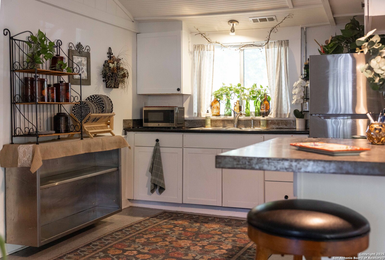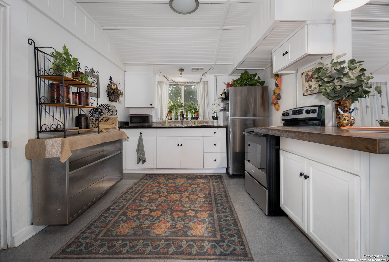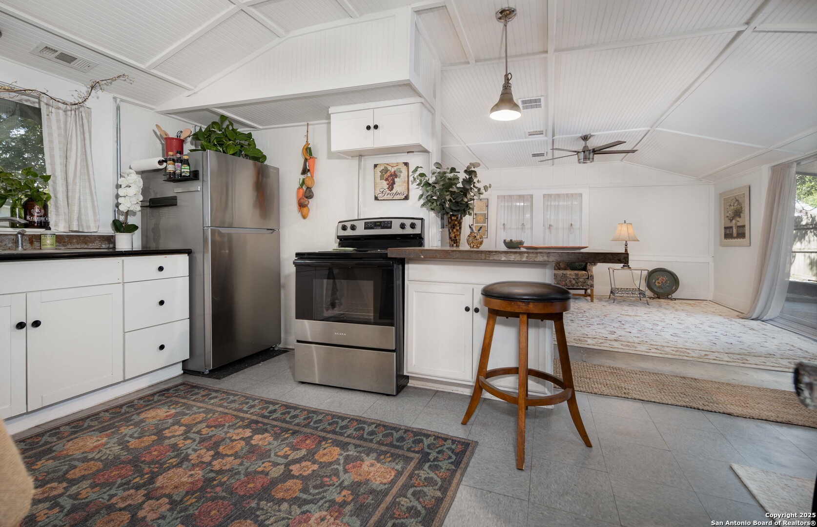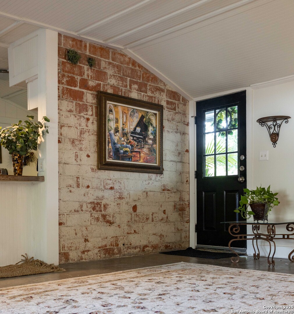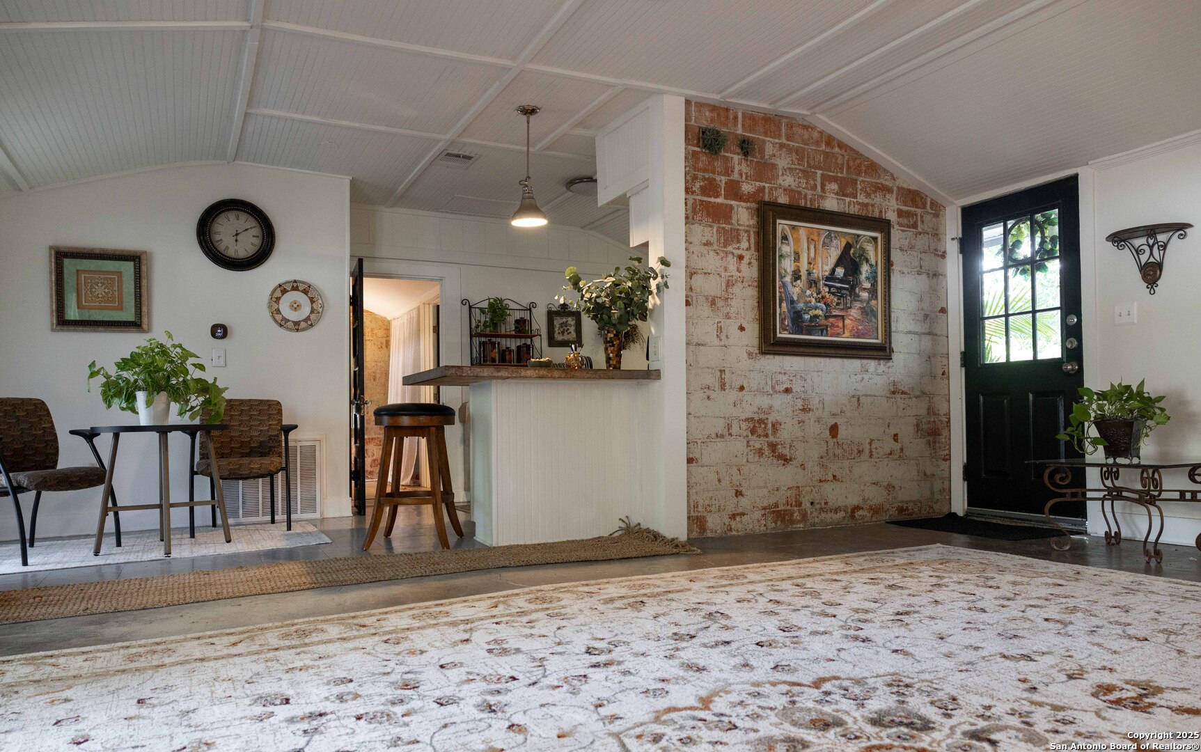 Located in the heart of New Braunfels, this quaint 1947 home has been made to provide a cozy retreat with simplicity and privacy. Tucked back amongst Native Pecans and mature shade trees, this 1 bedroom, 1 bath home is teeming with character and privacy. Exposed brick walls, Saltillo tile, and beaded-ceilings are some of the features which adorn this charming New Braunfels bungalow. Including appliances such as microwave, stove, and nearly-new stainless refrigerator, this house is ready to call home. A small, yet inviting space which is easily maintained and boasts low utility costs. Concrete-countertop peninsula offers an open floor plan with clear view of the living, dining, and kitchen. More than 450 sq. ft. of wraparound porch and patio. Oversized 1- car garage, pecan-producing trees, and easy-access to rivers, schools, shopping and dining. Situated near the back of the lot, this property may also be IDEAL for anyone looking to build a new home, while enjoying the existing home as a guest suite, office space, or perhaps an artistic oasis. A rare opportunity at this price point. Whether it's a night-in, or enjoying cool evenings on the expansive porch and patio, this spot truly embraces the New Braunfels lifestyle.