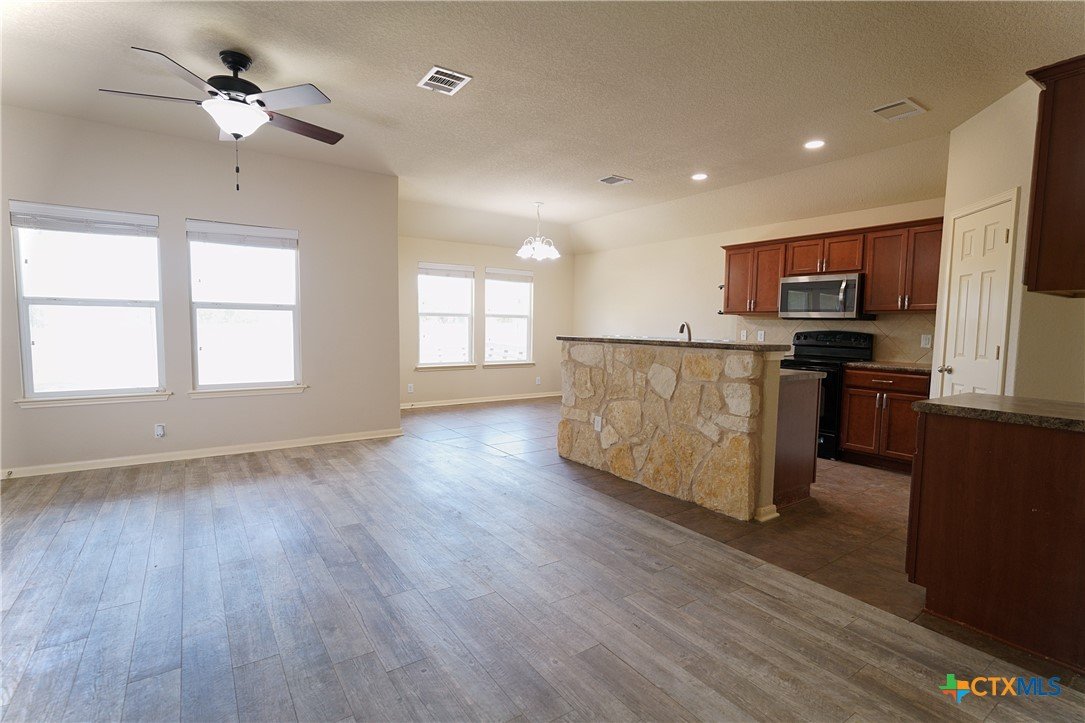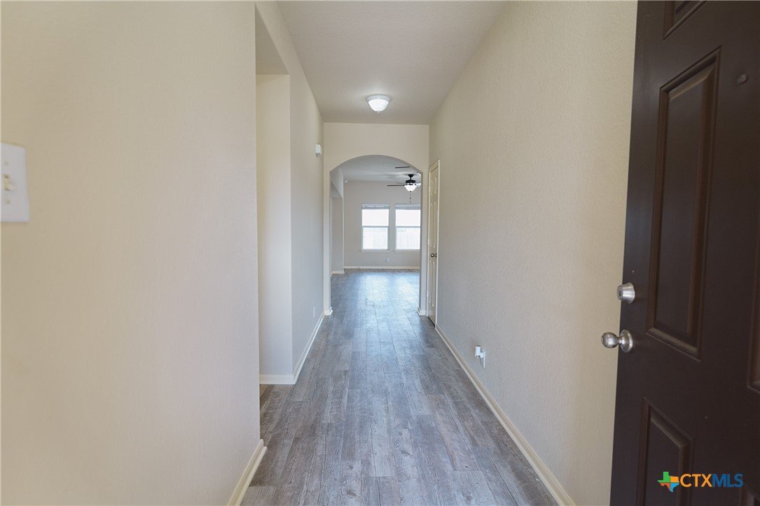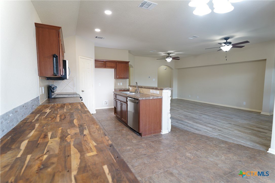 Welcome to 115 Encina Cove! This beautifully upgraded 3 bed 2 bath home awaits it's next family to enjoy beautiful San Marcos Texas. Ceramic wood-look tile greets you and runs throughout the entry hall, flowing into the spacious and open living area. 16 inch ceramic tile adorns the spacious open kitchen with a massive 8 foot butcher block countertop addition to make your cooking dreams come to life. The attached dining area is also open to the living to give you plenty of space for entertaining your many guests who will indeed be visiting. The large primary bedroom has been upgraded to Australian Cypress LVP and connects to it's private double vanity bathroom and oversized closet, all separate from the 2 additional bedrooms at the front of the home. The covered patio gives you shade and tranquility as you walk onto the house wide deck adorned with built in seating and lighting for your place to BBQ and converse all throughout the year. The oversized backyard includes 3 gardens with pavestones laid throughout, as well as 550 gallons of water collection tanks attached to the gutter system to provide year round water for your gardening endeavors. The new roof and new interior paint are ready for you to come and relax with peace of mind.
