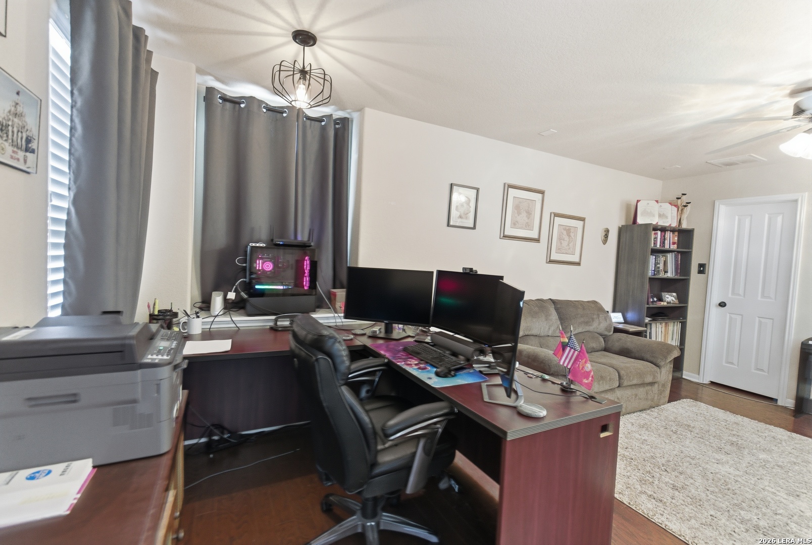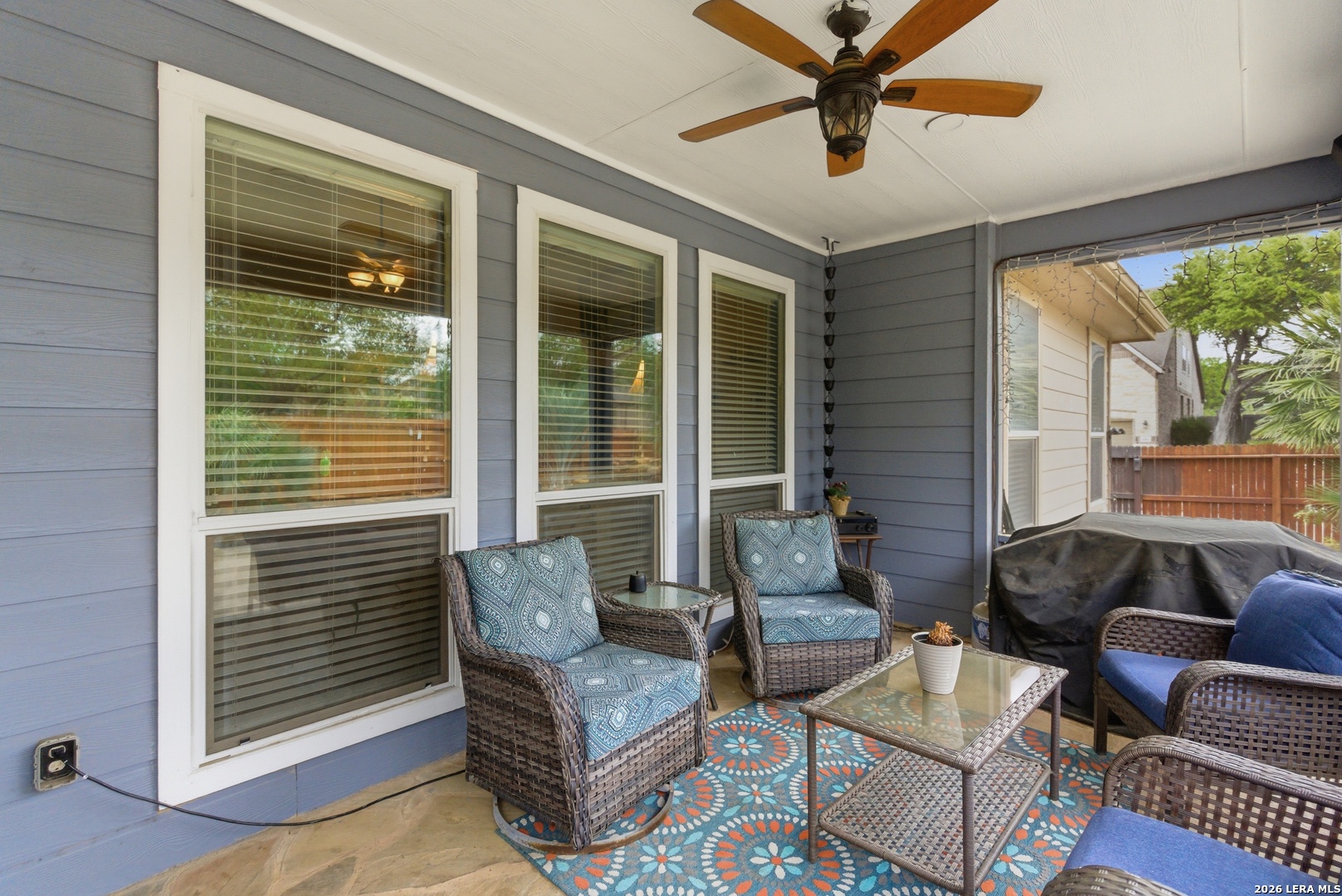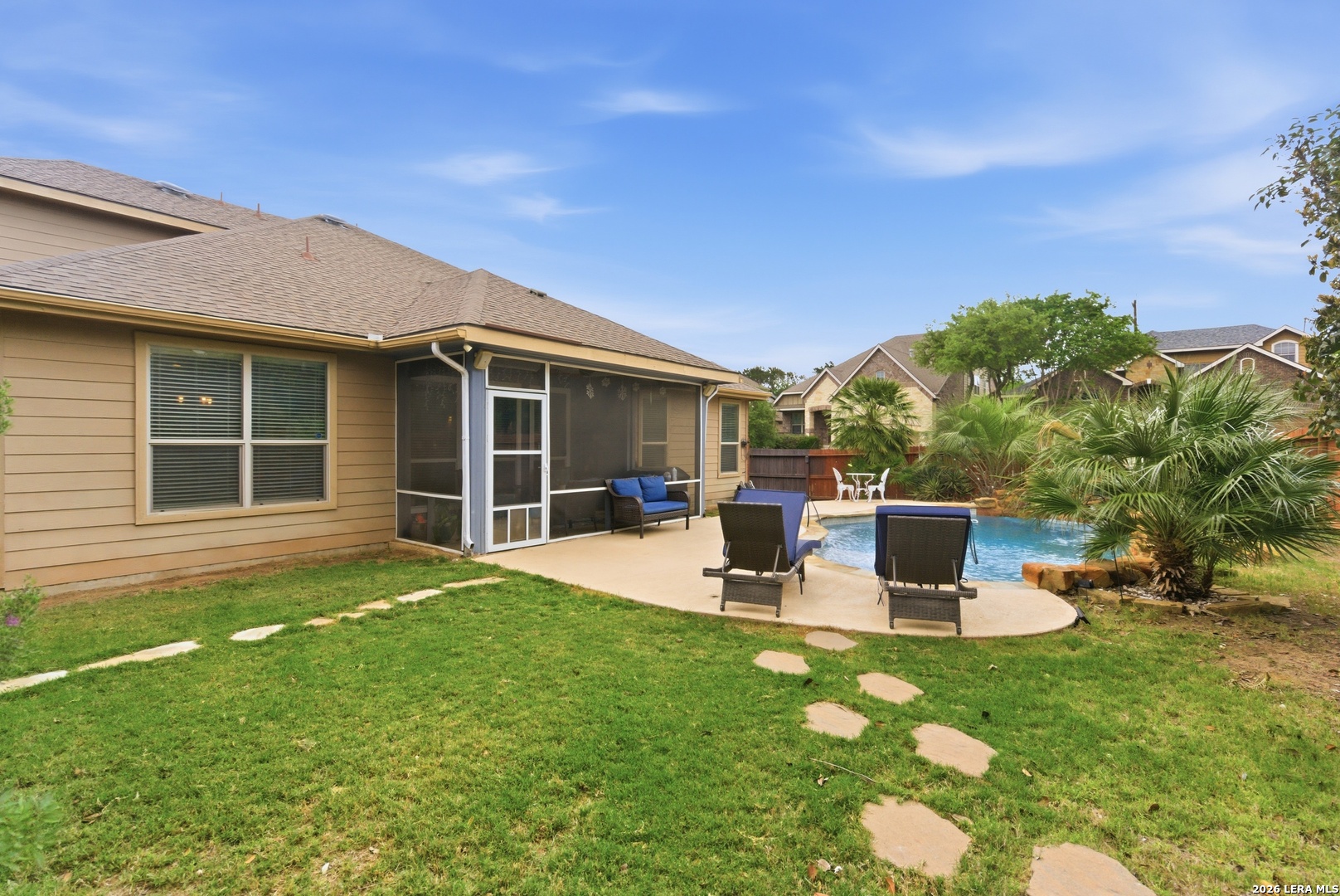 Welcome to this charming 1.5-story home nestled in the sought-after Santa Maria community of Alamo Ranch. Situated on a spacious corner lot with full fencing, the home offers eye-catching curb appeal with lush, well-maintained landscaping that welcomes you the moment you arrive. Inside, you'll find a thoughtfully designed layout featuring a gourmet kitchen with gas cooking, granite countertops, and a blend of wood and tile flooring throughout (carpet only on the stairs). A generous walk-in pantry with a built-in laundry folding area adds both convenience and functionality. Step outside to your own private retreat-an inviting covered patio overlooks a beautifully landscaped backyard complete with a sparkling pool and relaxing waterfall feature, perfect for entertaining or unwinding after a long day. The two-car garage provides flexible space for a home gym, workshop, or extra storage. Ideally located with quick access to shopping, dining, and everyday conveniences, this home offers comfort, style, and convenience all in one. Don't miss the opportunity to make it yours-schedule your showing today!