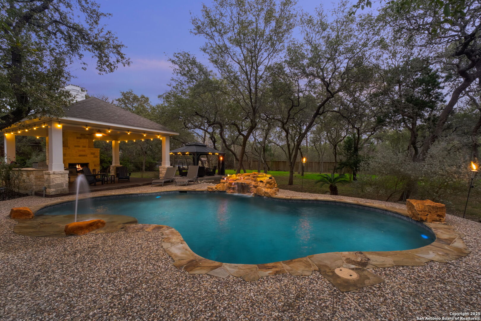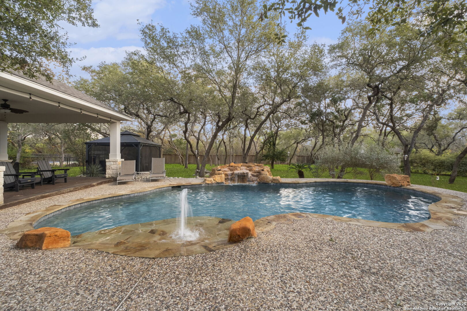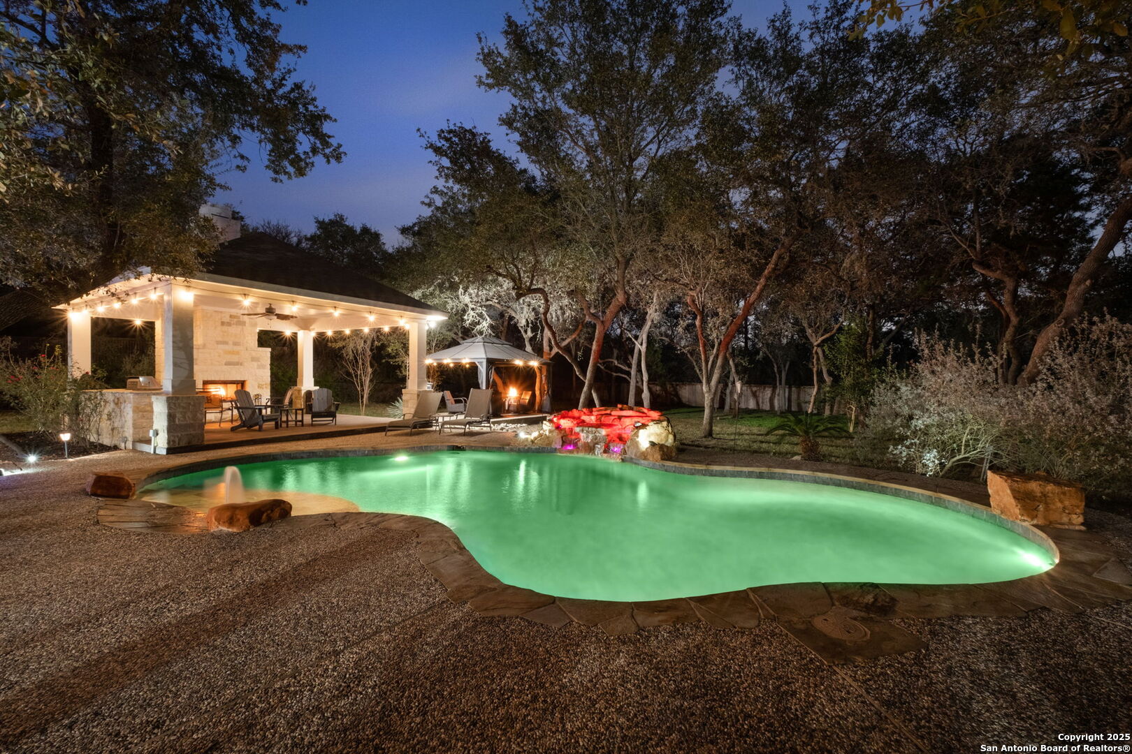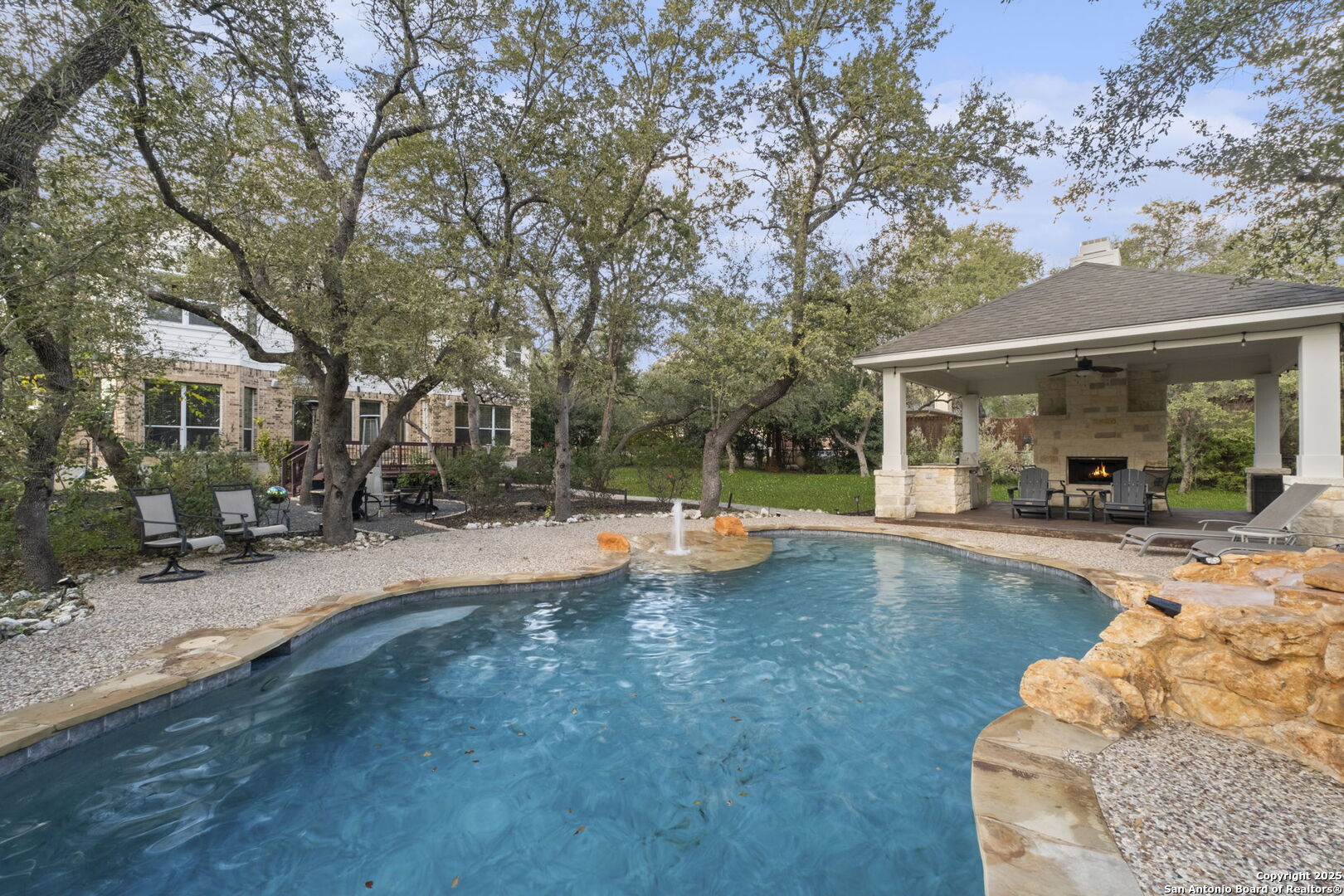This exceptional property offers a perfect blend of indoor elegance and outdoor living, nestled on a sprawling 0.83-acre lot that backs up to a greenbelt. Boasting an array of premium features, this home is ideal for entertaining, relaxing, and creating lasting memories. The interior features include an open-concept design with spacious and inviting art niches and a wrap-around catwalk. The gourmet kitchen with a huge island, double oven, and plenty of room for entertaining seamlessly transitions into a voluminous open living room. The expansive living area offers a cozy wood-burning fireplace creating a warm and inviting atmosphere. Adjacent to the living spaces, is a dedicated office space and a separate formal dining room. The primary suite on the main floor is conveniently located with privacy and comfort, complete with a relaxing jetted garden tub, separate shower, double vanities, and a generously sized walk-in closet offering ample storage space. The three secondary bedrooms are upstairs, two of which share a Jack and Jill bathroom with updated flooring. Upstairs also includes an expansive flex room currently used as a fitness center, and a media room equipped with cutting-edge Dolby Atmos surround sound. Additional features include 2 HVAC units equipped with AprilAire filtration systems, radiant barrier roofing, and a 3-car garage with a fully lined attic offering extra storage space, complete with convenient pull-down stairs. A major highlight of this home is the private outdoor paradise which features an in-ground pool, a recently refinished deck, a stone path leading to a smokeless fire pit, two covered outdoor sitting areas, and ample remaining space to play with dogs, throw a ball, or even construct a pickleball court. One of the covered outdoor spaces is a kitchen with built-in grill, refrigerator, ice chest and fireplace. It is a great place to relax, adjacent to the shimmering pool, complete with a serene waterfall that adds a soothing touch to your experience. The second covered outdoor space, a screened gazebo, is another perfect retreat for a quiet outdoor living. Wired and programmable pathway lighting enhances the charm of this backyard playground. The home also has a full sprinkler system and an efficient aerobic septic system. Don't miss out on this one-of-a-kind home! Schedule your private tour and experience this extraordinary property firsthand.