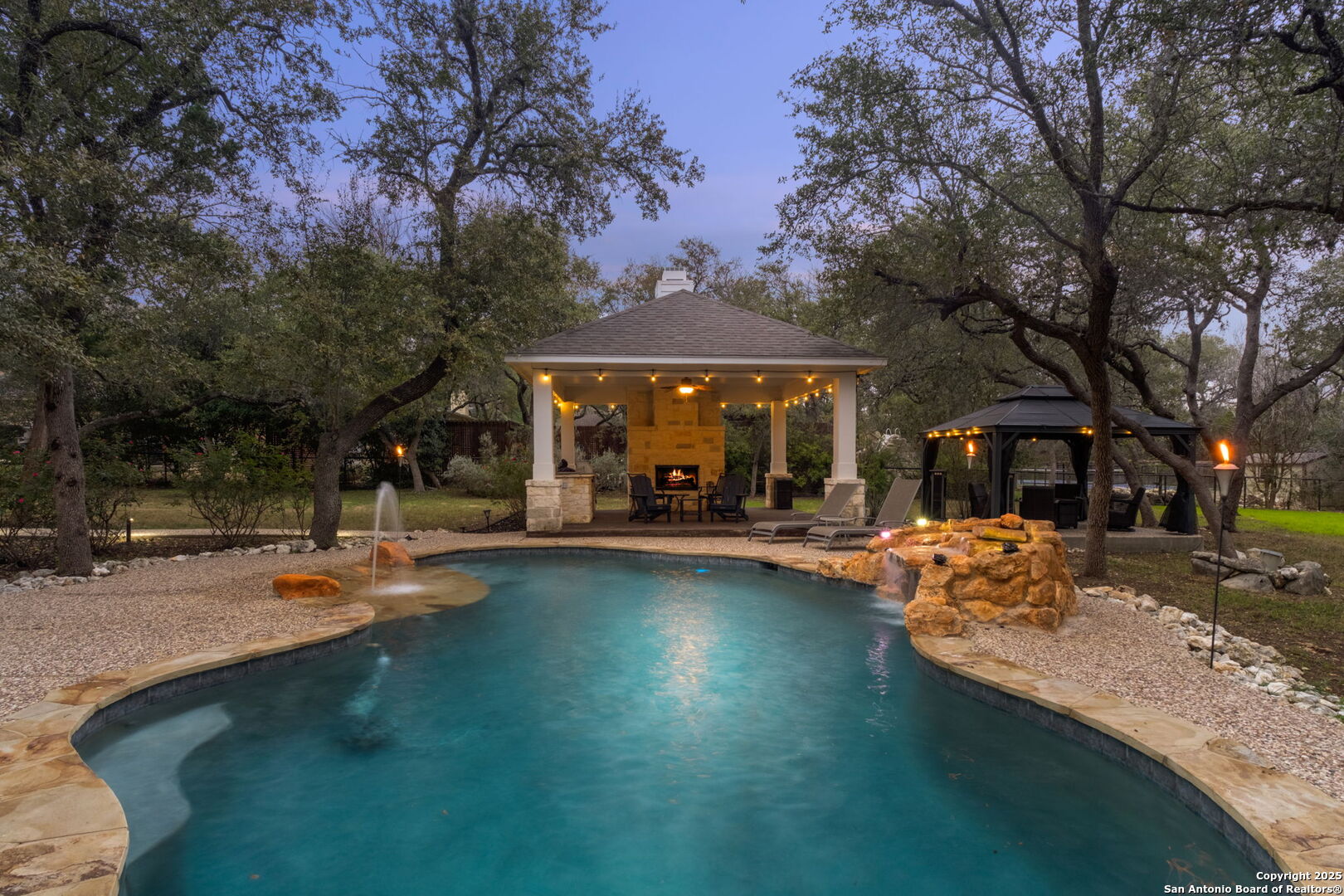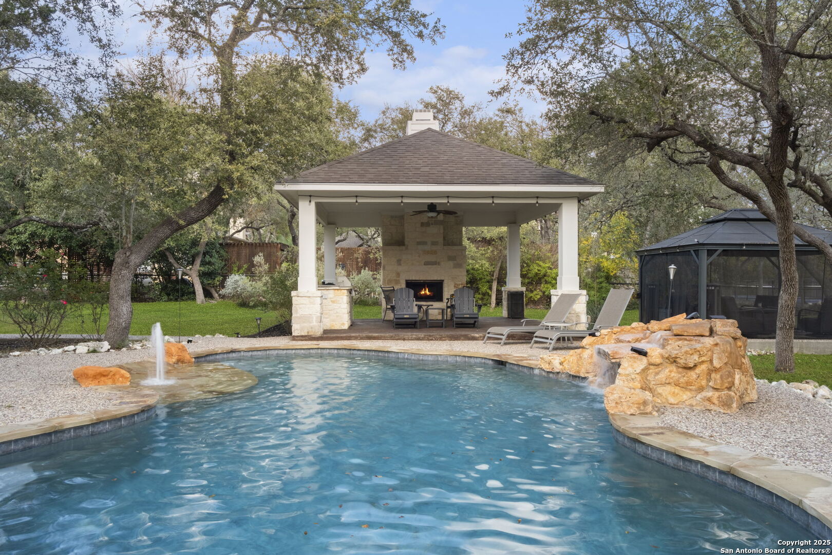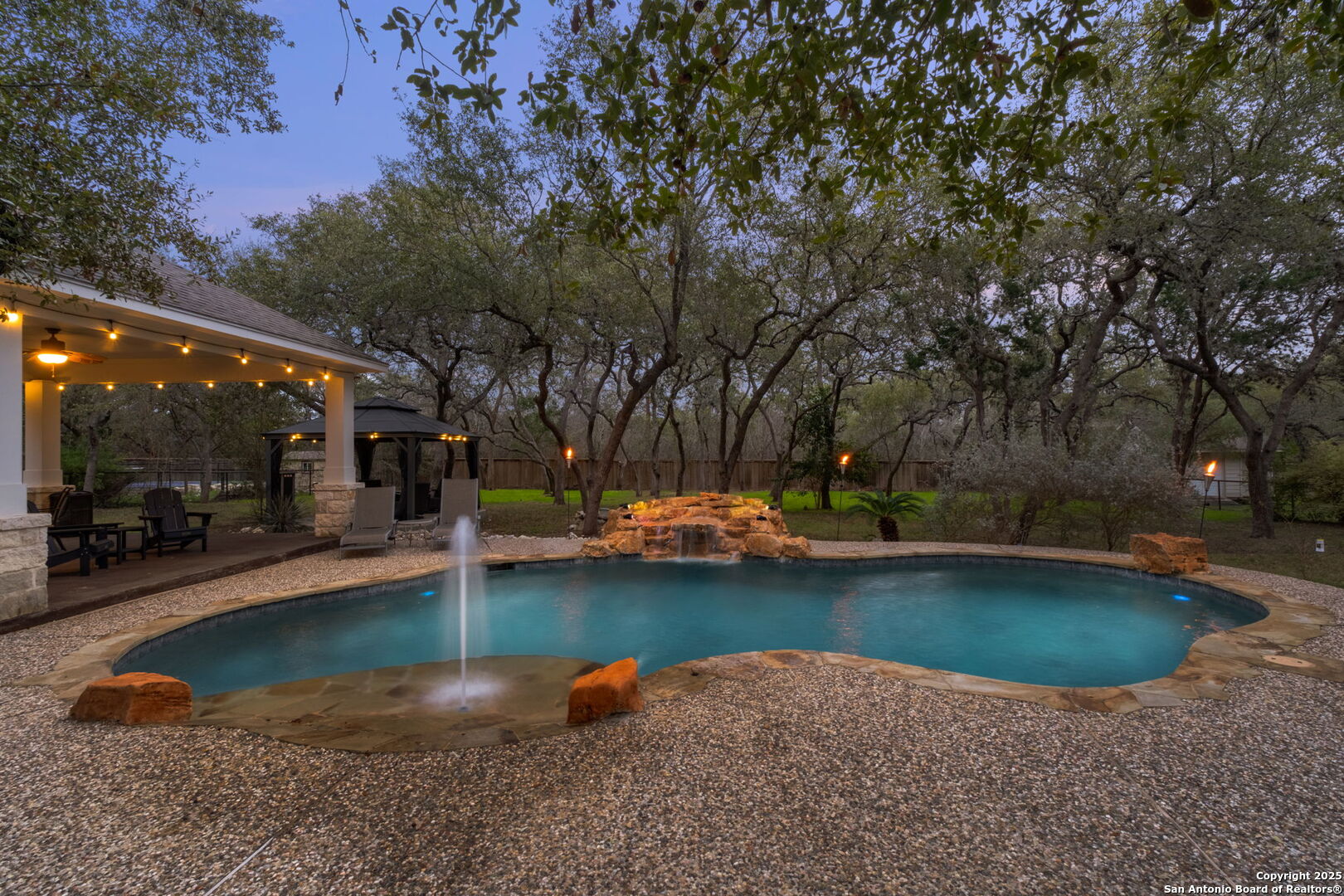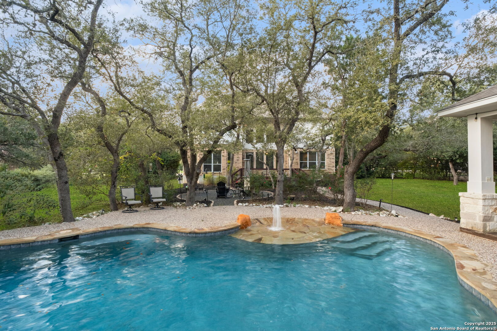 This exceptional property offers a perfect blend of indoor elegance and outdoor living, nestled on a sprawling 0.83-acre lot that backs up to a greenbelt. Boasting an array of premium features, this home is ideal for entertaining, relaxing, and creating lasting memories. The interior features include an open-concept design with spacious and inviting art niches and a wrap-around catwalk. The gourmet kitchen with a huge island, double oven, and plenty of room for entertaining seamlessly transitions into a voluminous open living room. The expansive living area offers a cozy wood-burning fireplace creating a warm and inviting atmosphere. Adjacent to the living spaces, is a dedicated office space and a separate formal dining room. The primary suite on the main floor is conveniently located with privacy and comfort, complete with a relaxing jetted garden tub, separate shower, double vanities, and a generously sized walk-in closet offering ample storage space. The three secondary bedrooms are upstairs, two of which share a Jack and Jill bathroom with updated flooring. Upstairs also includes an expansive flex room currently used as a fitness center, and a media room equipped with cutting-edge Dolby Atmos surround sound. Additional features include 2 HVAC units equipped with AprilAire filtration systems, radiant barrier roofing, and a 3-car garage with a fully lined attic offering extra storage space, complete with convenient pull-down stairs. A major highlight of this home is the private outdoor paradise which features an in-ground pool, a recently refinished deck, a stone path leading to a smokeless fire pit, two covered outdoor sitting areas, and ample remaining space to play with dogs, throw a ball, or even construct a pickleball court. One of the covered outdoor spaces is a kitchen with built-in grill, refrigerator, ice chest and fireplace. It is a great place to relax, adjacent to the shimmering pool, complete with a serene waterfall that adds a soothing touch to your experience. The second covered outdoor space, a screened gazebo, is another perfect retreat for a quiet outdoor living. Wired and programmable pathway lighting enhances the charm of this backyard playground. The home also has a full sprinkler system and an efficient aerobic septic system. Don't miss out on this one-of-a-kind home! Schedule your private tour and experience this extraordinary property firsthand.