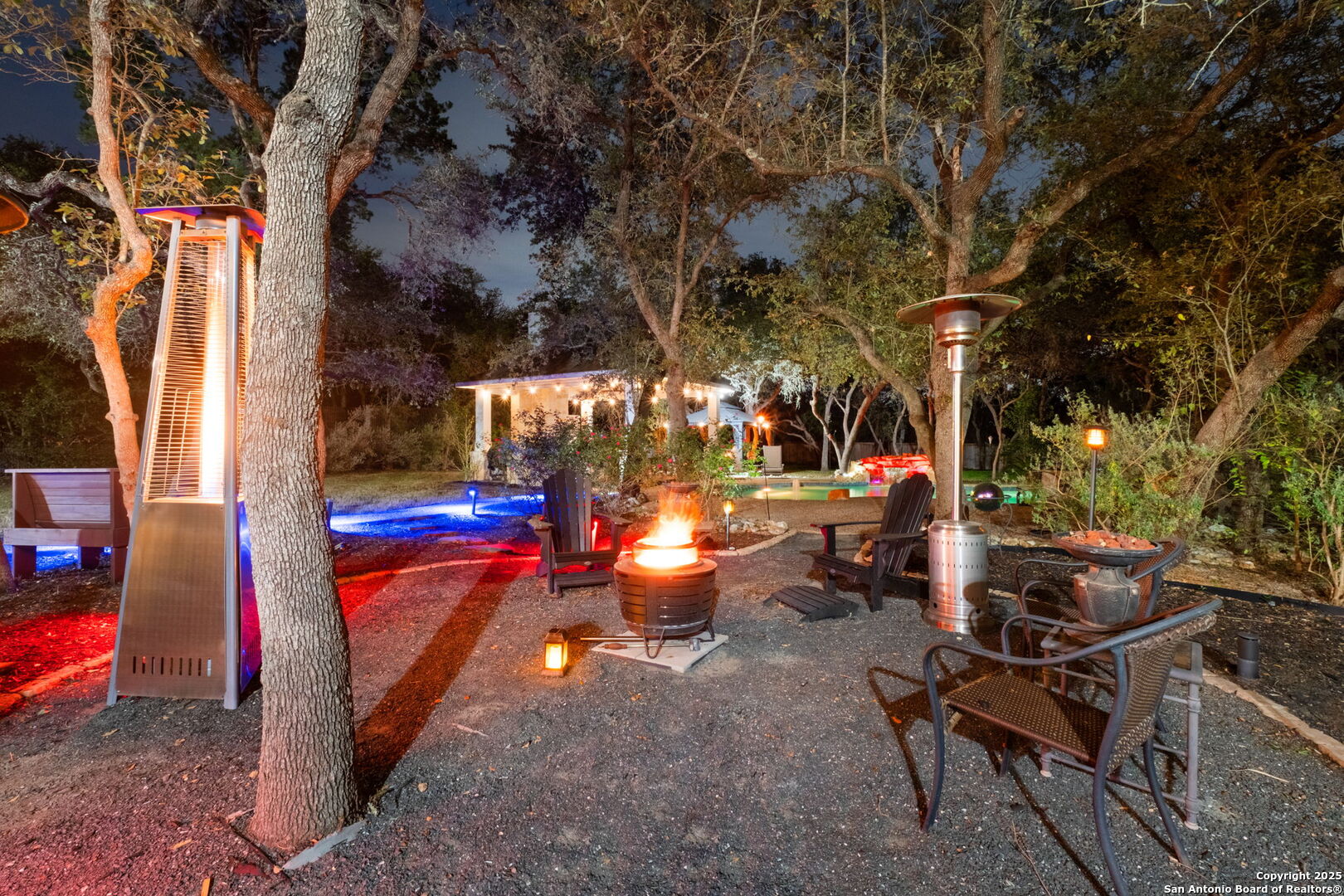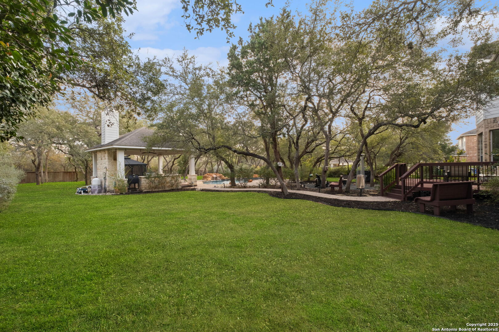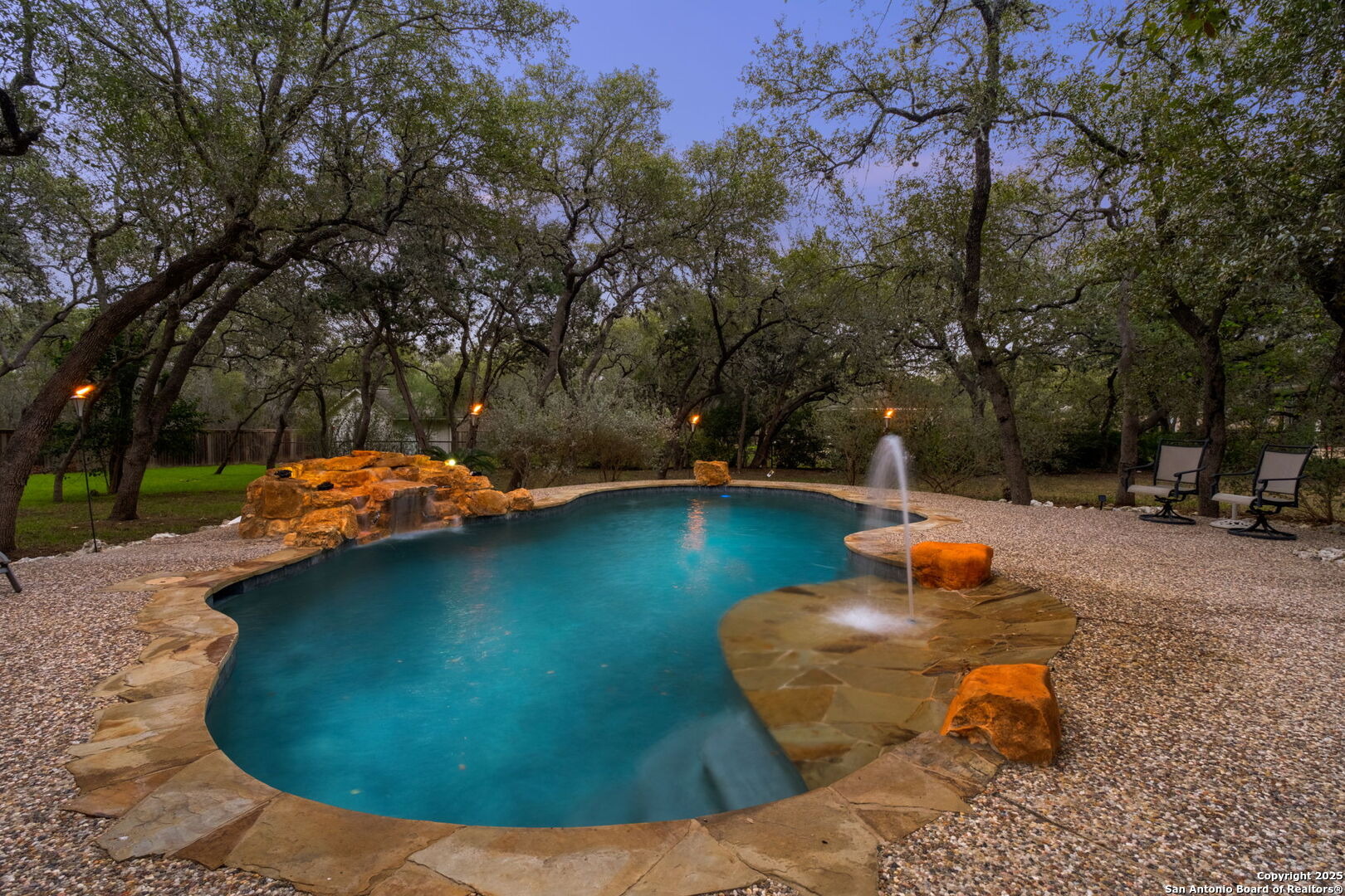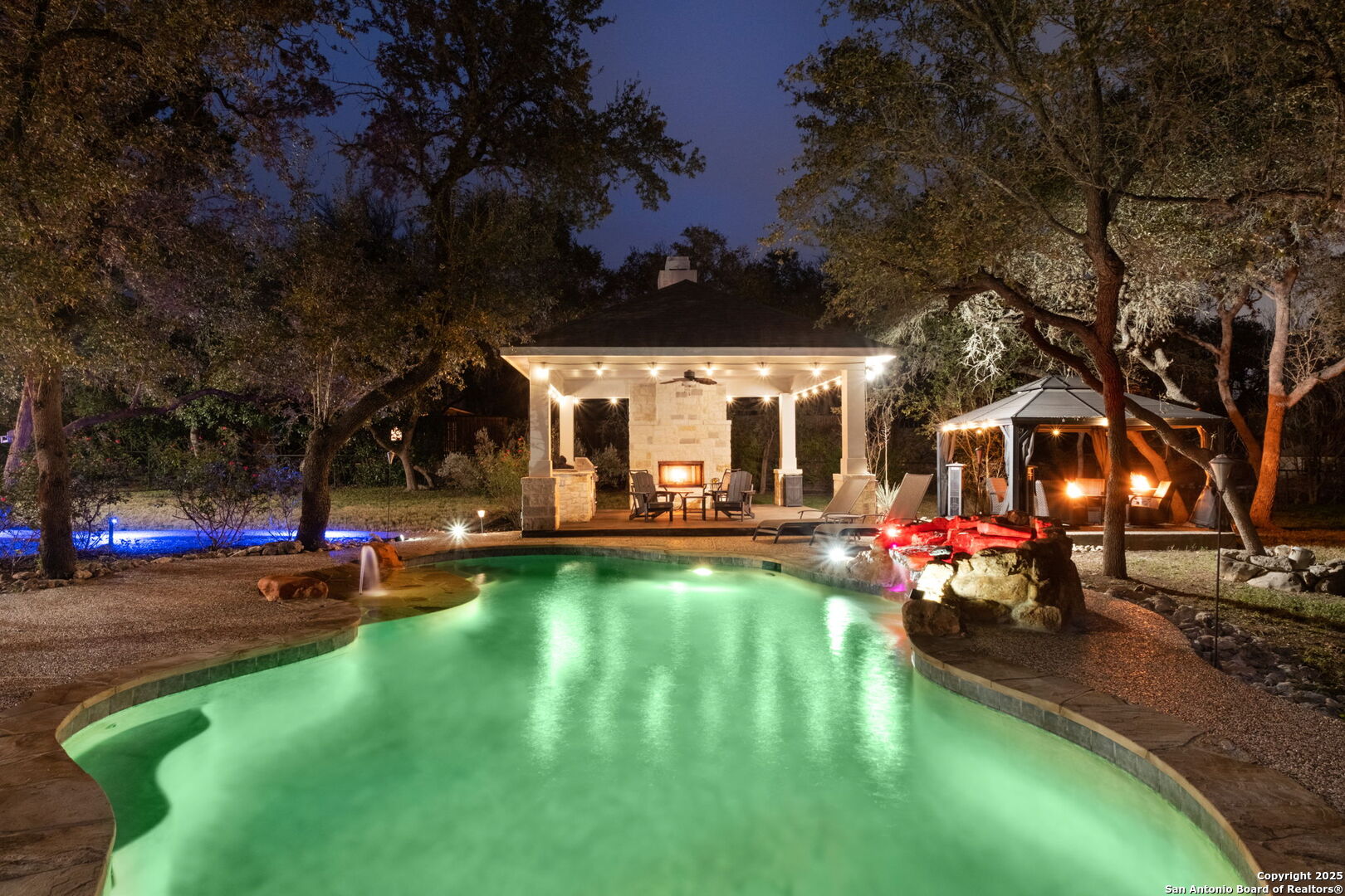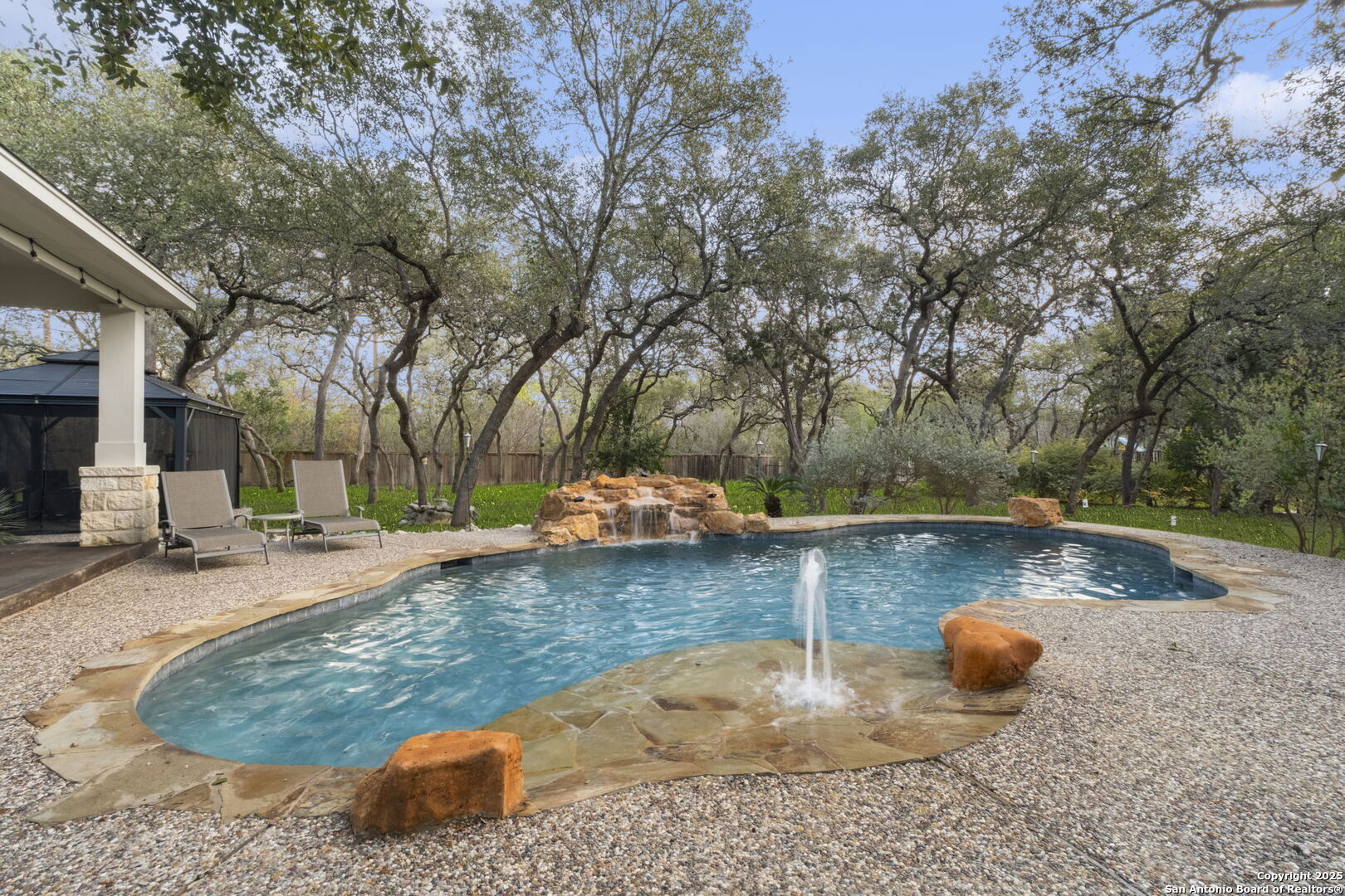 This exceptional property offers a perfect blend of indoor elegance and outdoor living, nestled on a sprawling 0.83-acre lot that backs up to a greenbelt. Boasting an array of premium features, this home is ideal for entertaining, relaxing, and creating lasting memories. The interior features include an open-concept design with spacious and inviting art niches and a wrap-around catwalk. The gourmet kitchen with a huge island, double oven, and plenty of room for entertaining seamlessly transitions into a voluminous open living room. The expansive living area offers a cozy wood-burning fireplace creating a warm and inviting atmosphere. Adjacent to the living spaces, is a dedicated office space and a separate formal dining room. The primary suite on the main floor is conveniently located with privacy and comfort, complete with a relaxing jetted garden tub, separate shower, double vanities, and a generously sized walk-in closet offering ample storage space. The three secondary bedrooms are upstairs, two of which share a Jack and Jill bathroom with updated flooring. Upstairs also includes an expansive flex room currently used as a fitness center, and a media room equipped with cutting-edge Dolby Atmos surround sound. Additional features include 2 HVAC units equipped with AprilAire filtration systems, radiant barrier roofing, and a 3-car garage with a fully lined attic offering extra storage space, complete with convenient pull-down stairs. A major highlight of this home is the private outdoor paradise which features an in-ground pool, a recently refinished deck, a stone path leading to a smokeless fire pit, two covered outdoor sitting areas, and ample remaining space to play with dogs, throw a ball, or even construct a pickleball court. One of the covered outdoor spaces is a kitchen with built-in grill, refrigerator, ice chest and fireplace. It is a great place to relax, adjacent to the shimmering pool, complete with a serene waterfall that adds a soothing touch to your experience. The second covered outdoor space, a screened gazebo, is another perfect retreat for a quiet outdoor living. Wired and programmable pathway lighting enhances the charm of this backyard playground. The home also has a full sprinkler system and an efficient aerobic septic system. Don't miss out on this one-of-a-kind home! Schedule your private tour and experience this extraordinary property firsthand.