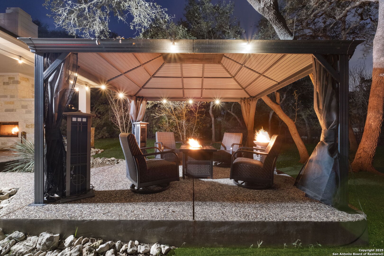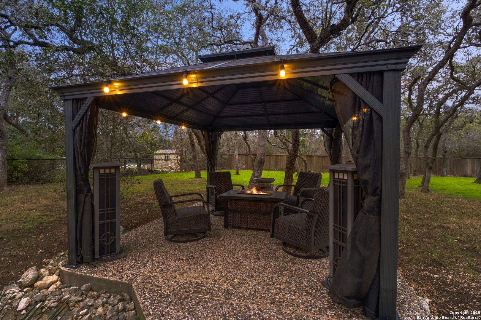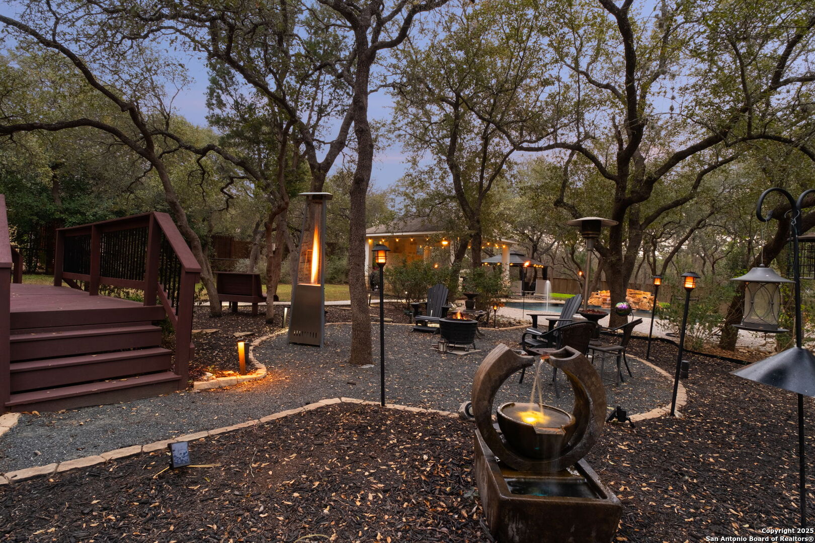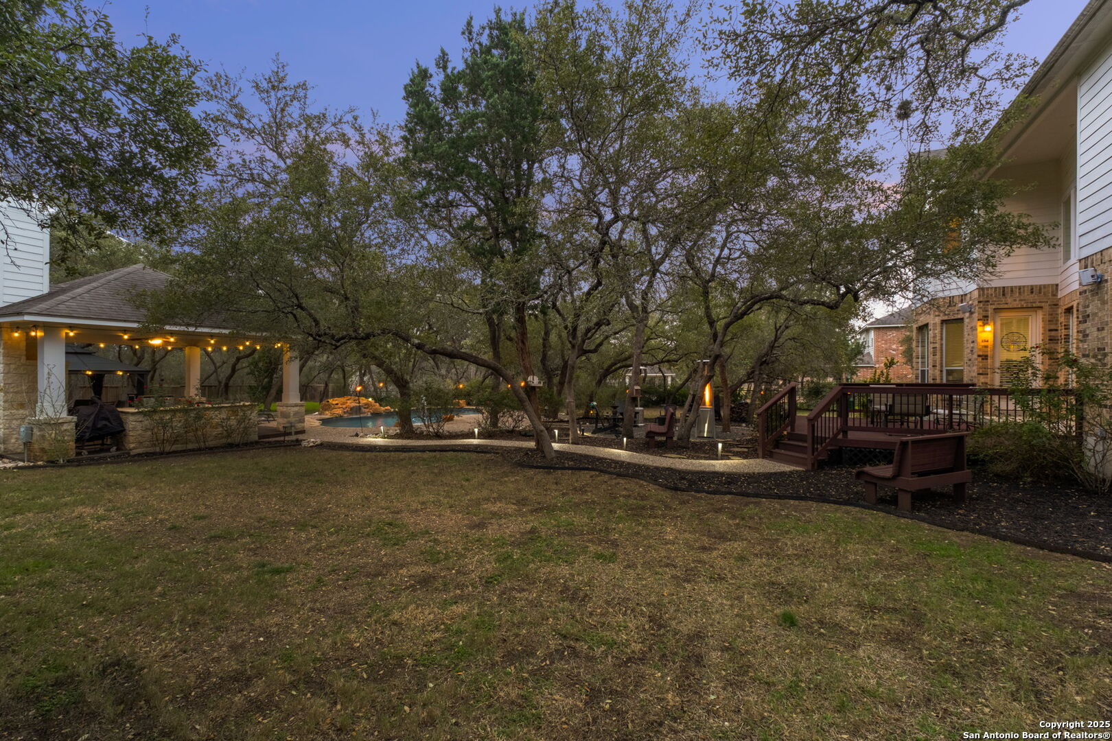 This exceptional property offers a perfect blend of indoor elegance and outdoor living, nestled on a sprawling 0.83-acre lot that backs up to a greenbelt. Boasting an array of premium features, this home is ideal for entertaining, relaxing, and creating lasting memories. The interior features include an open-concept design with spacious and inviting art niches and a wrap-around catwalk. The gourmet kitchen with a huge island, double oven, and plenty of room for entertaining seamlessly transitions into a voluminous open living room. The expansive living area offers a cozy wood-burning fireplace creating a warm and inviting atmosphere. Adjacent to the living spaces, is a dedicated office space and a separate formal dining room. The primary suite on the main floor is conveniently located with privacy and comfort, complete with a relaxing jetted garden tub, separate shower, double vanities, and a generously sized walk-in closet offering ample storage space. The three secondary bedrooms are upstairs, two of which share a Jack and Jill bathroom with updated flooring. Upstairs also includes an expansive flex room currently used as a fitness center, and a media room equipped with cutting-edge Dolby Atmos surround sound. Additional features include 2 HVAC units equipped with AprilAire filtration systems, radiant barrier roofing, and a 3-car garage with a fully lined attic offering extra storage space, complete with convenient pull-down stairs. A major highlight of this home is the private outdoor paradise which features an in-ground pool, a recently refinished deck, a stone path leading to a smokeless fire pit, two covered outdoor sitting areas, and ample remaining space to play with dogs, throw a ball, or even construct a pickleball court. One of the covered outdoor spaces is a kitchen with built-in grill, refrigerator, ice chest and fireplace. It is a great place to relax, adjacent to the shimmering pool, complete with a serene waterfall that adds a soothing touch to your experience. The second covered outdoor space, a screened gazebo, is another perfect retreat for a quiet outdoor living. Wired and programmable pathway lighting enhances the charm of this backyard playground. The home also has a full sprinkler system and an efficient aerobic septic system. Don't miss out on this one-of-a-kind home! Schedule your private tour and experience this extraordinary property firsthand.