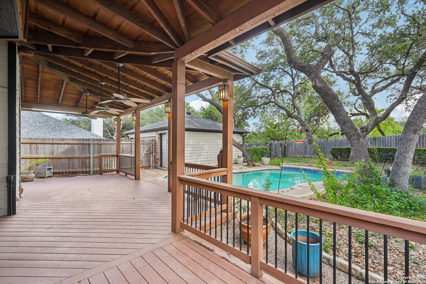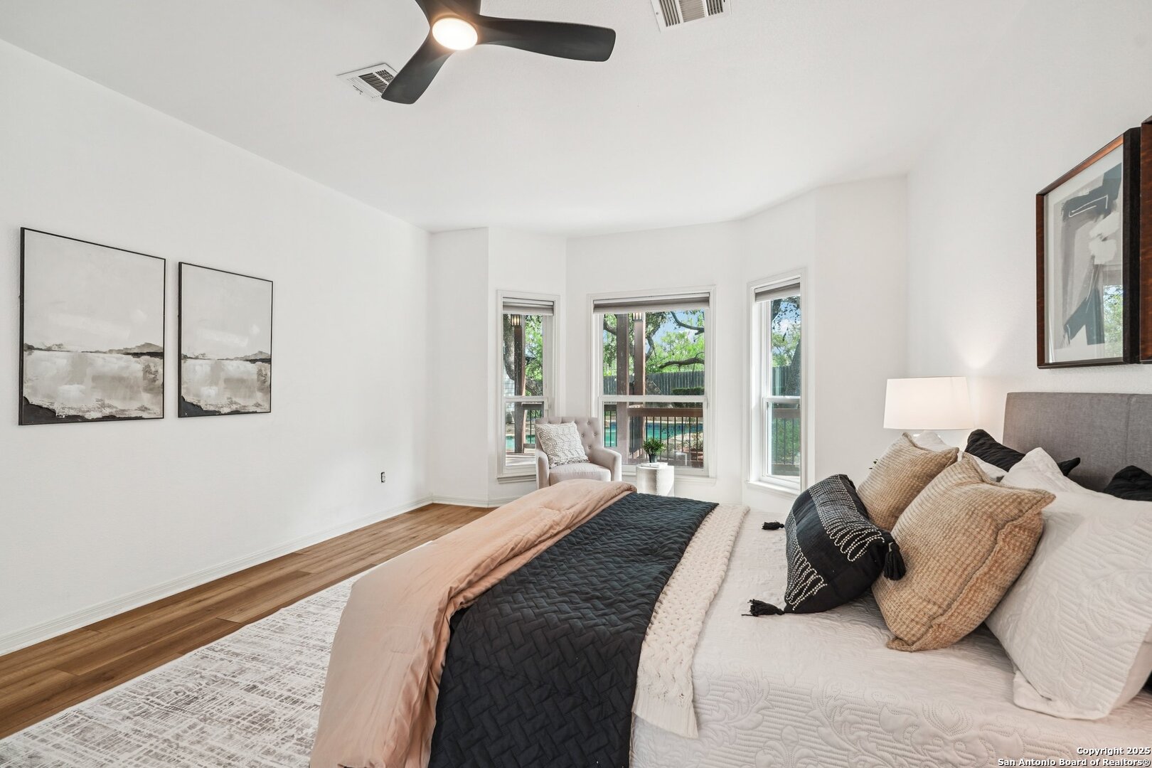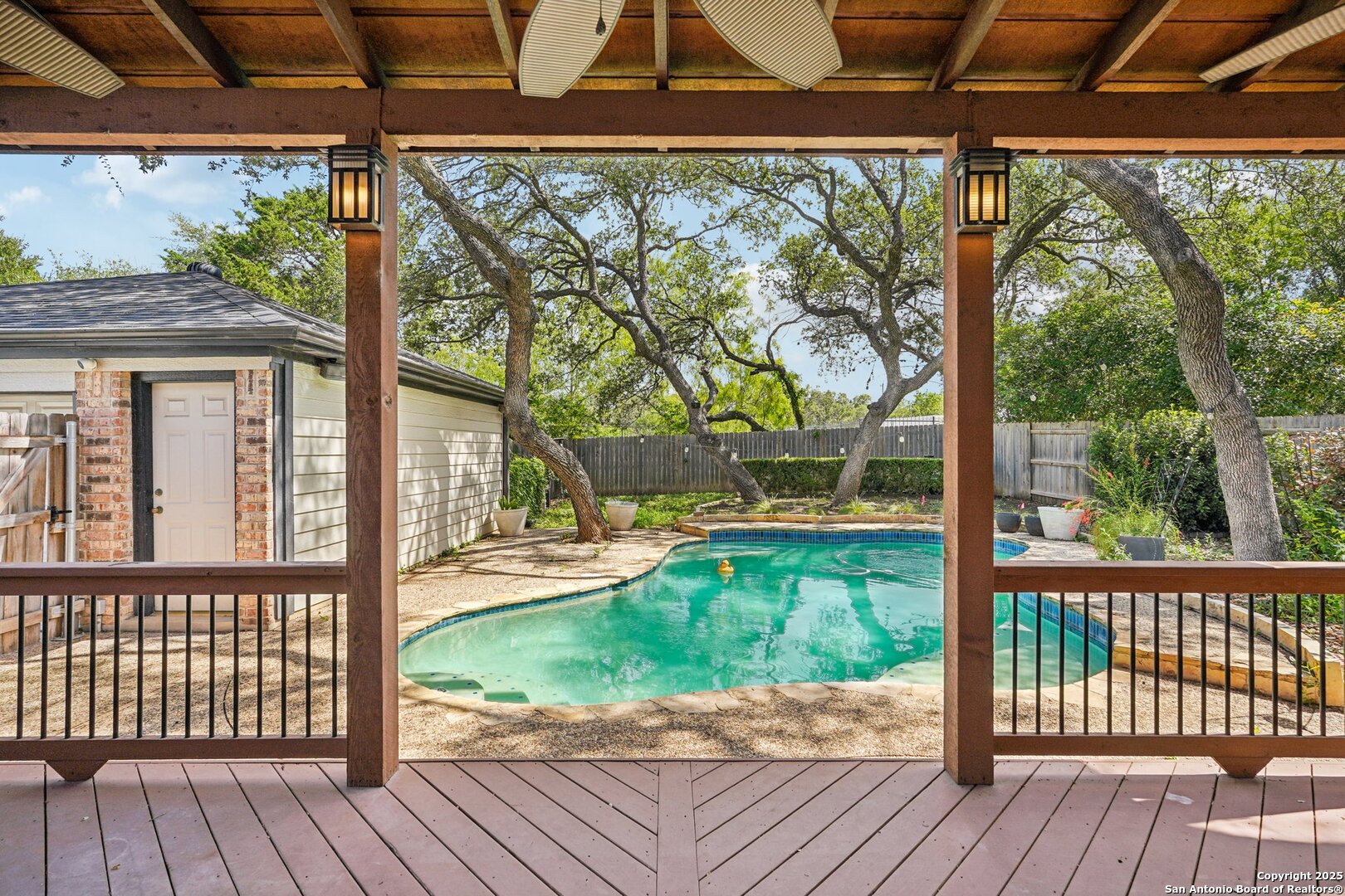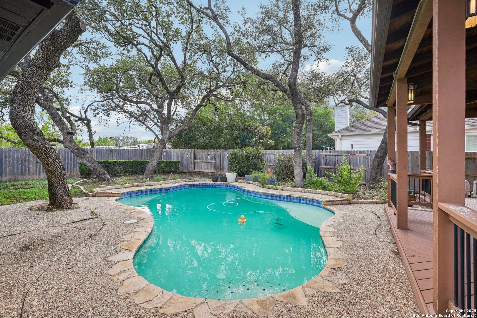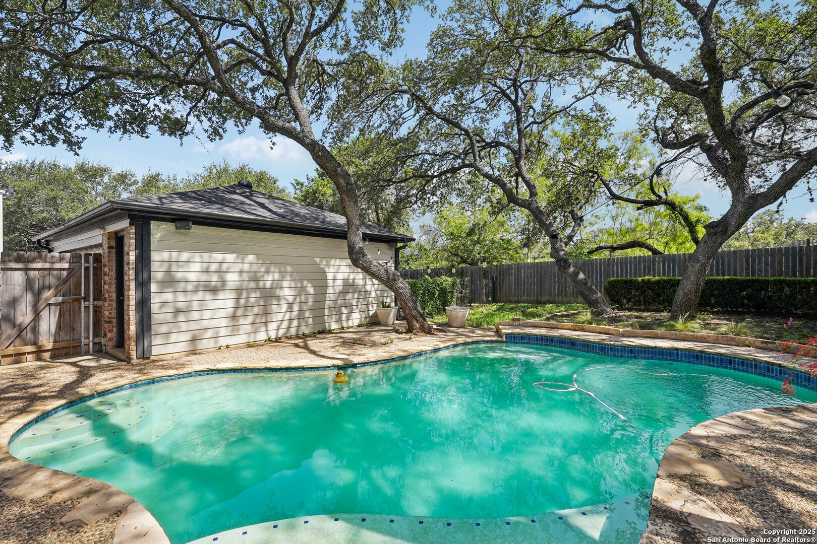 Welcome to this beautiful Pulte-built home located in the gated community of Blanco Bluffs. Ideally situated near fine dining, shopping, and top conveniences, this spacious 4-bedroom, 3.5-bath home also features a dedicated home office-perfect for remote work, study, or creative pursuits. Enjoy a private, oak-studded backyard with a sparkling Gary Pool and an oversized custom patio-ideal for entertaining or relaxing in a peaceful setting. The bright, chef-inspired kitchen includes a six-burner range and is filled with natural light throughout. The primary suite is located on the main floor, while the upstairs features a second living area with elegant wood flooring. With 3,417 sq ft of thoughtfully designed living space, this home offers comfort, versatility, and room for everyone. No carpet, highly rated Northeast schools, a 4 year old roof, completely updated windows that help with energy efficiency and a detached garage, this home is perfect for entertaining family and friends!