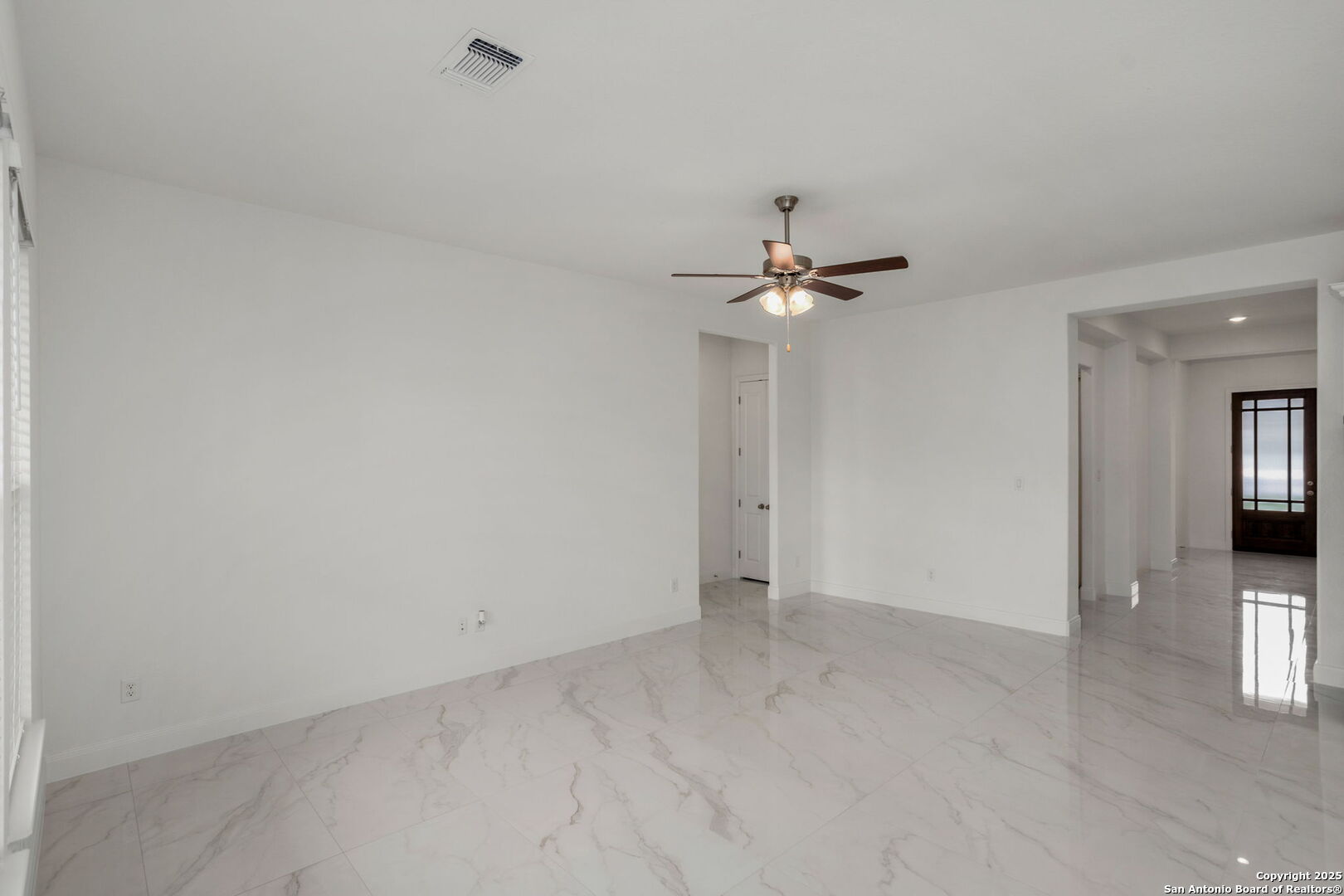 Fresh paint and floor tile throughout the house with immaculate landscaping make this charming home better than new. 10 ft ceilings and 8 ft doors throughout the home create a roomy and light filled space. A split floor plan creates a comfortable space for families of all sizes. The open kitchen, dining, and family room create a perfect space for family gatherings and entertaining. Upgrades include massive tile throughout the home, granite countertops, and stainless appliances. Primary bedroom features a large walk-in closet, double sinks, a separate tub, and shower, providing the ultimate retreat after a long day.