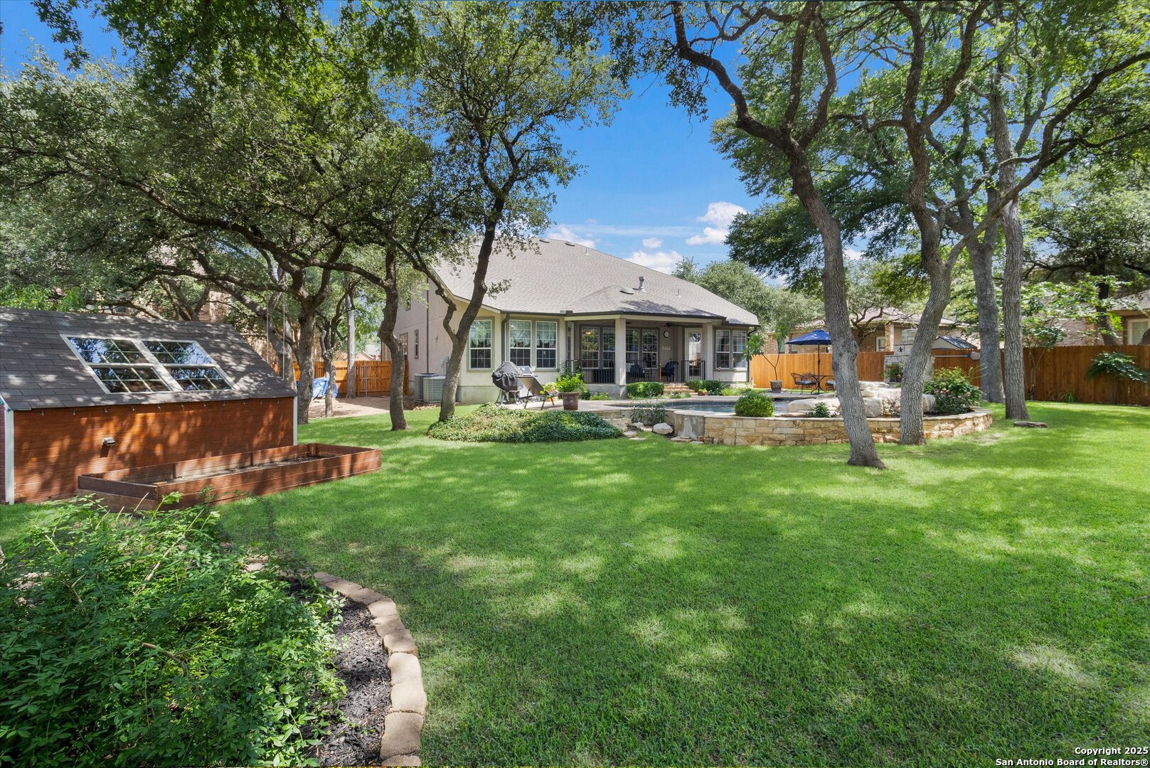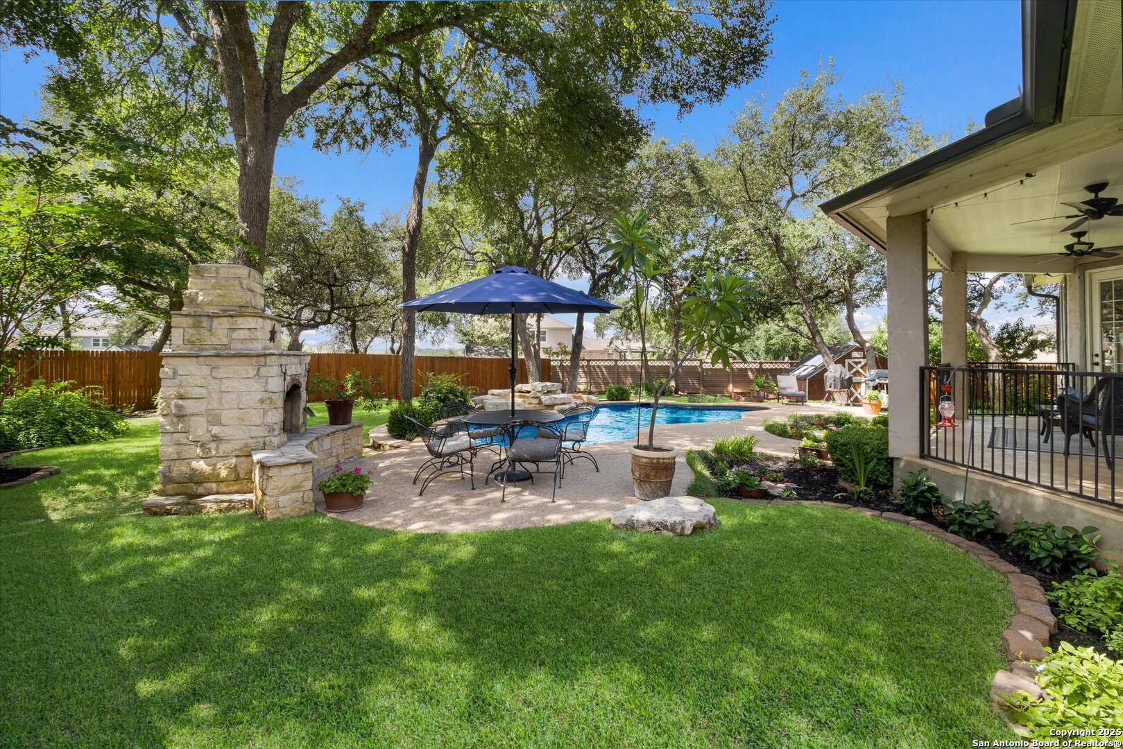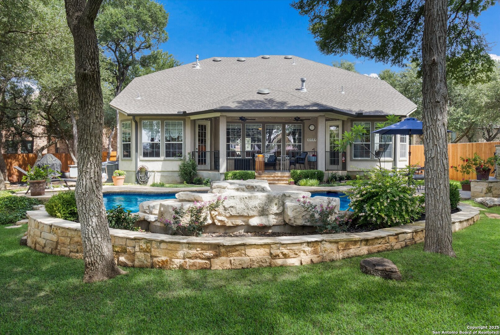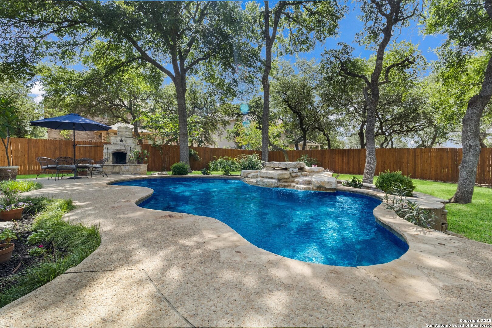 Welcome to a home that captivates from the moment you arrive, boasting charming curb appeal with its manicured lawn. Perfectly positioned on a quiet cul-de-sac just minutes from vibrant downtown Boerne, this beautifully upgraded residence offers the ultimate in comfort, charm, and convenience. Step inside this 4-bedroom, 3.5-bath home to discover a warm blend of hardwood and tile flooring flowing seamlessly into an open-concept living space. The thoughtfully upgraded kitchen features a dazzling quartz island and ample storage, ideal for effortless entertaining. A spacious layout includes a main-level primary suite for ease and privacy, while upstairs, three additional bedrooms and a versatile game room await, perfect for play or productivity. The backyard is a true retreat, with a sparkling Keith Zars inground pool, and a cozy outdoor fireplace, creating an inviting setting for gatherings or tranquil evenings under the stars. A sprinkler system keeps both front and back zoysia lawns pristine, complemented by a new roof installed in February 2022 and a reimagined laundry room for modern convenience. Within walking distance to top-rated elementary and high schools, as well as the neighborhood pool and playground, this home blends luxury with vibrant community living. Don't miss the chance to own this thoughtfully designed haven-schedule a tour today to experience its elegance and warmth firsthand.