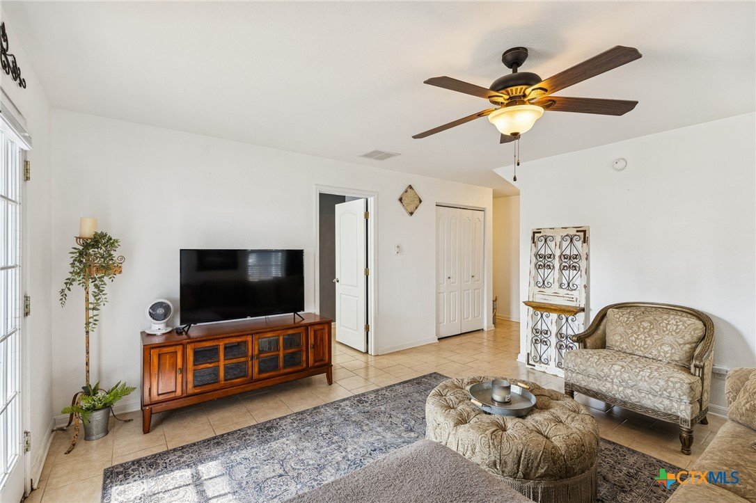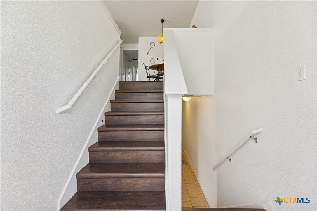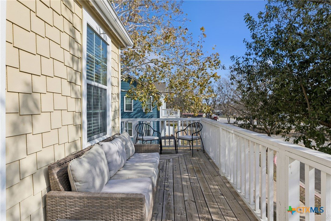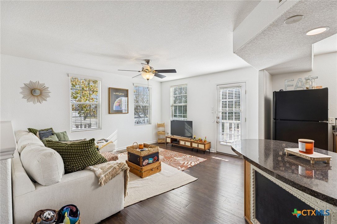 Welcome to Blanco River Village...an idyllic, storybook-style community with cheerful, colorful homes, wide front porches, and a beautifully maintained common area where neighbors gather, stroll, walk their dogs, and enjoy a true sense of community. This home is in a prime location and has easy garage access without feeling boxed in. It offers an excellent opportunity for full-time residents or is a smart investment option for college students, thanks to its flexible layout and private spaces. With 3 bedrooms, 3 full baths, and multiple living areas, it’s ideal for a family, roommates, or even an in-law setup. Two spacious primary suites make this floor plan especially versatile. The downstairs suite features a private entrance, its own living area, a covered wraparound porch with recent concrete extension, and a small, fenced lawn. It is perfect for guests, multigenerational living, or added rental income potential. Upstairs, you’ll love the open-concept design with a bright kitchen featuring a new gas range (2024), dishwasher (2023), breakfast bar, and a window over the sink. The kitchen opens to the dining area and an upstairs living space. Also on the second level: the upstairs primary bedroom with an en-suite bath. a secondary bedroom, full bath, and laundry room, Step outside to enjoy a second partially wraparound porch. It is the perfect spot for morning coffee, reading a book, or catching those Hill Country sunsets. Additional highlights include an attached 2-car garage, a charming courtyard, and hard surface flooring throughout (no carpet). The $350/month HOA fee includes exterior maintenance and the roof. Recent upgrades include a new roof (2025), an upgraded HVAC (2024), interior paint (2023), and a new extended concrete patio and updated lighting (2025). This location is hard to beat, situated just steps from the Blanco River, and conveniently close to Texas State University, shopping, restaurants, the outlet mall, and I-35 access in under 10 minutes.