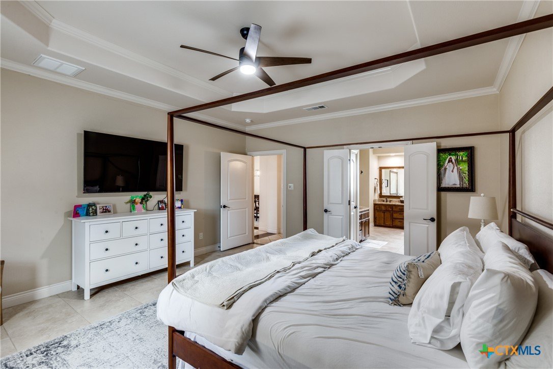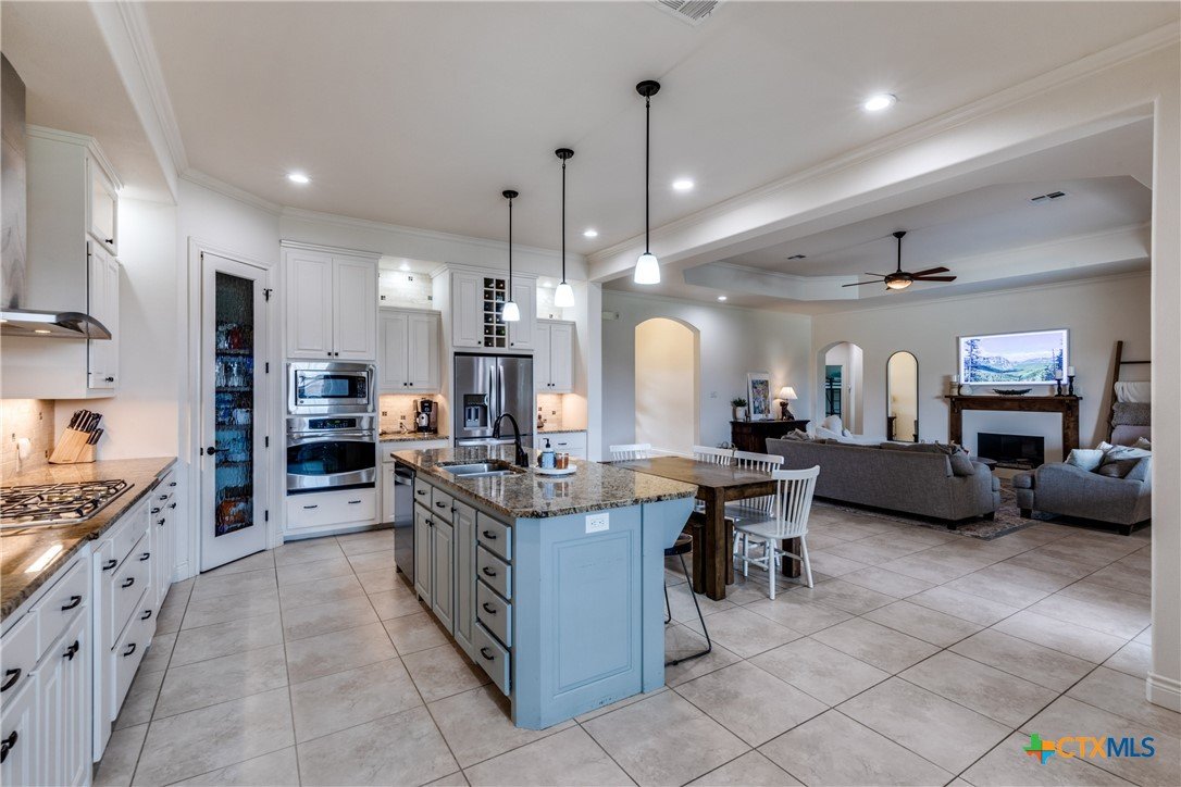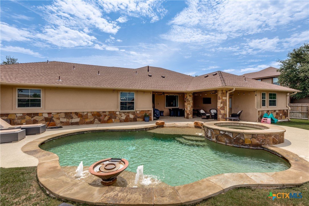 Nestled within a prestigious community near the lake, this beautifully maintained Tuscan-inspired residence offers everything you could want in a home. Situated on a generous half-acre lot, the property makes a striking first impression with its circular driveway, mature trees, and native landscaping that complement the 3-car side-entry garage. NEWER Roof in 2023. Step into your own backyard retreat featuring a sparkling in-ground pool and spa, expansive deck areas ideal for lounging, and a large covered patio complete with a wood-paneled ceiling and built-in outdoor kitchen. Pool can be heated for winter swimming. Inside, the open-concept layout is enhanced by easy-care tile flooring throughout. The impressive great room showcases a tray ceiling with crown molding, a cozy fireplace, and oversized windows overlooking the outdoor living space. At the center of the home, the chef’s kitchen is designed for both function and beauty, offering a working island, breakfast bar, gleaming granite countertops, abundant cabinetry, modern lighting, and a walk-in pantry. The owner’s suite is a private haven with its elegant tray ceiling, crown accents, and luxurious bath featuring a corner jetted tub plus a separate shower with multiple