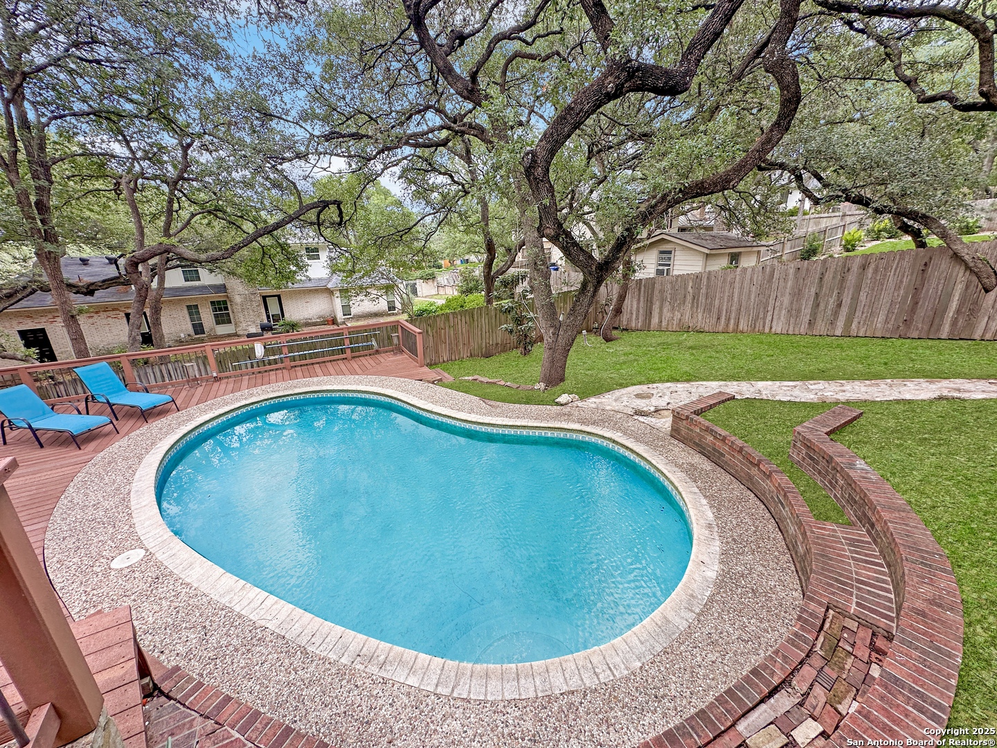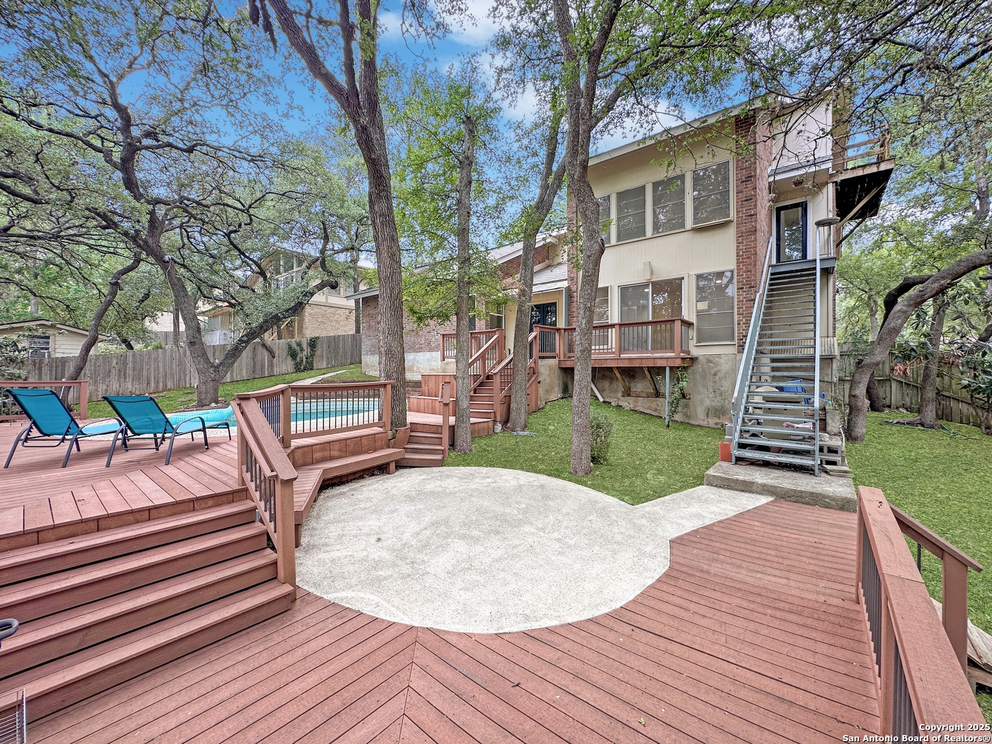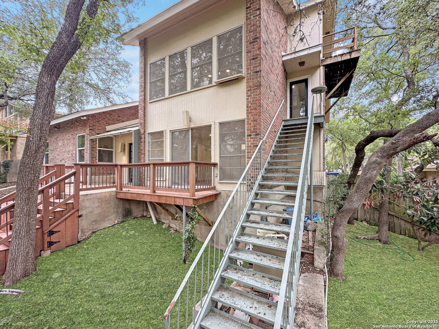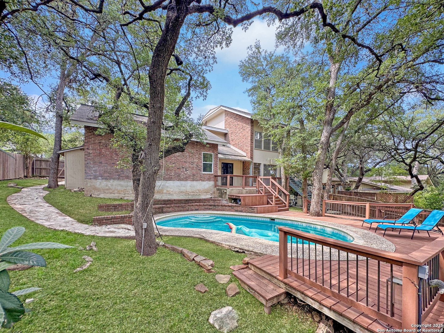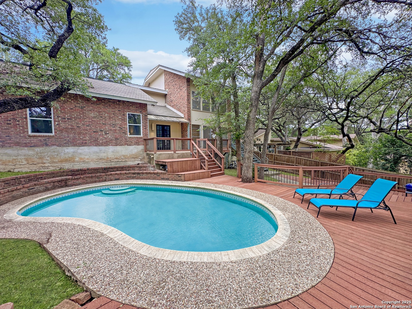 Discover timeless design and modern comfort in this tri level Midcentury Modern home with an in-ground pool located in the coveted Whispering Oaks neighborhood near Wurzbach and I-10. This beautifully updated residence offers 4 spacious bedrooms and 3 full bathrooms, including a luxurious primary suite with a spa inspired bath, private study with built in shelves, and direct access to the deck and pool. Bedroom 4 includes its own full bathroom and private access to the backyard and pool area too, making it an ideal guest suite or retreat. The main living area features soaring sixteen foot ceilings, a striking fireplace, original shiplap details, and abundant natural light from large updated windows. A sleek iron railing leads to the third level, offering a flexible space perfect for a home gym, game room, or creative studio with its own private balcony. The chef's kitchen is thoughtfully designed with gorgeous quartz countertops, a modern tiled backsplash, custom cabinetry, stainless steel appliances, and new designer light fixtures. Throughout the home, enjoy timeless Saltillo flooring and luxury vinyl plank flooring, fresh interior paint, and stylish bath fixtures that elevate every space. Outdoors, relax by a sparkling inground pool surrounded by multi level composite decking, mature trees, and a spacious yard ideal for entertaining. Recent upgrades include a new HVAC system installed in 2022, new windows in all bedrooms and the kitchen, and granite countertops in secondary bathrooms. Located just minutes from fine dining, shopping, and major routes with easy access to downtown and The Pearl, this home is a rare opportunity to own a modern classic in one of San Antonio's most desirable neighborhoods. Call today to schedule your private tour before this exceptional property is gone!