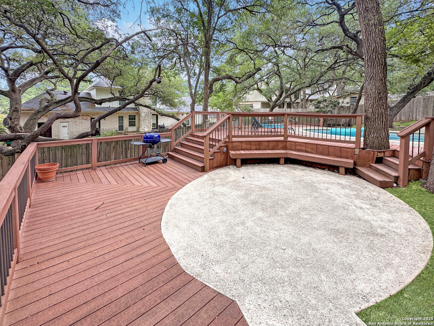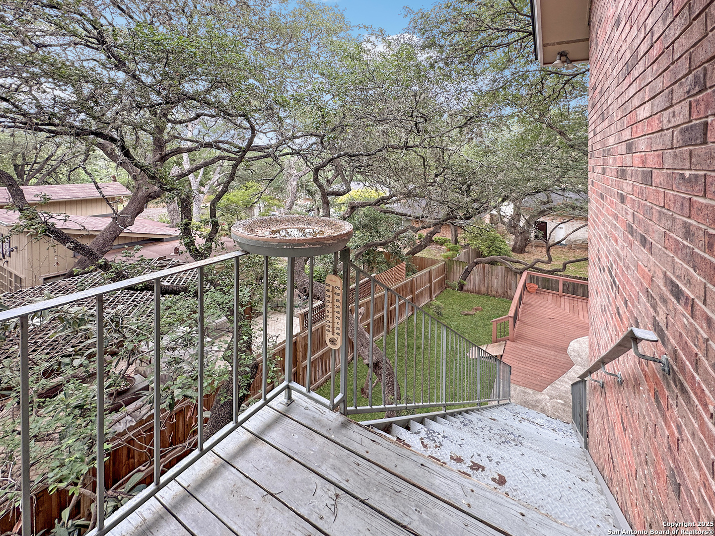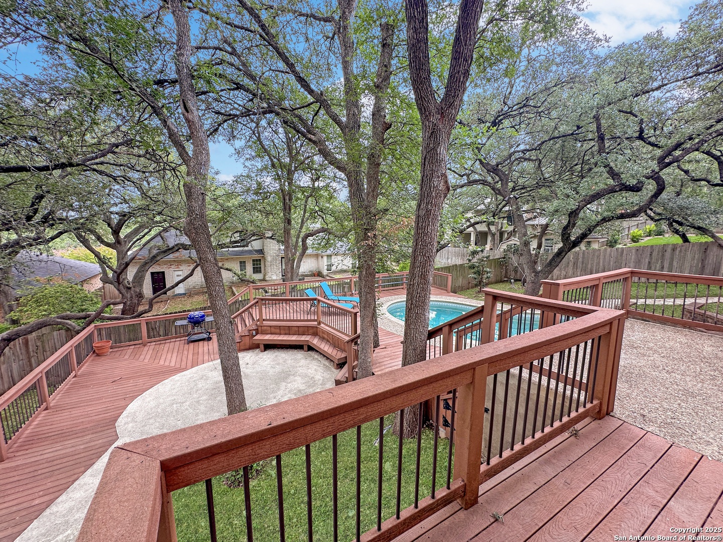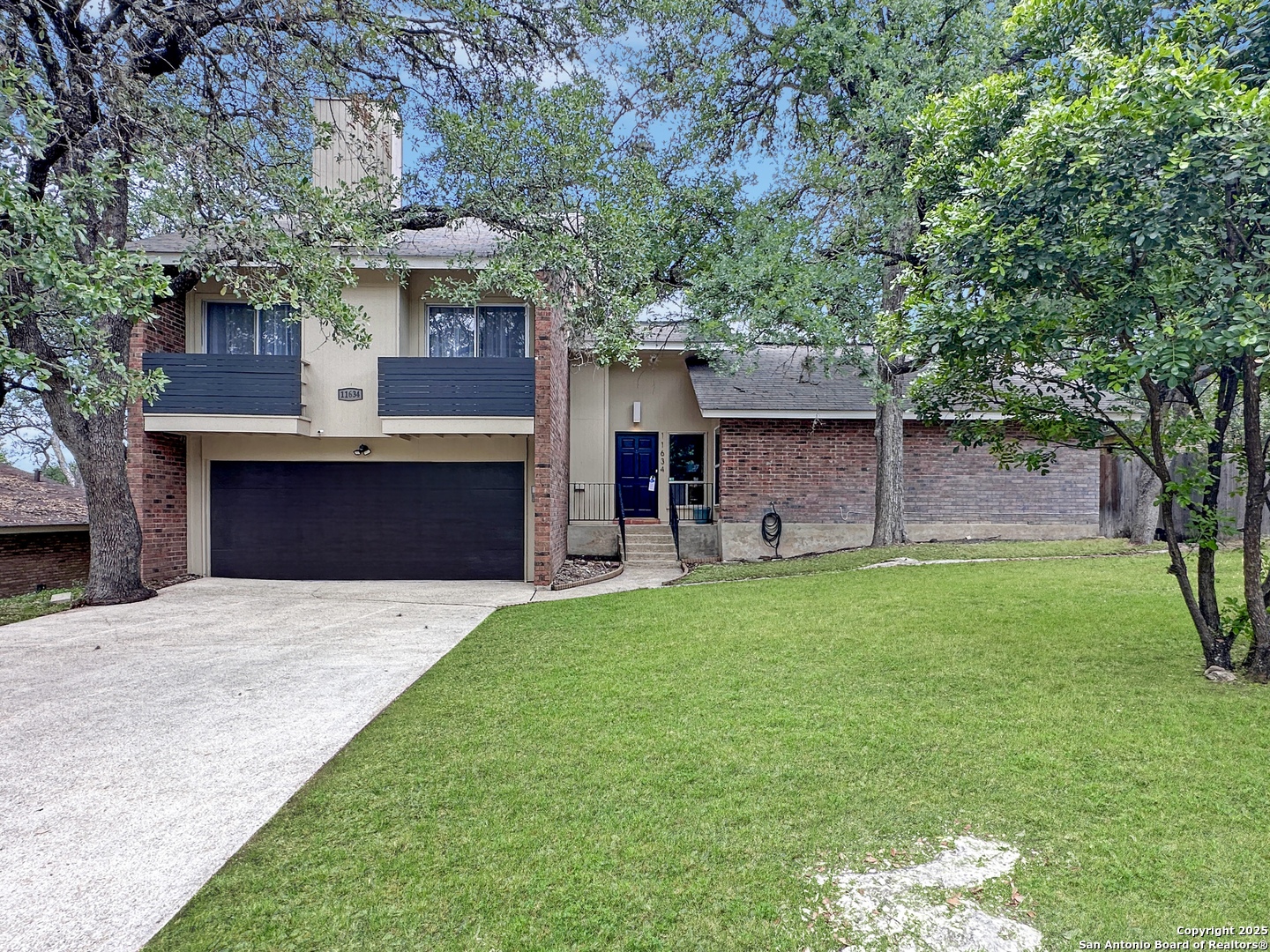 Discover timeless design and modern comfort in this tri level Midcentury Modern home with an in-ground pool located in the coveted Whispering Oaks neighborhood near Wurzbach and I-10. This beautifully updated residence offers 4 spacious bedrooms and 3 full bathrooms, including a luxurious primary suite with a spa inspired bath, private study with built in shelves, and direct access to the deck and pool. Bedroom 4 includes its own full bathroom and private access to the backyard and pool area too, making it an ideal guest suite or retreat. The main living area features soaring sixteen foot ceilings, a striking fireplace, original shiplap details, and abundant natural light from large updated windows. A sleek iron railing leads to the third level, offering a flexible space perfect for a home gym, game room, or creative studio with its own private balcony. The chef's kitchen is thoughtfully designed with gorgeous quartz countertops, a modern tiled backsplash, custom cabinetry, stainless steel appliances, and new designer light fixtures. Throughout the home, enjoy timeless Saltillo flooring and luxury vinyl plank flooring, fresh interior paint, and stylish bath fixtures that elevate every space. Outdoors, relax by a sparkling inground pool surrounded by multi level composite decking, mature trees, and a spacious yard ideal for entertaining. Recent upgrades include a new HVAC system installed in 2022, new windows in all bedrooms and the kitchen, and granite countertops in secondary bathrooms. Located just minutes from fine dining, shopping, and major routes with easy access to downtown and The Pearl, this home is a rare opportunity to own a modern classic in one of San Antonio's most desirable neighborhoods. Call today to schedule your private tour before this exceptional property is gone!