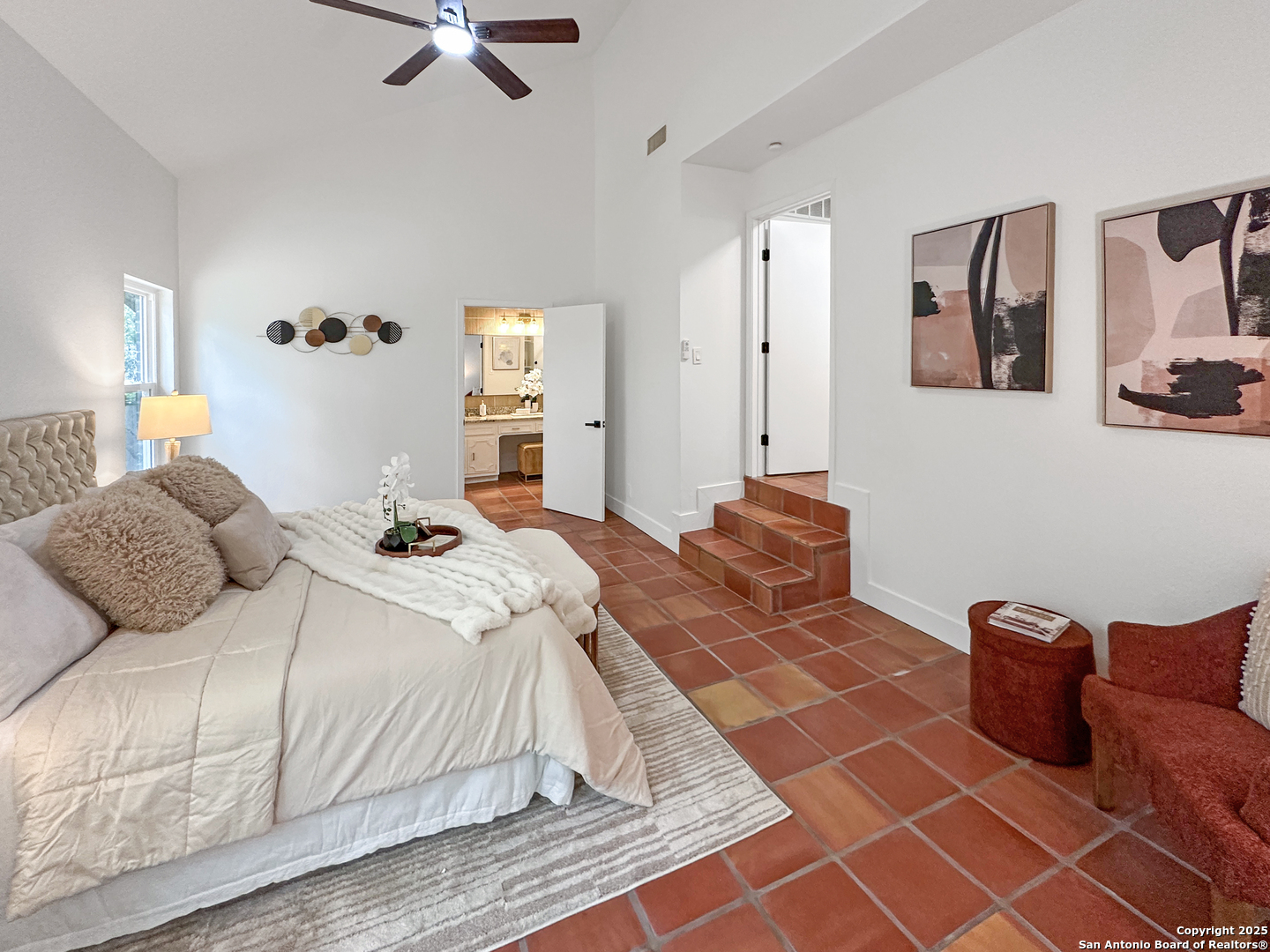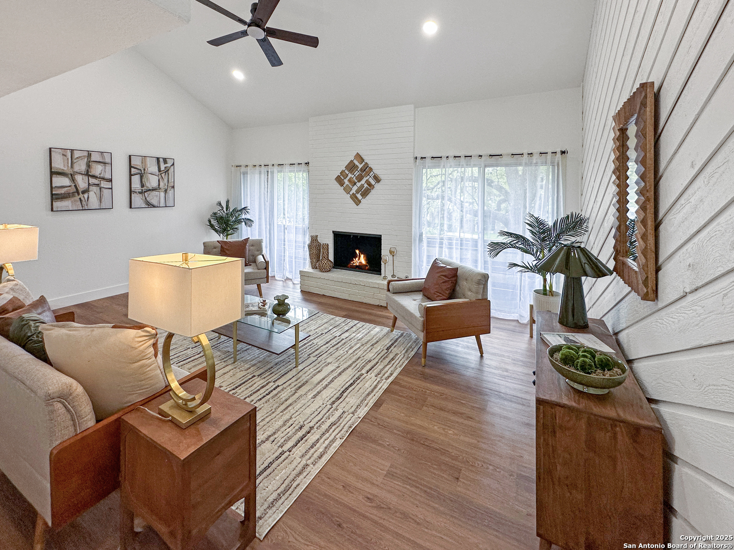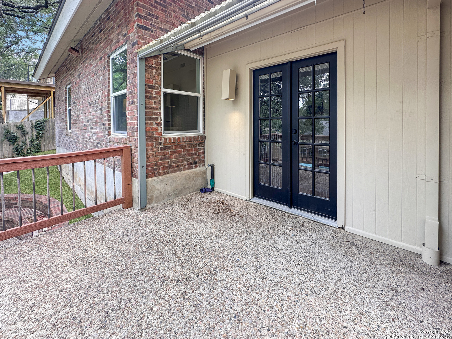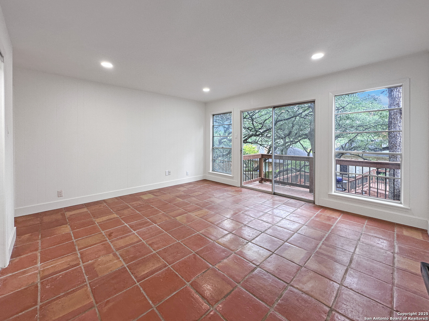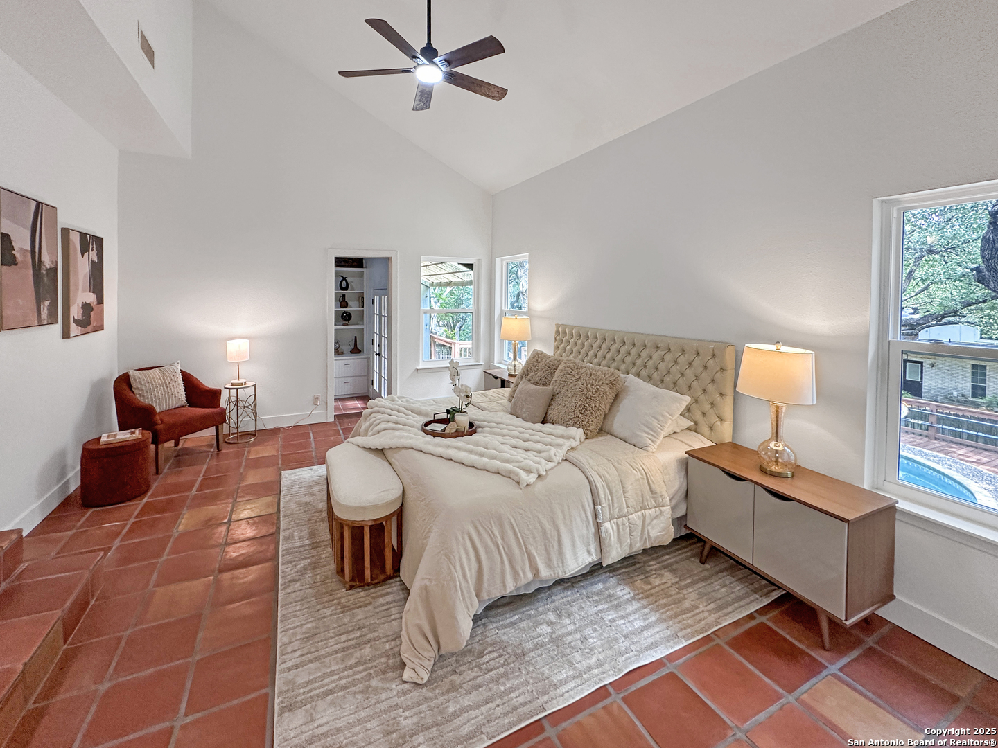 Discover timeless design and modern comfort in this tri level Midcentury Modern home with an in-ground pool located in the coveted Whispering Oaks neighborhood near Wurzbach and I-10. This beautifully updated residence offers 4 spacious bedrooms and 3 full bathrooms, including a luxurious primary suite with a spa inspired bath, private study with built in shelves, and direct access to the deck and pool. Bedroom 4 includes its own full bathroom and private access to the backyard and pool area too, making it an ideal guest suite or retreat. The main living area features soaring sixteen foot ceilings, a striking fireplace, original shiplap details, and abundant natural light from large updated windows. A sleek iron railing leads to the third level, offering a flexible space perfect for a home gym, game room, or creative studio with its own private balcony. The chef's kitchen is thoughtfully designed with gorgeous quartz countertops, a modern tiled backsplash, custom cabinetry, stainless steel appliances, and new designer light fixtures. Throughout the home, enjoy timeless Saltillo flooring and luxury vinyl plank flooring, fresh interior paint, and stylish bath fixtures that elevate every space. Outdoors, relax by a sparkling inground pool surrounded by multi level composite decking, mature trees, and a spacious yard ideal for entertaining. Recent upgrades include a new HVAC system installed in 2022, new windows in all bedrooms and the kitchen, and granite countertops in secondary bathrooms. Located just minutes from fine dining, shopping, and major routes with easy access to downtown and The Pearl, this home is a rare opportunity to own a modern classic in one of San Antonio's most desirable neighborhoods. Call today to schedule your private tour before this exceptional property is gone!
