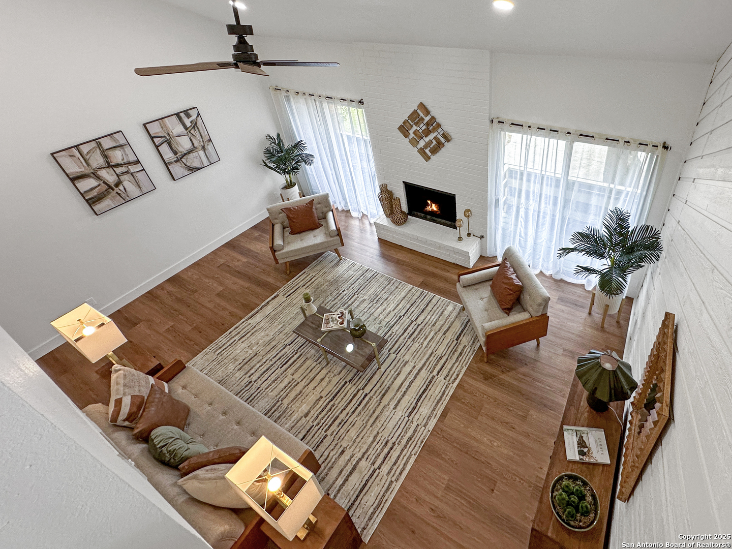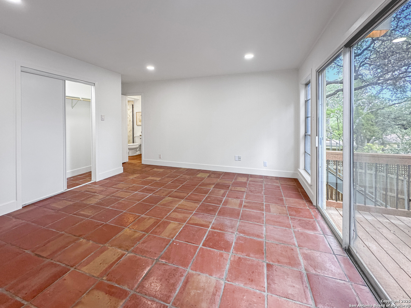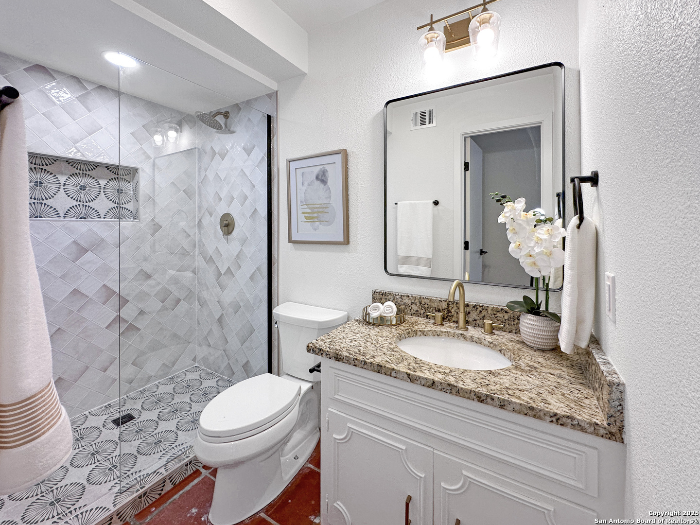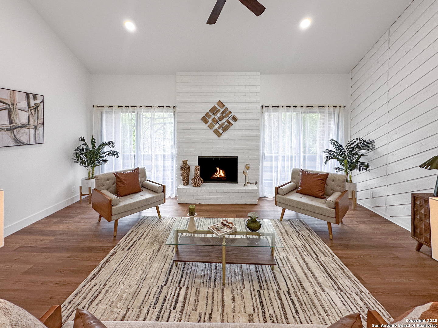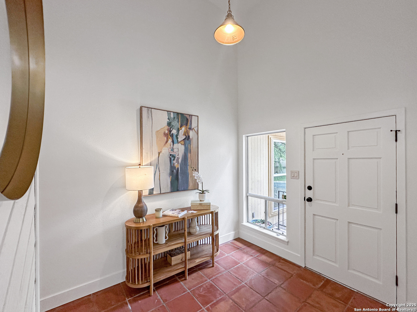 Discover timeless design and modern comfort in this tri level Midcentury Modern home with an in-ground pool located in the coveted Whispering Oaks neighborhood near Wurzbach and I-10. This beautifully updated residence offers 4 spacious bedrooms and 3 full bathrooms, including a luxurious primary suite with a spa inspired bath, private study with built in shelves, and direct access to the deck and pool. Bedroom 4 includes its own full bathroom and private access to the backyard and pool area too, making it an ideal guest suite or retreat. The main living area features soaring sixteen foot ceilings, a striking fireplace, original shiplap details, and abundant natural light from large updated windows. A sleek iron railing leads to the third level, offering a flexible space perfect for a home gym, game room, or creative studio with its own private balcony. The chef's kitchen is thoughtfully designed with gorgeous quartz countertops, a modern tiled backsplash, custom cabinetry, stainless steel appliances, and new designer light fixtures. Throughout the home, enjoy timeless Saltillo flooring and luxury vinyl plank flooring, fresh interior paint, and stylish bath fixtures that elevate every space. Outdoors, relax by a sparkling inground pool surrounded by multi level composite decking, mature trees, and a spacious yard ideal for entertaining. Recent upgrades include a new HVAC system installed in 2022, new windows in all bedrooms and the kitchen, and granite countertops in secondary bathrooms. Located just minutes from fine dining, shopping, and major routes with easy access to downtown and The Pearl, this home is a rare opportunity to own a modern classic in one of San Antonio's most desirable neighborhoods. Call today to schedule your private tour before this exceptional property is gone!