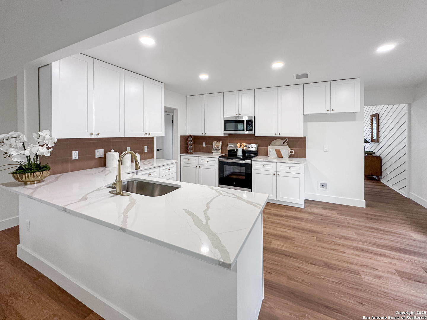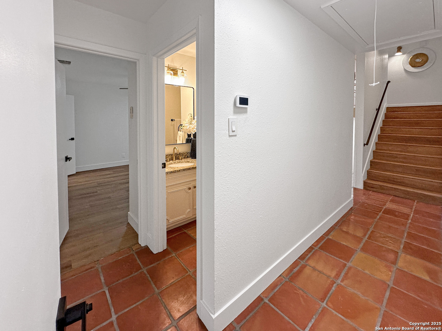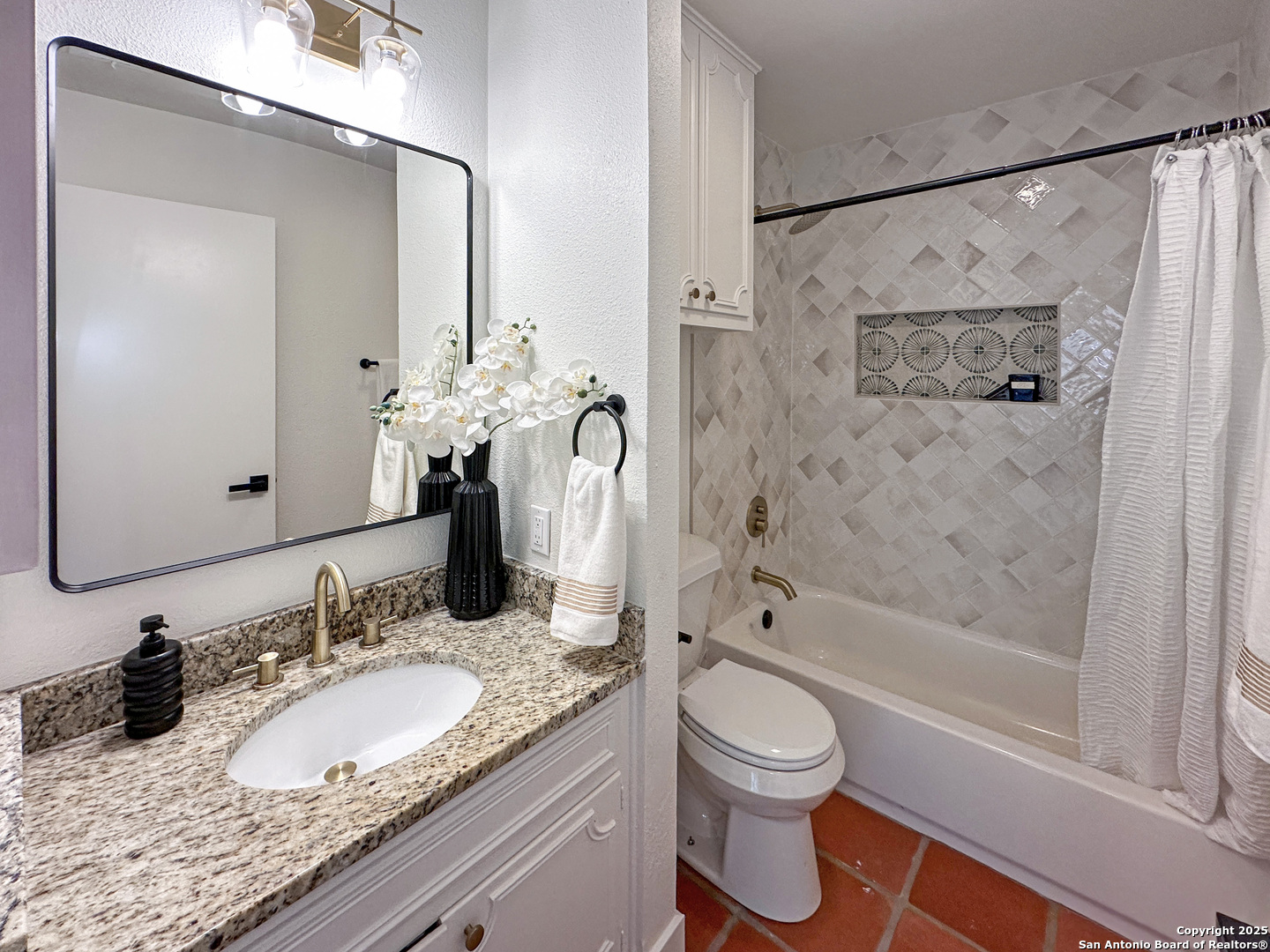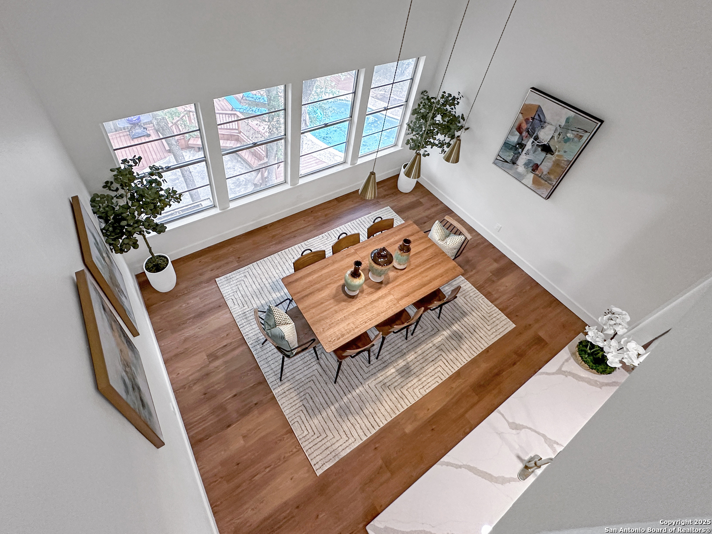 Discover timeless design and modern comfort in this tri level Midcentury Modern home with an in-ground pool located in the coveted Whispering Oaks neighborhood near Wurzbach and I-10. This beautifully updated residence offers 4 spacious bedrooms and 3 full bathrooms, including a luxurious primary suite with a spa inspired bath, private study with built in shelves, and direct access to the deck and pool. Bedroom 4 includes its own full bathroom and private access to the backyard and pool area too, making it an ideal guest suite or retreat. The main living area features soaring sixteen foot ceilings, a striking fireplace, original shiplap details, and abundant natural light from large updated windows. A sleek iron railing leads to the third level, offering a flexible space perfect for a home gym, game room, or creative studio with its own private balcony. The chef's kitchen is thoughtfully designed with gorgeous quartz countertops, a modern tiled backsplash, custom cabinetry, stainless steel appliances, and new designer light fixtures. Throughout the home, enjoy timeless Saltillo flooring and luxury vinyl plank flooring, fresh interior paint, and stylish bath fixtures that elevate every space. Outdoors, relax by a sparkling inground pool surrounded by multi level composite decking, mature trees, and a spacious yard ideal for entertaining. Recent upgrades include a new HVAC system installed in 2022, new windows in all bedrooms and the kitchen, and granite countertops in secondary bathrooms. Located just minutes from fine dining, shopping, and major routes with easy access to downtown and The Pearl, this home is a rare opportunity to own a modern classic in one of San Antonio's most desirable neighborhoods. Call today to schedule your private tour before this exceptional property is gone!