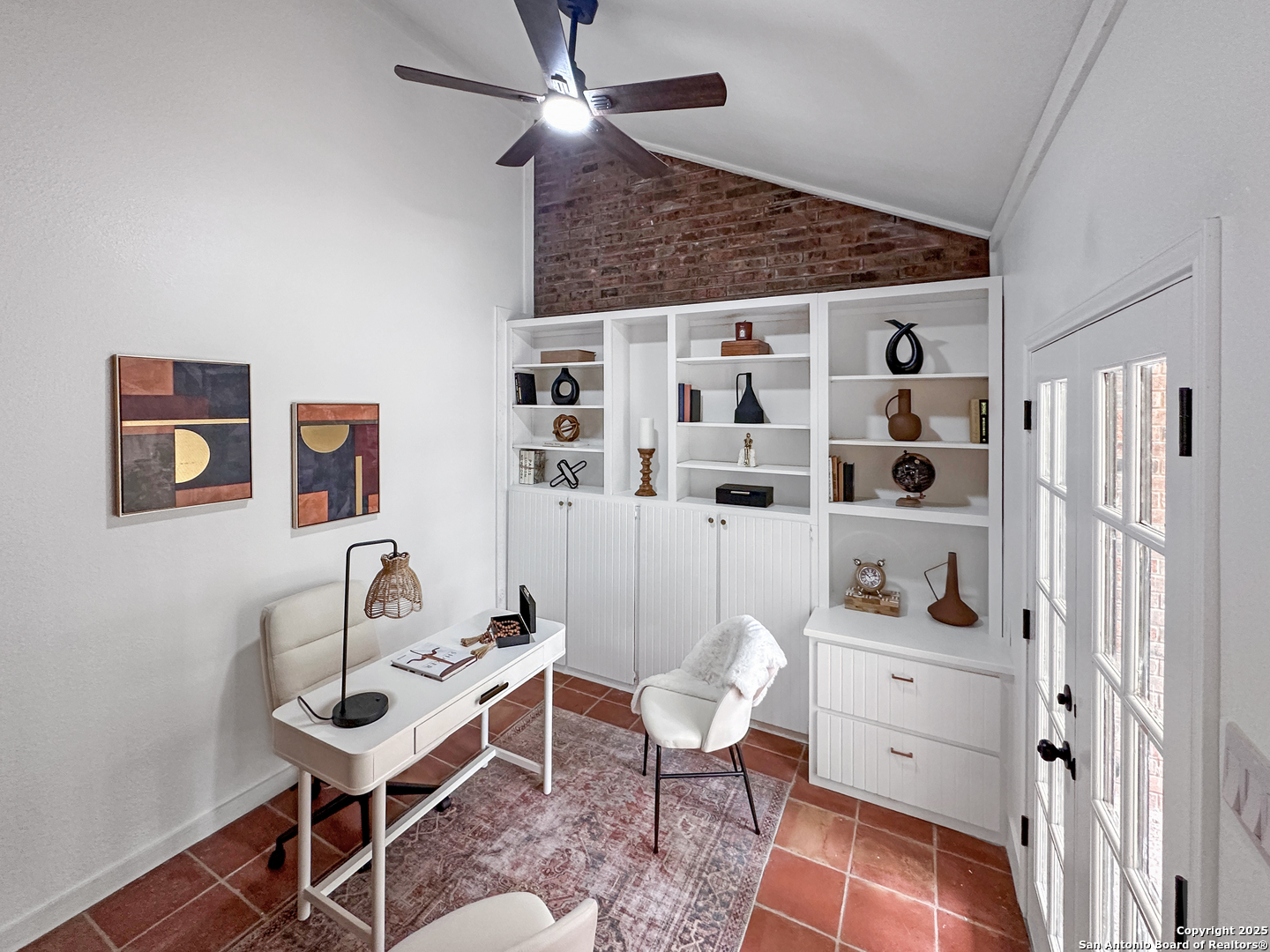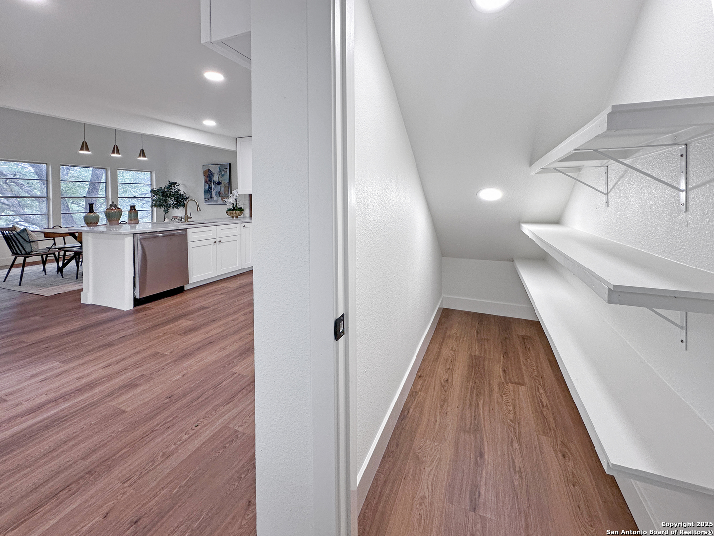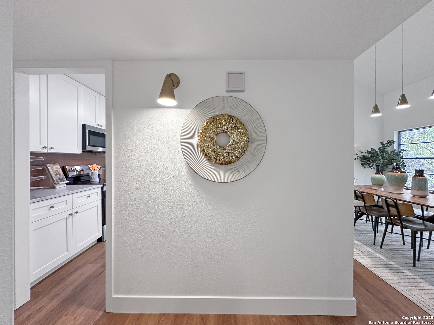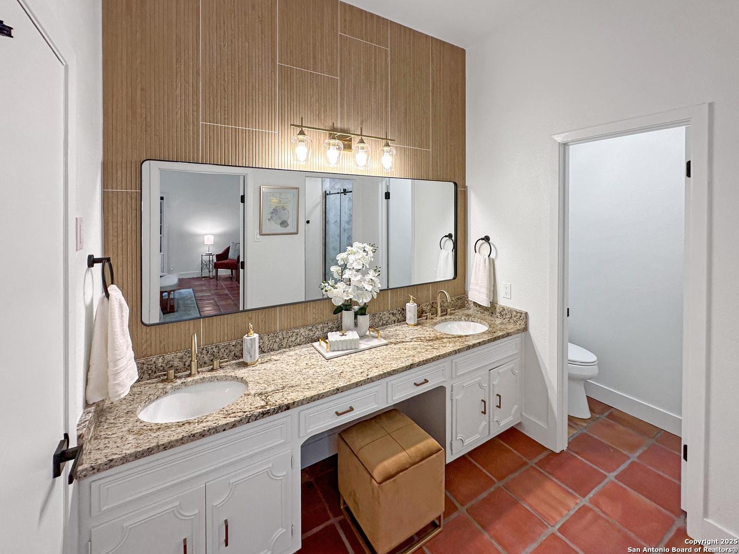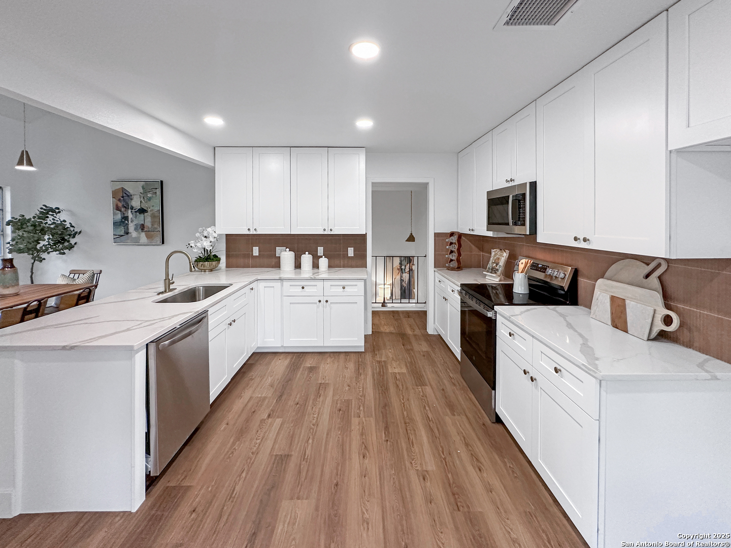 Discover timeless design and modern comfort in this tri level Midcentury Modern home with an in-ground pool located in the coveted Whispering Oaks neighborhood near Wurzbach and I-10. This beautifully updated residence offers 4 spacious bedrooms and 3 full bathrooms, including a luxurious primary suite with a spa inspired bath, private study with built in shelves, and direct access to the deck and pool. Bedroom 4 includes its own full bathroom and private access to the backyard and pool area too, making it an ideal guest suite or retreat. The main living area features soaring sixteen foot ceilings, a striking fireplace, original shiplap details, and abundant natural light from large updated windows. A sleek iron railing leads to the third level, offering a flexible space perfect for a home gym, game room, or creative studio with its own private balcony. The chef's kitchen is thoughtfully designed with gorgeous quartz countertops, a modern tiled backsplash, custom cabinetry, stainless steel appliances, and new designer light fixtures. Throughout the home, enjoy timeless Saltillo flooring and luxury vinyl plank flooring, fresh interior paint, and stylish bath fixtures that elevate every space. Outdoors, relax by a sparkling inground pool surrounded by multi level composite decking, mature trees, and a spacious yard ideal for entertaining. Recent upgrades include a new HVAC system installed in 2022, new windows in all bedrooms and the kitchen, and granite countertops in secondary bathrooms. Located just minutes from fine dining, shopping, and major routes with easy access to downtown and The Pearl, this home is a rare opportunity to own a modern classic in one of San Antonio's most desirable neighborhoods. Call today to schedule your private tour before this exceptional property is gone!
