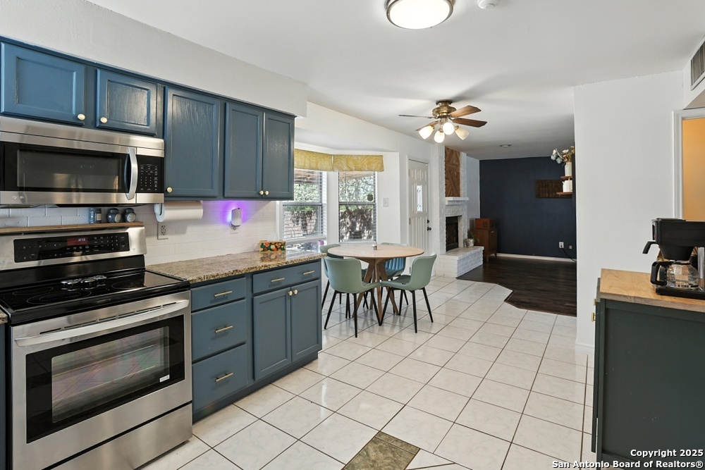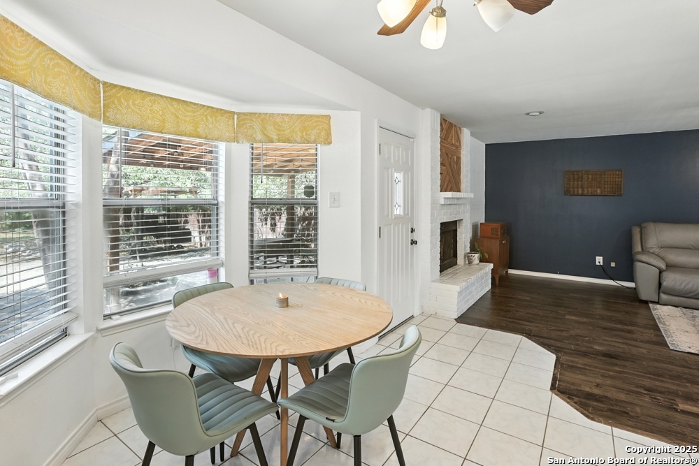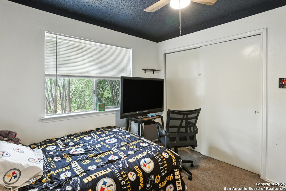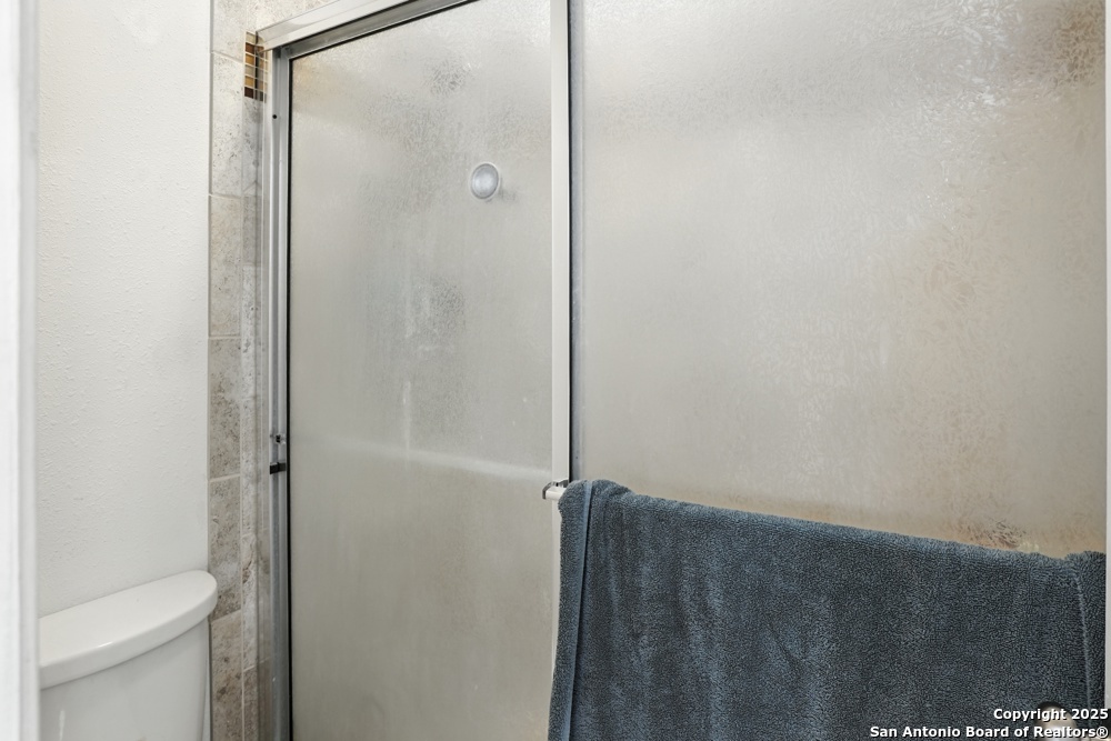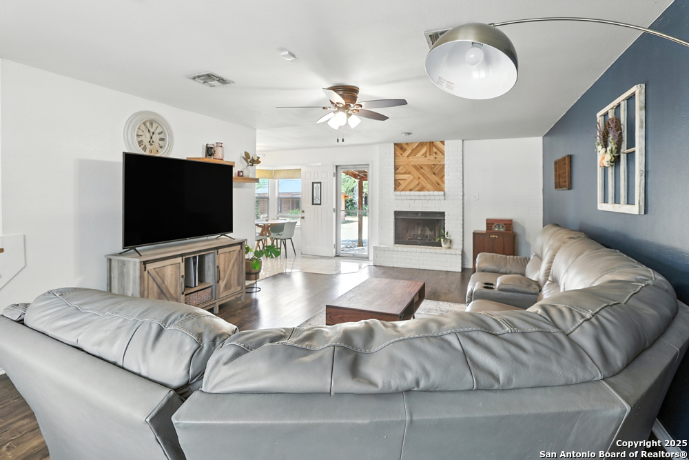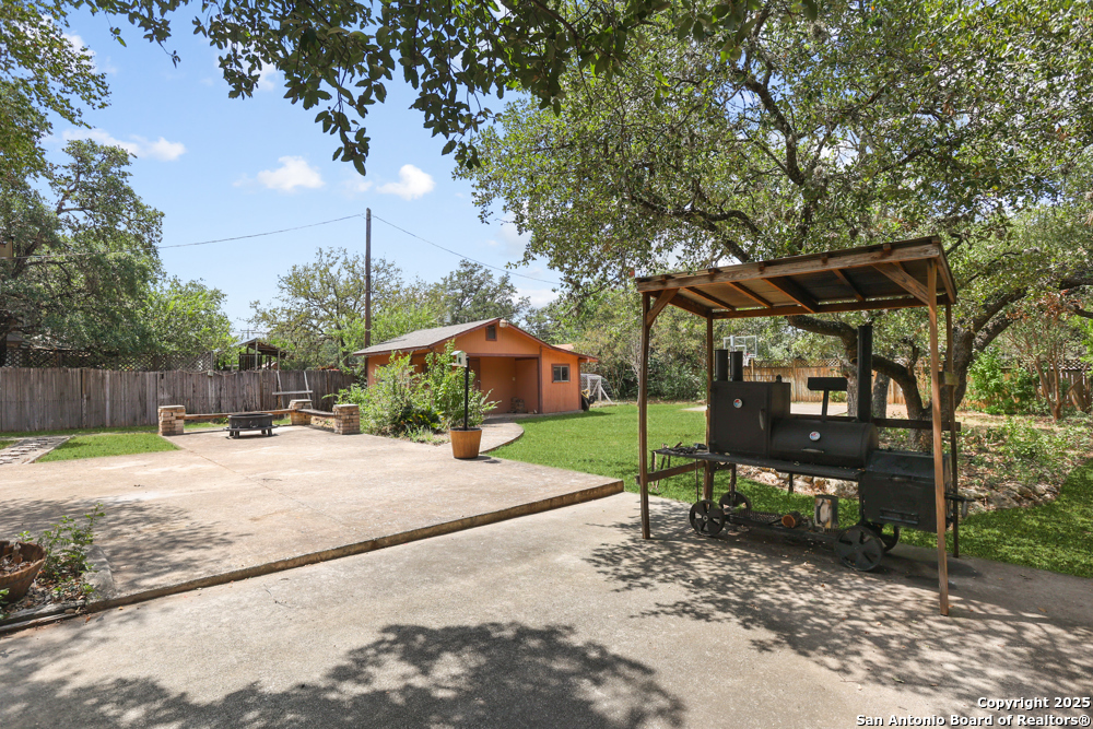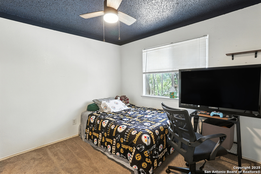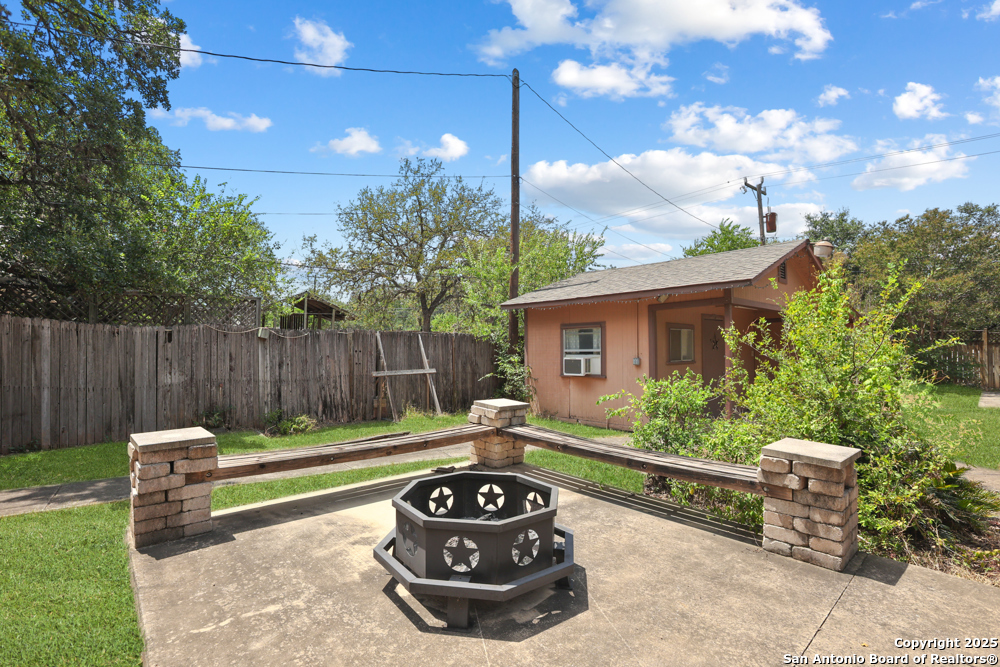 This well-maintained, updated home offers 5 spacious bedrooms plus office and 2 1/2 bathrooms. The modern kitchen features granite countertops, tile flooring, and stainless steel appliances-perfect for cooking and entertaining. Amenities include hardwood flooring in living area, beautifully designed staircase, wood beam accented ceiling in office with french doors, living room with cozy fireplace and lots of natural light. Situated on a generous lot with mature trees, the outdoor space includes a large patio, basketball court, and a large workshop/storage building. Additional features include ceiling fans and sprinkler system. Conveniently located near Lackland AFB, SeaWorld, shopping, restaurants and major employers. 5 bedroom homes like this don't come around often-schedule your showing today!
