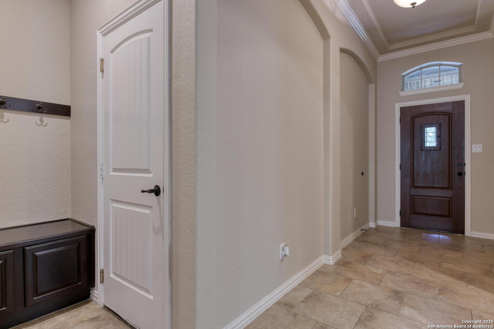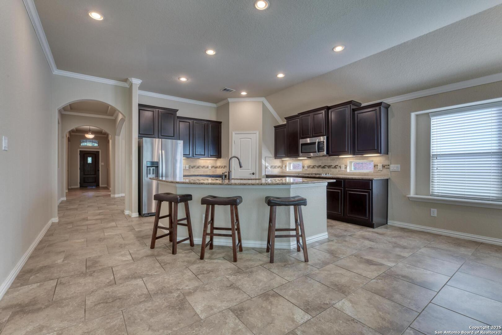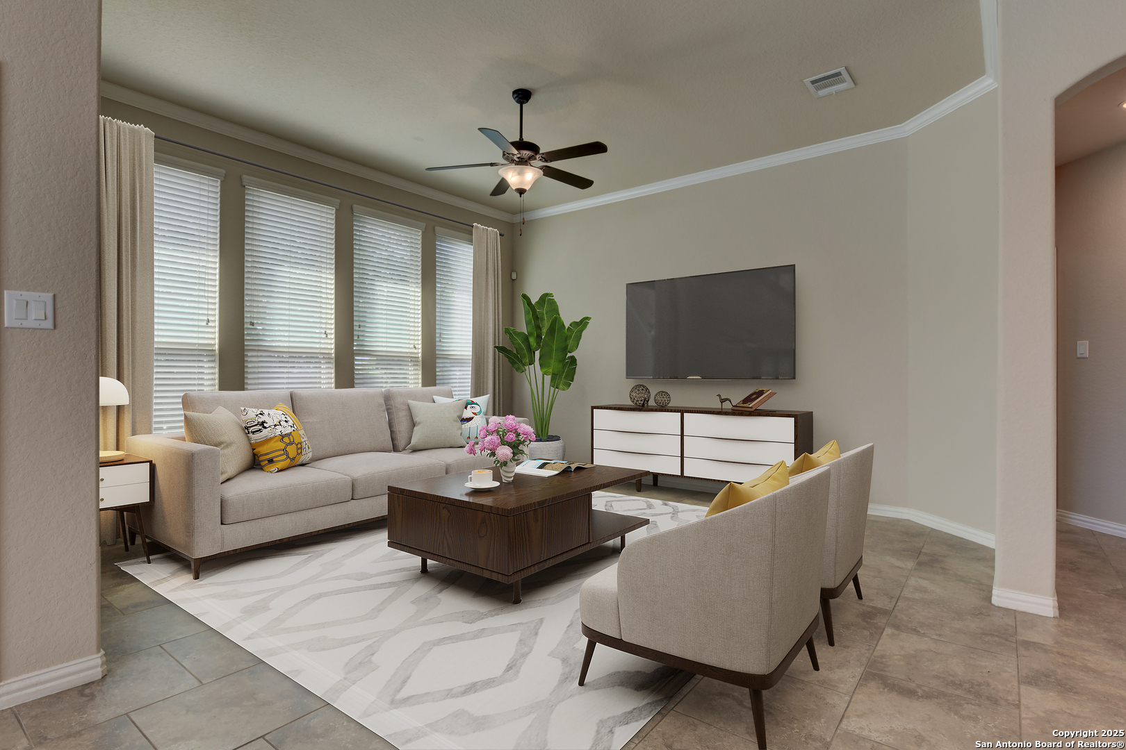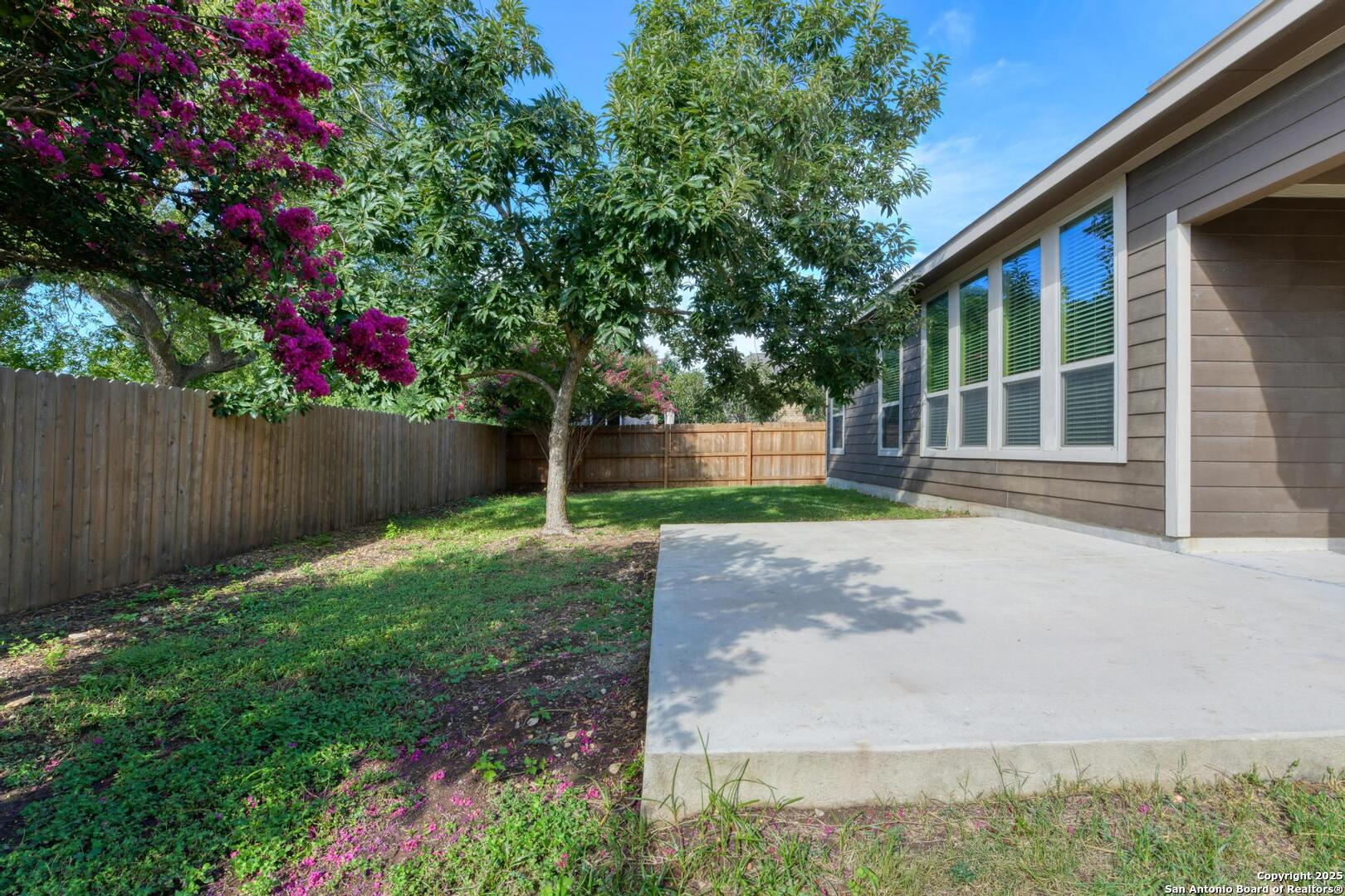 This meticulously maintained home offers a standout floor plan featured as Lennar's popular model home -move-in ready and packed with value due to custom upgrades. Nestled on a level lot that backs to a peaceful green space. This home offers privacy in the backyard. Inside, enjoy an open-concept layout with high ceilings, energy-efficient features like ceiling fans and a programmable thermostat, and custom finishes throughout which includes upgraded kitchen cabinets. Lennar's signature "All Included" features shine here: stainless steel appliances, upgraded granite kitchen counters, crown molding, designer tile backsplash, 18 staggered tile flooring in living areas and Lifeproof flooring in bedrooms (No Carpet), and a luxurious jetted garden tub in the master bath. The full sprinkler system keeps the yard looking its best, while the extended 12 16 patio slab expands your outdoor living space-ideal for entertaining. The wood fence was replaced and stained in 2023. Feb 2025 a new tankless water heater was installed. This home checks all the boxes for style, comfort, and convenience. A must-see for buyers seeking turnkey living in a serene setting!
