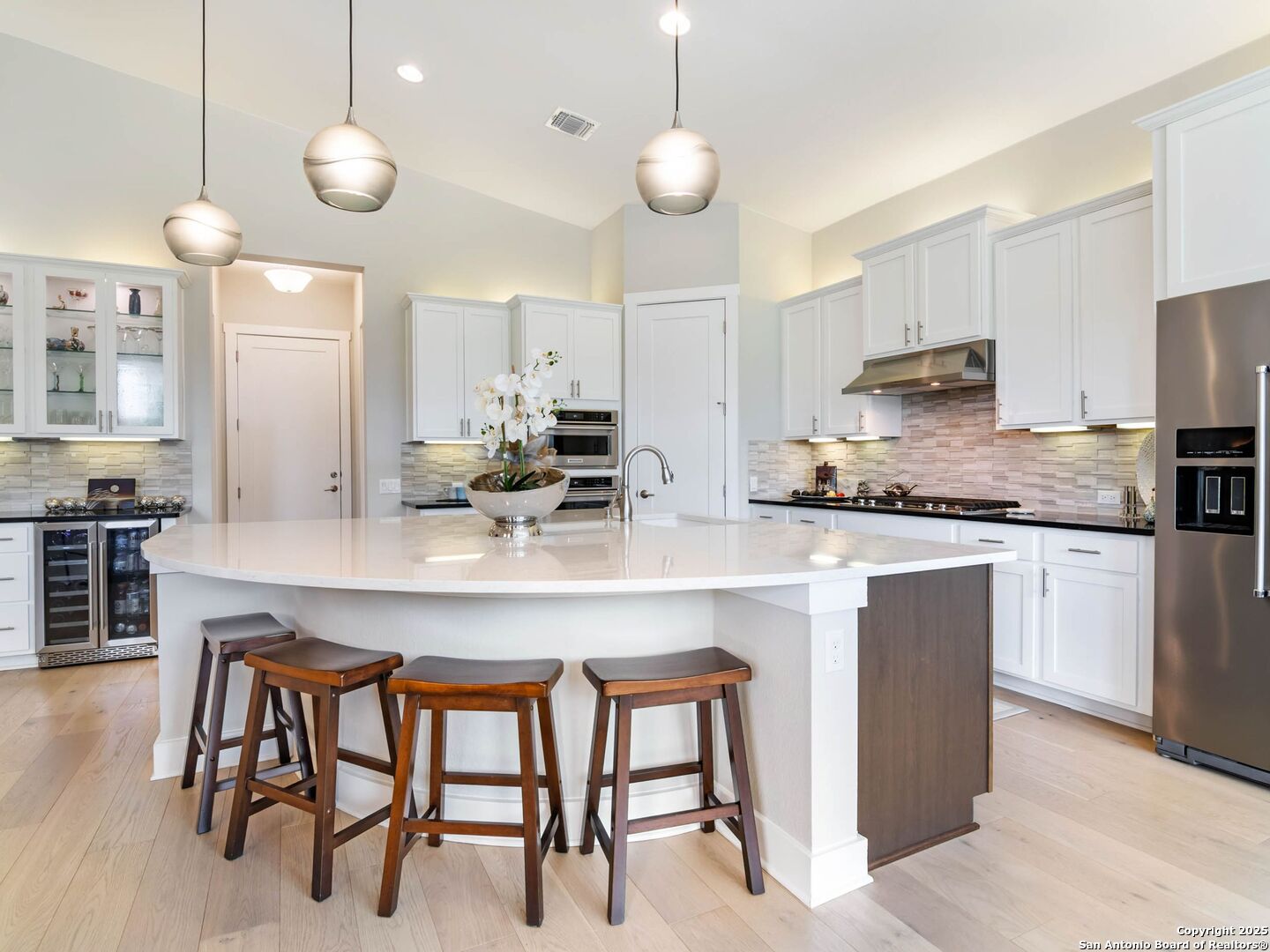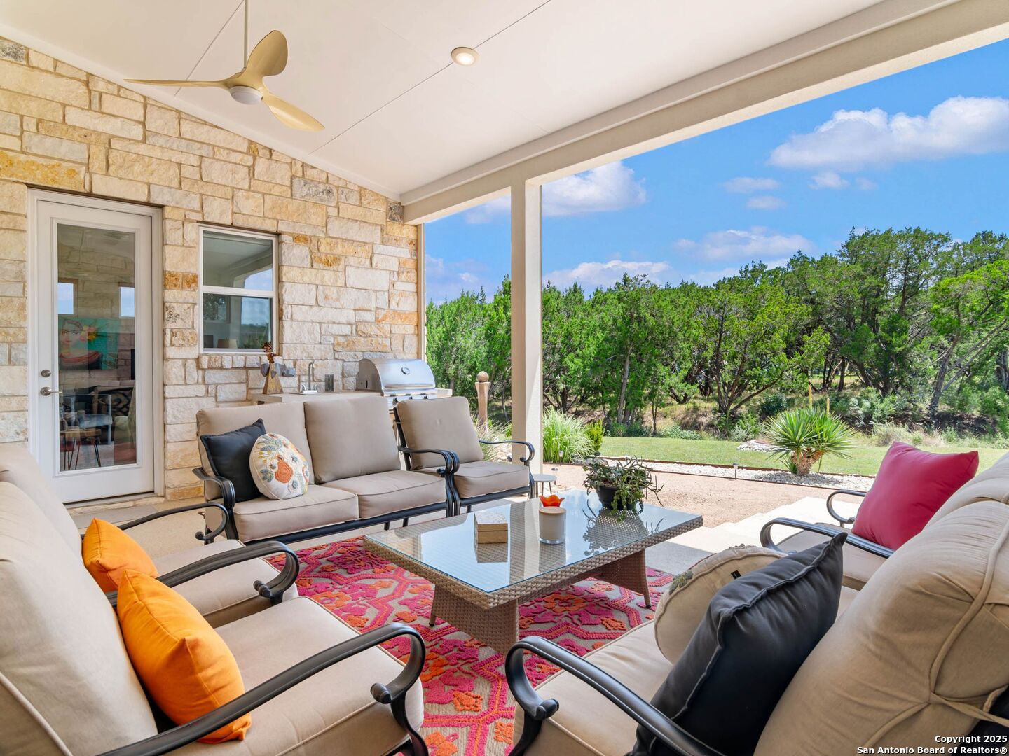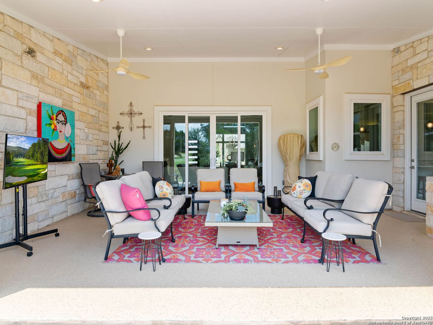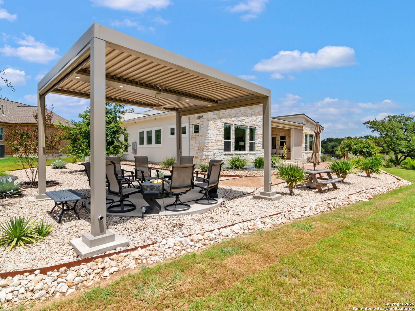 Exquisite Home on One of the Largest Lots in Kissing Tree! Welcome to an exceptional opportunity to own one of the most coveted homes in the luxurious 55+ Kissing Tree community! Situated on one of the largest lots and perfectly positioned off Tee Box 8, this stunning property offers expansive, tree-lined views that create a sense of privacy and serenity rarely found. Imagine sipping your morning coffee on the covered back patio, embraced by the gentle sounds of a tranquil water feature and the soothing ambiance of nature. For those who love to entertain, an additional covered patio set further into the yard provides the perfect setting for unforgettable gatherings under the Texas sky. Inside, you'll be greeted by a home where no detail was overlooked. Thoughtfully designed with excellence in mind, this modern beauty boasts designer lighting-including breathtaking blown glass pendant lights-alongside sleek built-in appliances, and high-end finishes throughout. The open-concept kitchen features a large island that flows seamlessly into the living area and out to the patio spaces, offering an ideal layout for entertaining or simply relaxing. This home includes 3 spacious bedrooms, 2.5 bathrooms, and an oversized garage with epoxy flooring, dedicated golf cart parking and a 50a EV outlet too! A charming creek behind the home adds to the property's peaceful, natural ambiance. From the striking light fixtures and stylish ceiling fans to the smart layout and premium upgrades, this home invites you to fall in love the moment you step through the door. There is even a 24K Generac generator, to keep power to your home during any outages! Come experience the lifestyle you've been dreaming of.