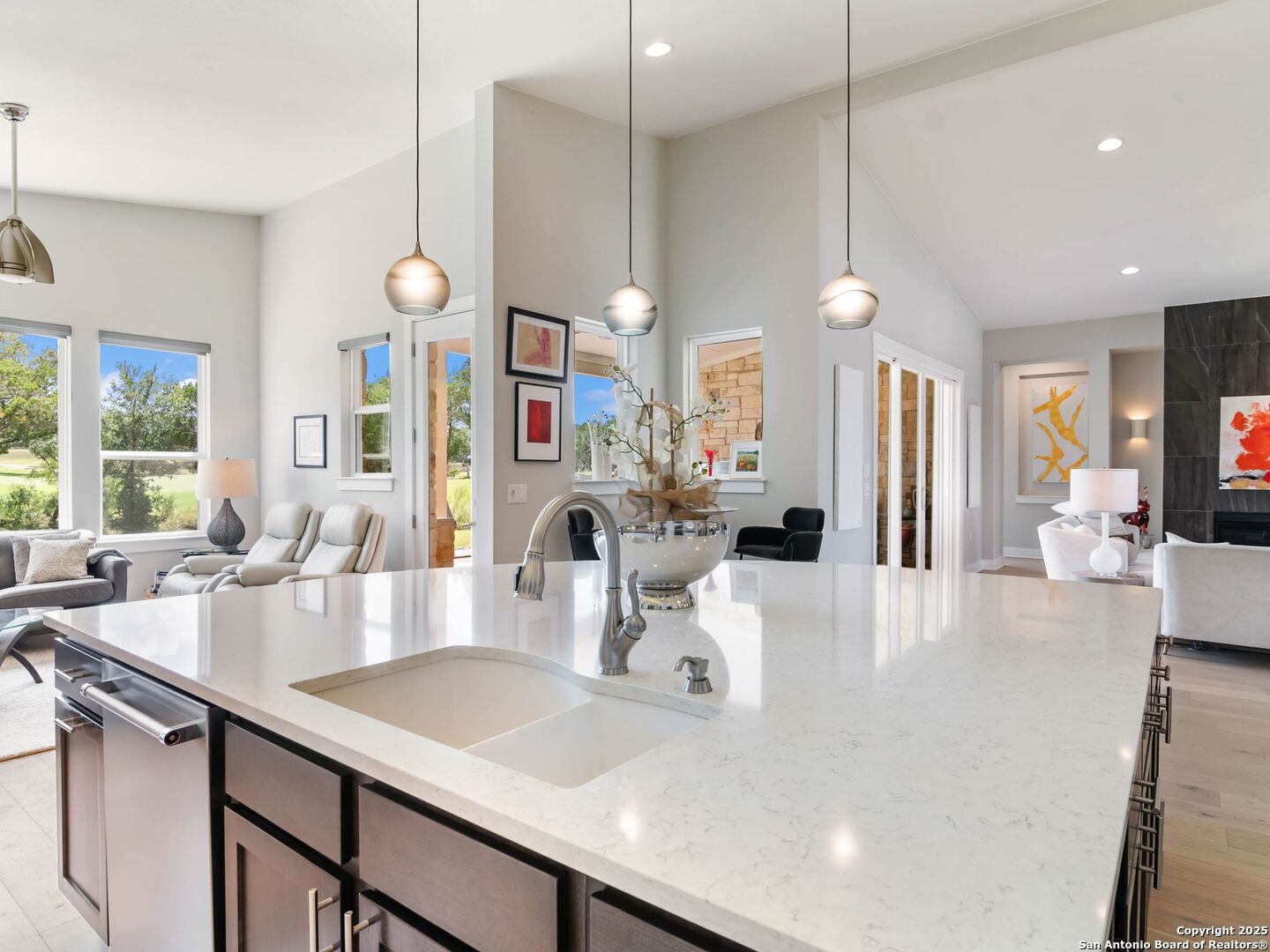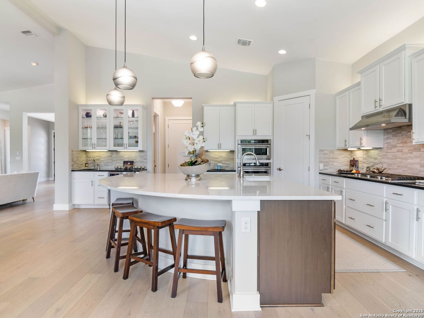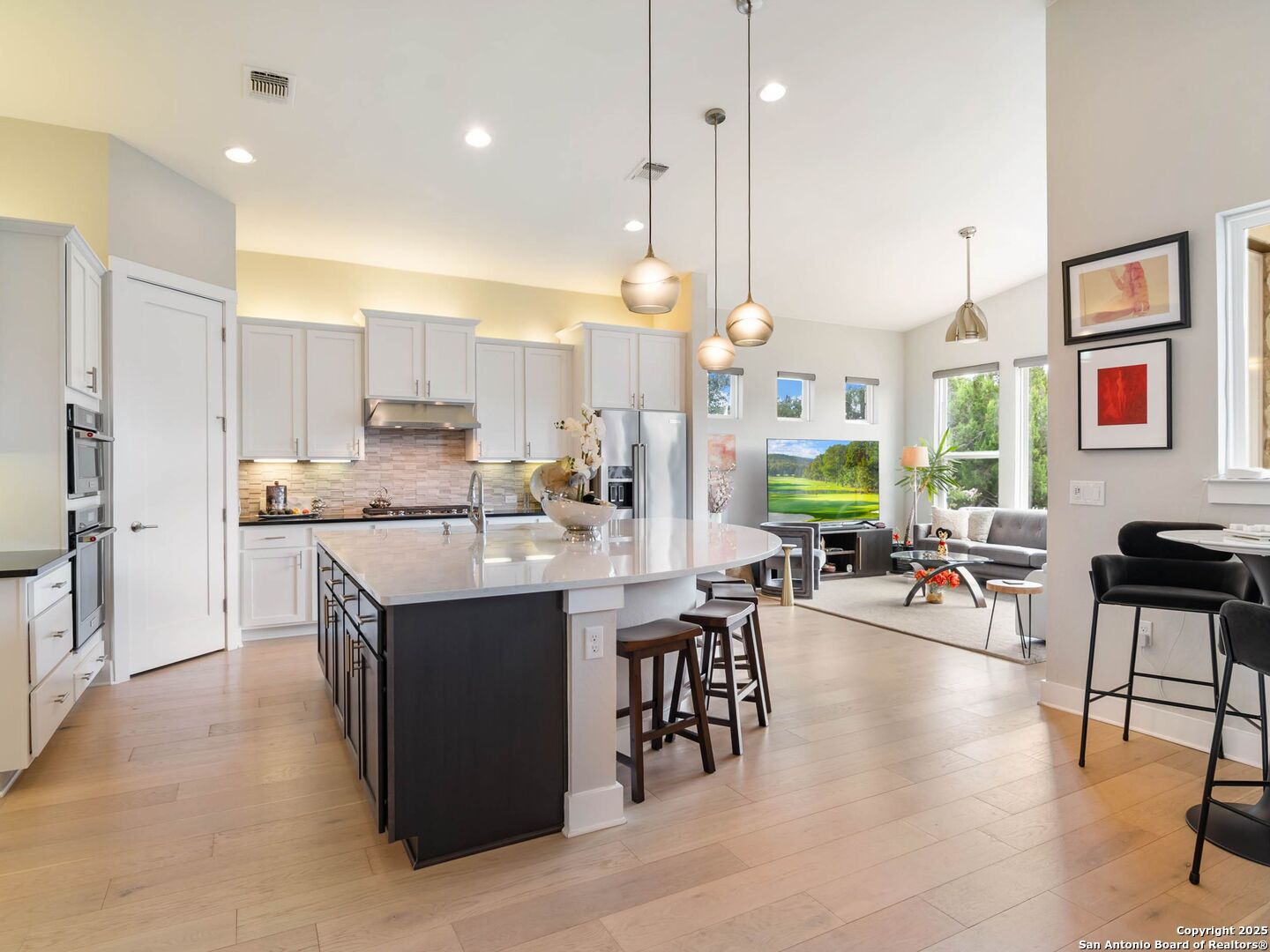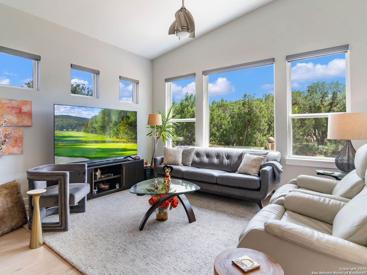 Exquisite Home on One of the Largest Lots in Kissing Tree! Welcome to an exceptional opportunity to own one of the most coveted homes in the luxurious 55+ Kissing Tree community! Situated on one of the largest lots and perfectly positioned off Tee Box 8, this stunning property offers expansive, tree-lined views that create a sense of privacy and serenity rarely found. Imagine sipping your morning coffee on the covered back patio, embraced by the gentle sounds of a tranquil water feature and the soothing ambiance of nature. For those who love to entertain, an additional covered patio set further into the yard provides the perfect setting for unforgettable gatherings under the Texas sky. Inside, you'll be greeted by a home where no detail was overlooked. Thoughtfully designed with excellence in mind, this modern beauty boasts designer lighting-including breathtaking blown glass pendant lights-alongside sleek built-in appliances, and high-end finishes throughout. The open-concept kitchen features a large island that flows seamlessly into the living area and out to the patio spaces, offering an ideal layout for entertaining or simply relaxing. This home includes 3 spacious bedrooms, 2.5 bathrooms, and an oversized garage with epoxy flooring, dedicated golf cart parking and a 50a EV outlet too! A charming creek behind the home adds to the property's peaceful, natural ambiance. From the striking light fixtures and stylish ceiling fans to the smart layout and premium upgrades, this home invites you to fall in love the moment you step through the door. There is even a 24K Generac generator, to keep power to your home during any outages! Come experience the lifestyle you've been dreaming of.