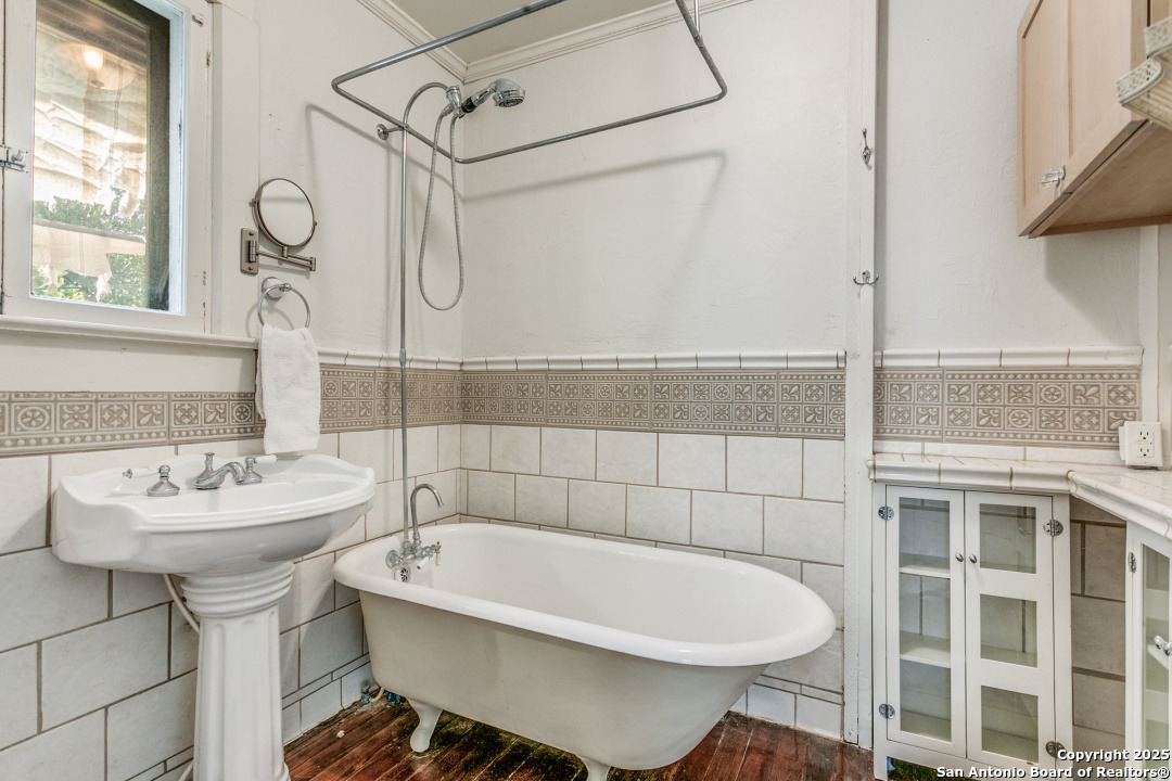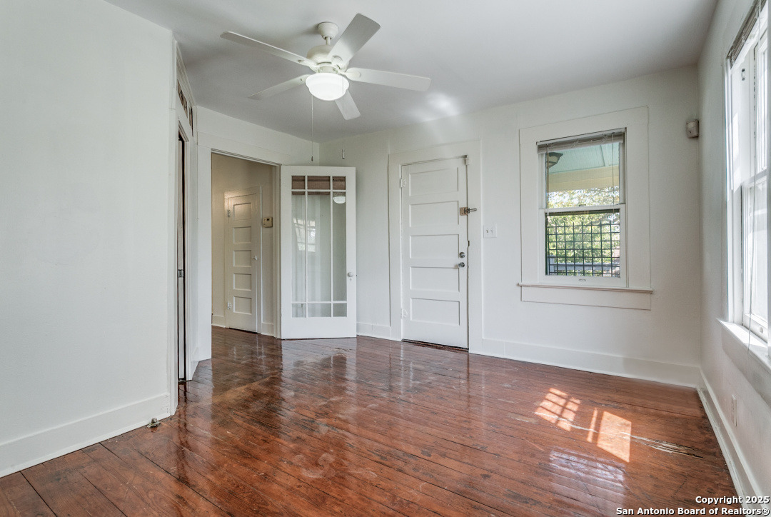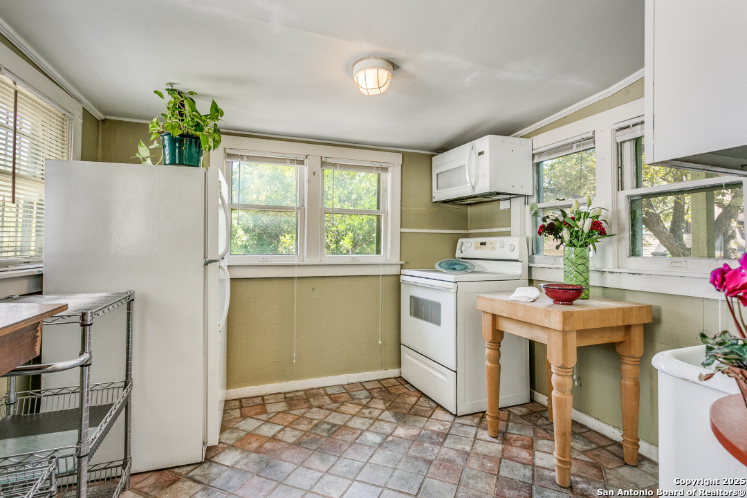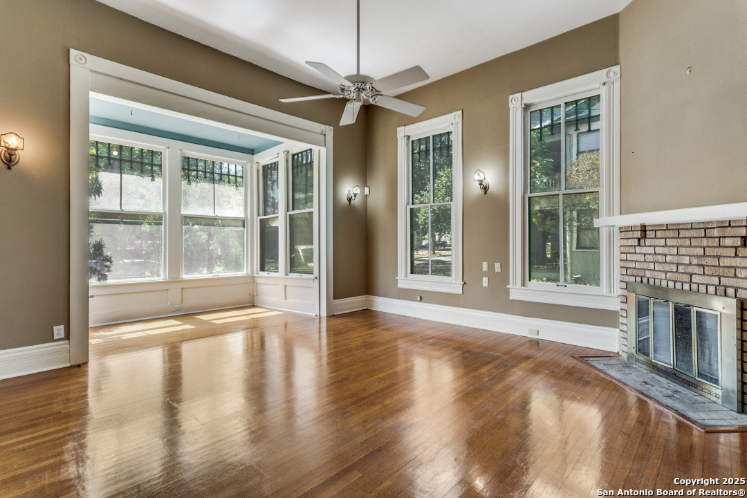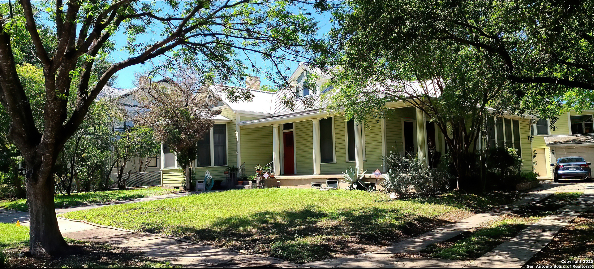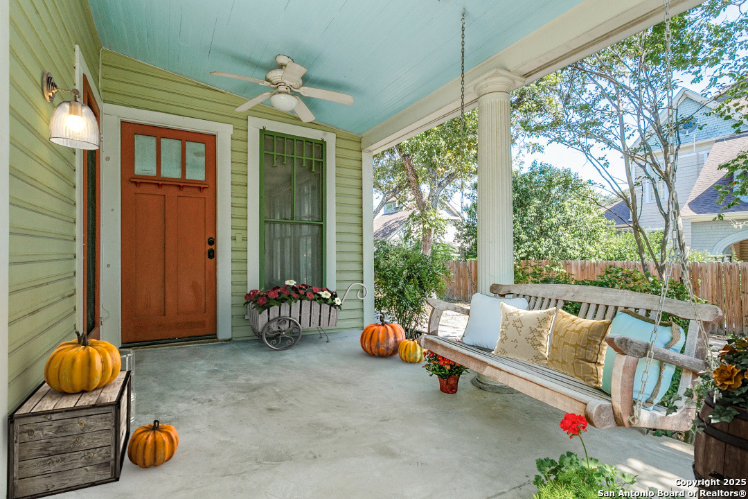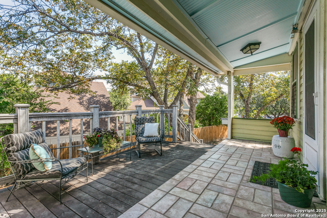 Urban living in Historic Monte Vista! This grand one-story, well into it's second century and listed in the National Register of Historic Places, is one of the oldest structures in the neighborhood. An expansive wrap-around front porch with swing lets you enjoy the vibrancy of this thriving historic and entertainment district. Mere blocks from all the popular dining spots that make Monte Vista a "destination!" The home is full of towering seven foot windows, interior glass doors and high transoms. The living room has a window-lined "bump out," offering cozy seating and a view of the tree-lined avenue. A unique double fireplace lends ambience to both the living and formal dining areas. The kitchen is large, bright and open, overlooking a New Orleans-styled bricked courtyard. (Kitchen IS plumbed for gas cooking!) Secondary bath is updated with separate shower and Japanese soaking tub. And if all of that is not enough, there is a charming three-room apartment above the detached two-car garage. Opening to a spacious deck and perched in the tree canopy, this "treehouse" features a living area, bedroom, bathroom, and bright, cheery kitchen lined with windows. Tremendous long or short-term rental opportunities. Two car garage plus extra off street parking in the oak-lined driveway. EASY BIKE RIDE TO THE PEARL!