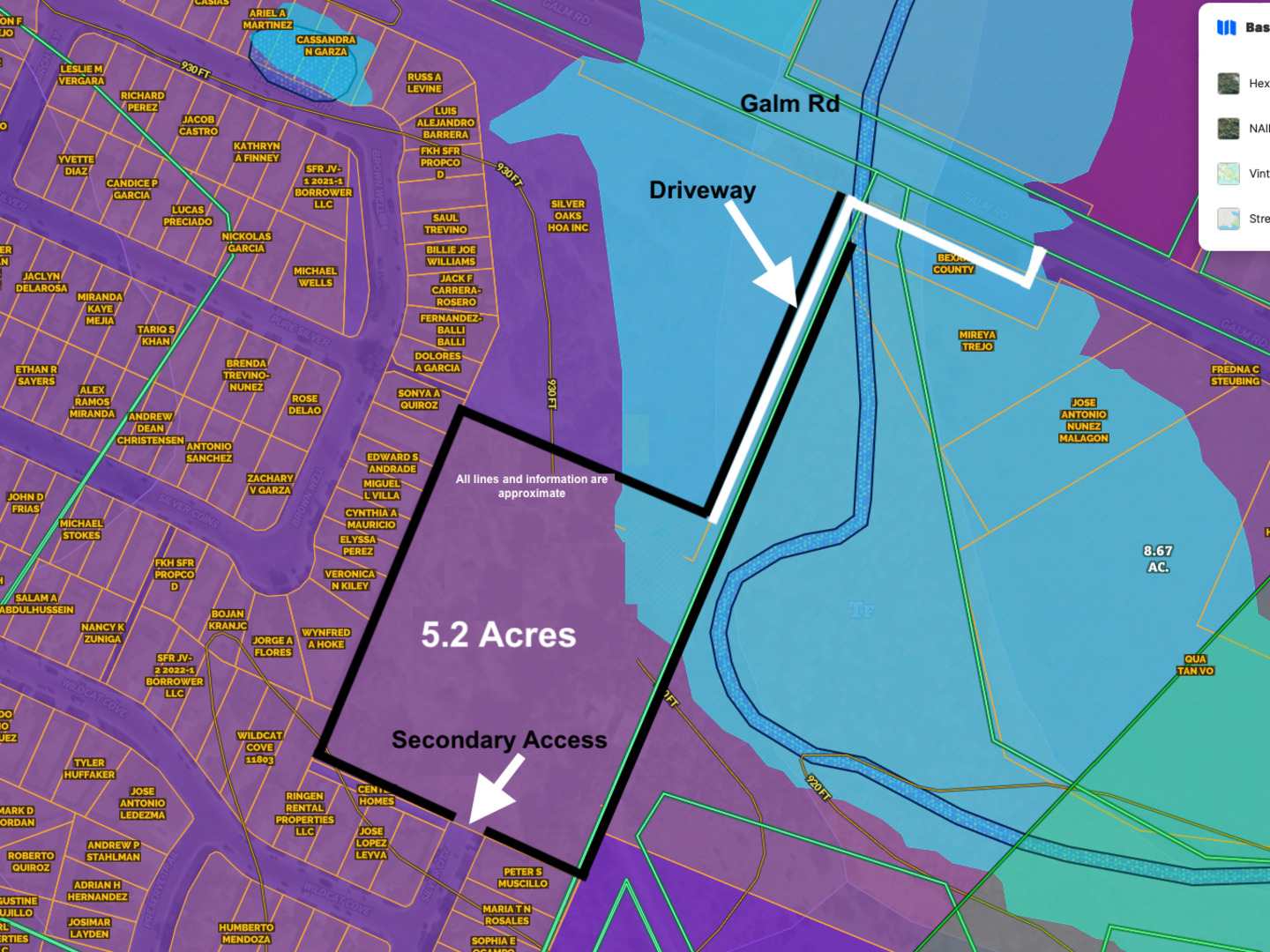 5.260 Acres zoned OCL (out of city limits). City water and electricity are available. Once a family homestead, it now offers a perfect opportunity for development. Located adjacent to the Silver Oaks Subdivision. Dual access points off Galm Road and Silver City Rd. Level and very buildable.