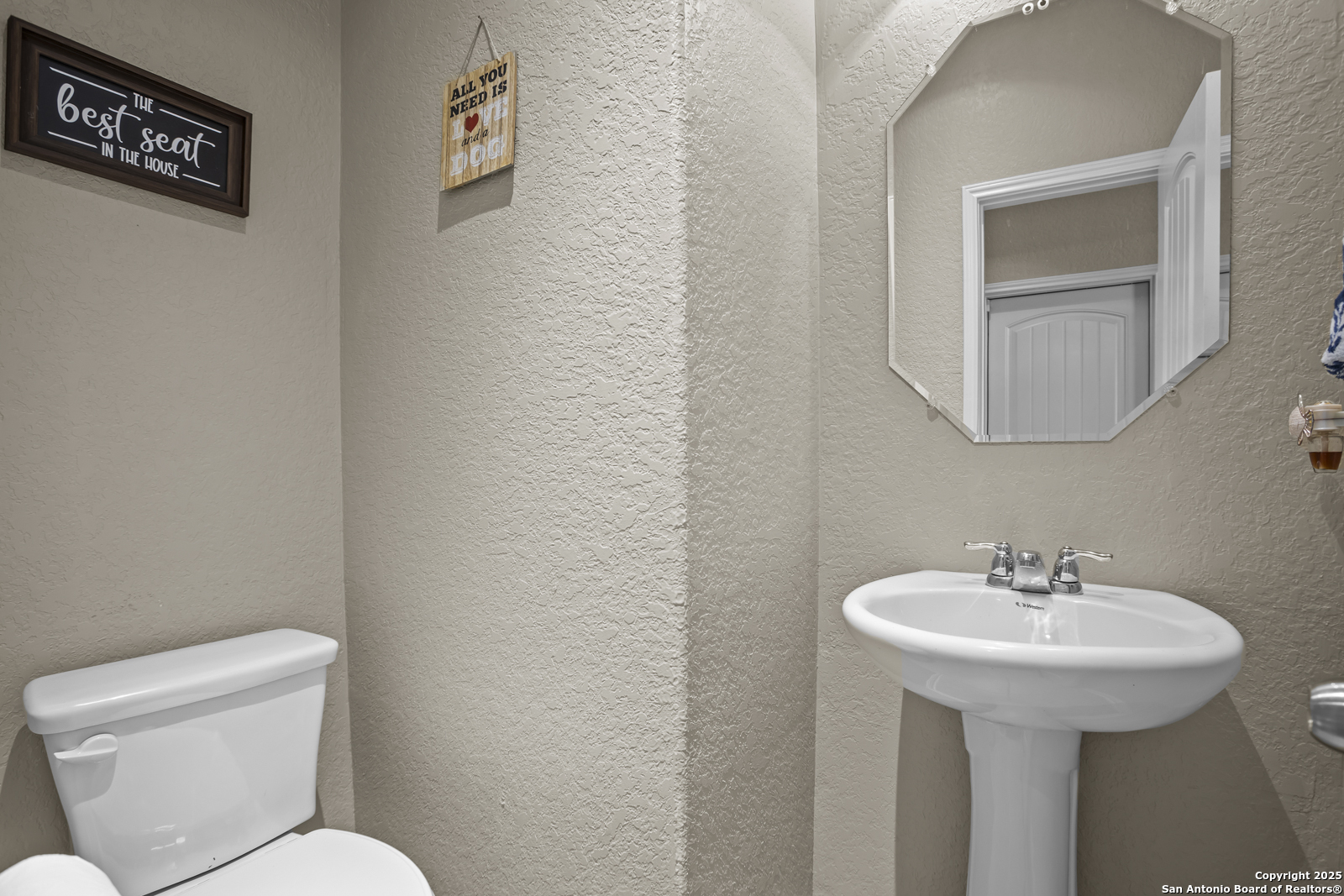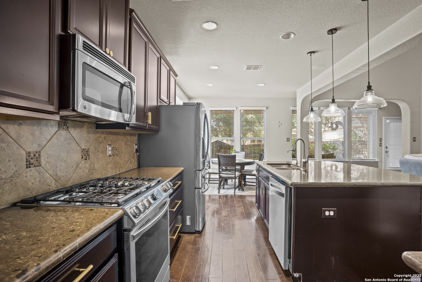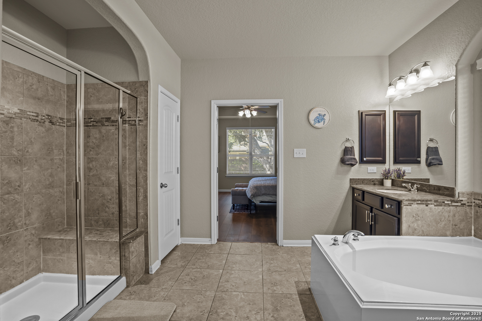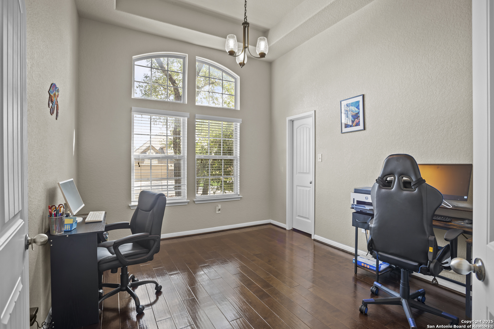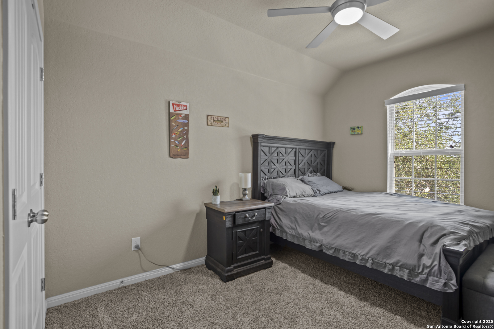 Welcome to this stunning 4-bedroom, 2.5-bathroom home located on the west side of San Antonio, near the vibrant Alamo Ranch dining and shopping district. Upon entering, you'll find a private office at the front of the house-perfect for working away from the main living areas. Next, a spacious dining room seamlessly connects to the kitchen, making it ideal for hosting gatherings. The grand kitchen boasts granite countertops, ample cabinet space, a large island, and gas cooking on a range stove with built-in stainless steel appliances. The adjacent living room features high ceilings and an abundance of natural light, offering a comfortable space for relaxing and entertaining. The downstairs master suite, located just off the living room, also enjoys high ceilings and plenty of natural light. The ensuite bath includes a double vanity, a separate shower and tub, and a walk-in closet. Upstairs, you'll be welcomed by an expansive loft that connects the remaining bedrooms, ensuring a great flow throughout the upper level. In the backyard, a large covered patio awaits, complete with ceiling fans for added comfort as well as stone walkways through the backyard.
