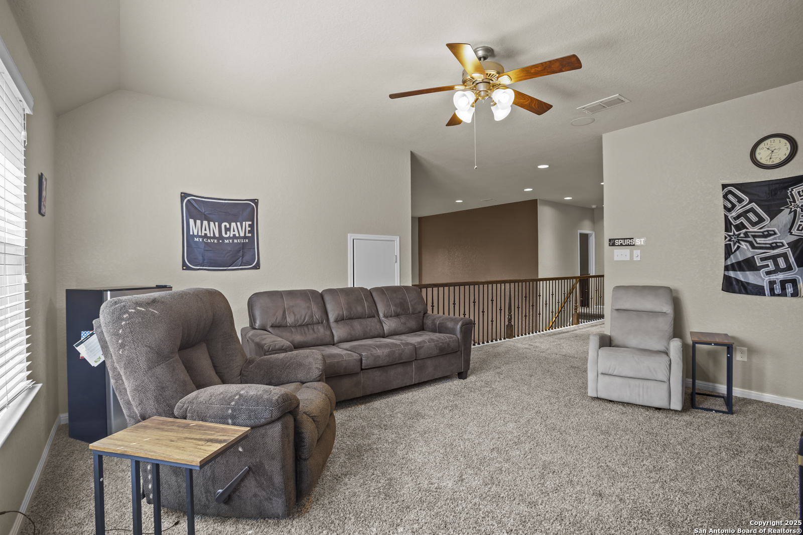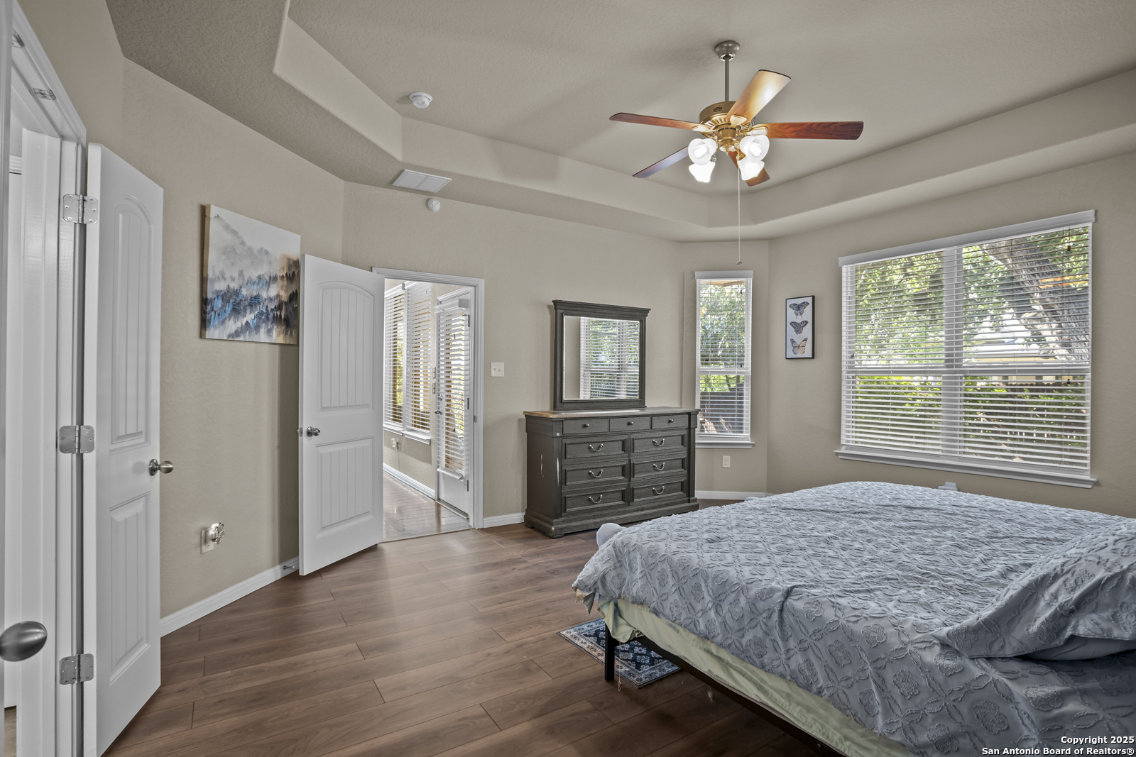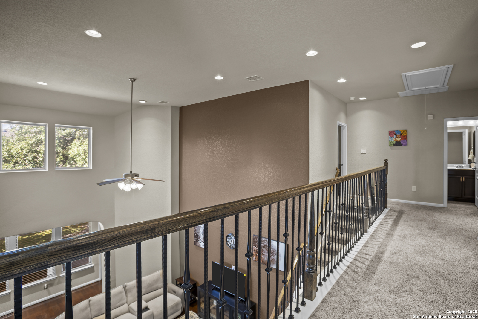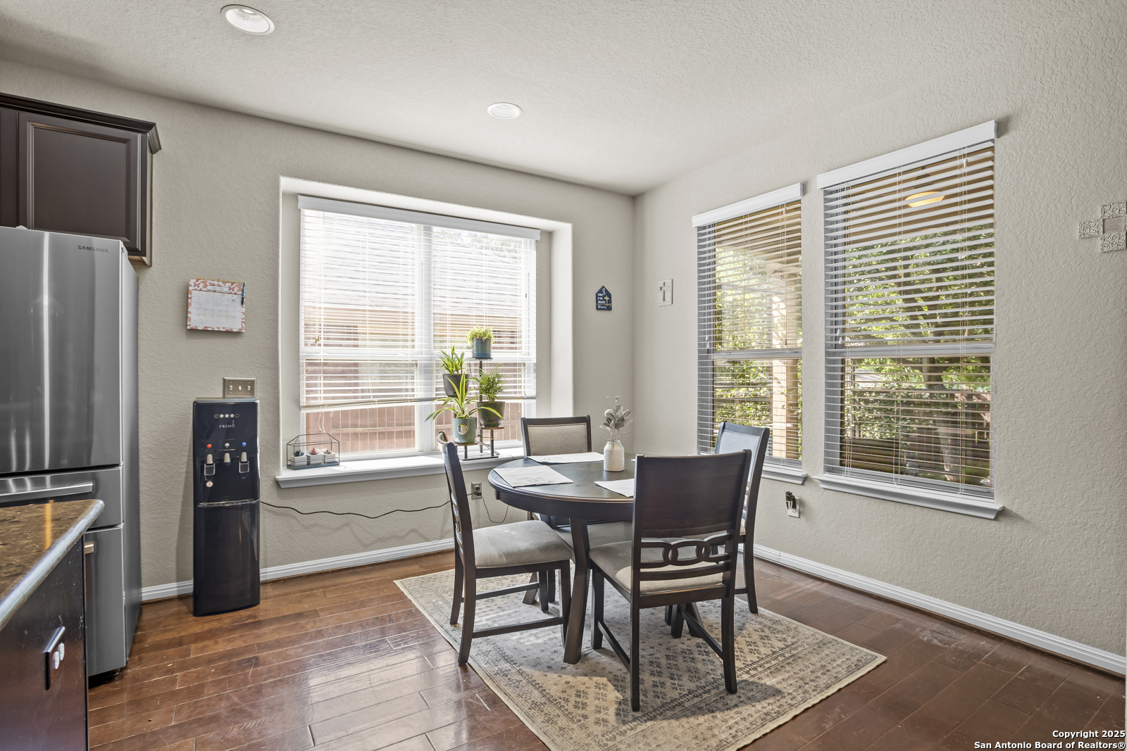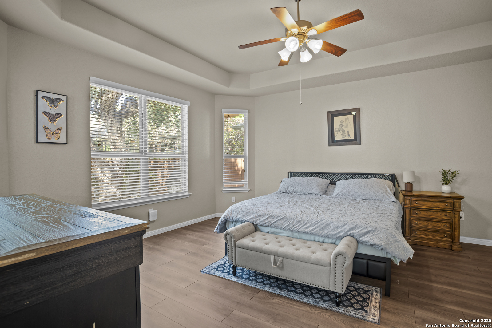 Welcome to this stunning 4-bedroom, 2.5-bathroom home located on the west side of San Antonio, near the vibrant Alamo Ranch dining and shopping district. Upon entering, you'll find a private office at the front of the house-perfect for working away from the main living areas. Next, a spacious dining room seamlessly connects to the kitchen, making it ideal for hosting gatherings. The grand kitchen boasts granite countertops, ample cabinet space, a large island, and gas cooking on a range stove with built-in stainless steel appliances. The adjacent living room features high ceilings and an abundance of natural light, offering a comfortable space for relaxing and entertaining. The downstairs master suite, located just off the living room, also enjoys high ceilings and plenty of natural light. The ensuite bath includes a double vanity, a separate shower and tub, and a walk-in closet. Upstairs, you'll be welcomed by an expansive loft that connects the remaining bedrooms, ensuring a great flow throughout the upper level. In the backyard, a large covered patio awaits, complete with ceiling fans for added comfort as well as stone walkways through the backyard.