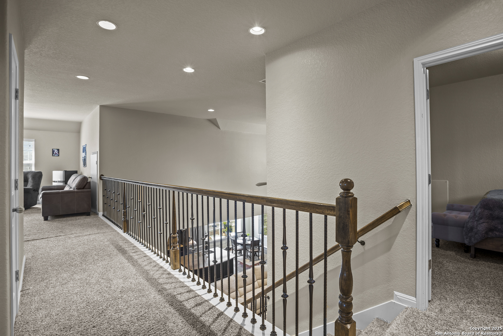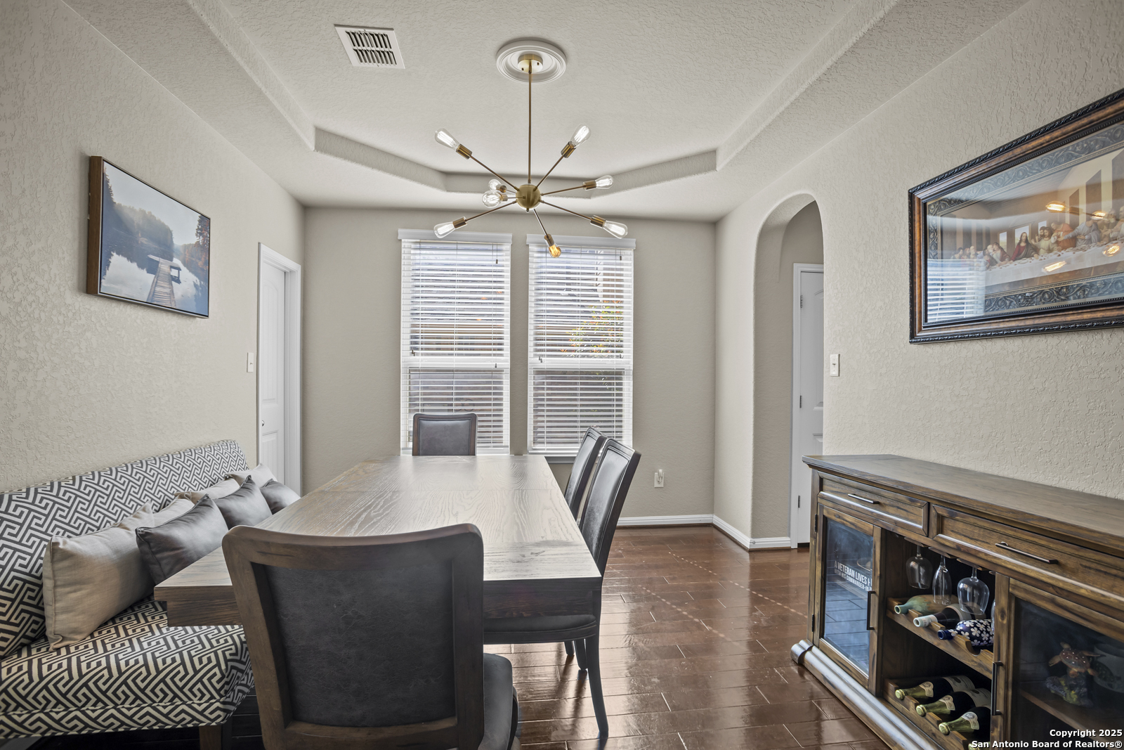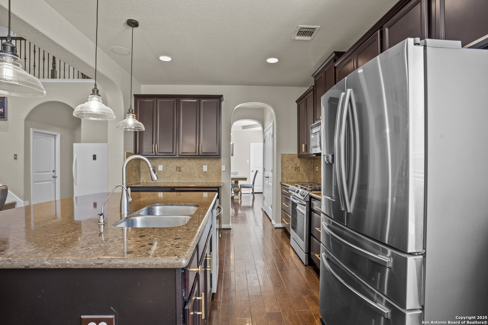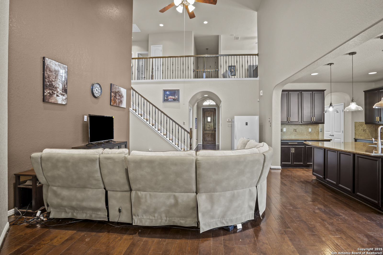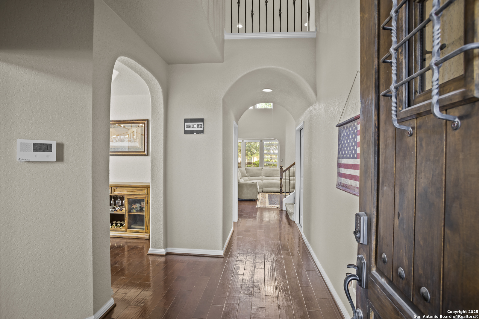 Welcome to this stunning 4-bedroom, 2.5-bathroom home located on the west side of San Antonio, near the vibrant Alamo Ranch dining and shopping district. Upon entering, you'll find a private office at the front of the house-perfect for working away from the main living areas. Next, a spacious dining room seamlessly connects to the kitchen, making it ideal for hosting gatherings. The grand kitchen boasts granite countertops, ample cabinet space, a large island, and gas cooking on a range stove with built-in stainless steel appliances. The adjacent living room features high ceilings and an abundance of natural light, offering a comfortable space for relaxing and entertaining. The downstairs master suite, located just off the living room, also enjoys high ceilings and plenty of natural light. The ensuite bath includes a double vanity, a separate shower and tub, and a walk-in closet. Upstairs, you'll be welcomed by an expansive loft that connects the remaining bedrooms, ensuring a great flow throughout the upper level. In the backyard, a large covered patio awaits, complete with ceiling fans for added comfort as well as stone walkways through the backyard.