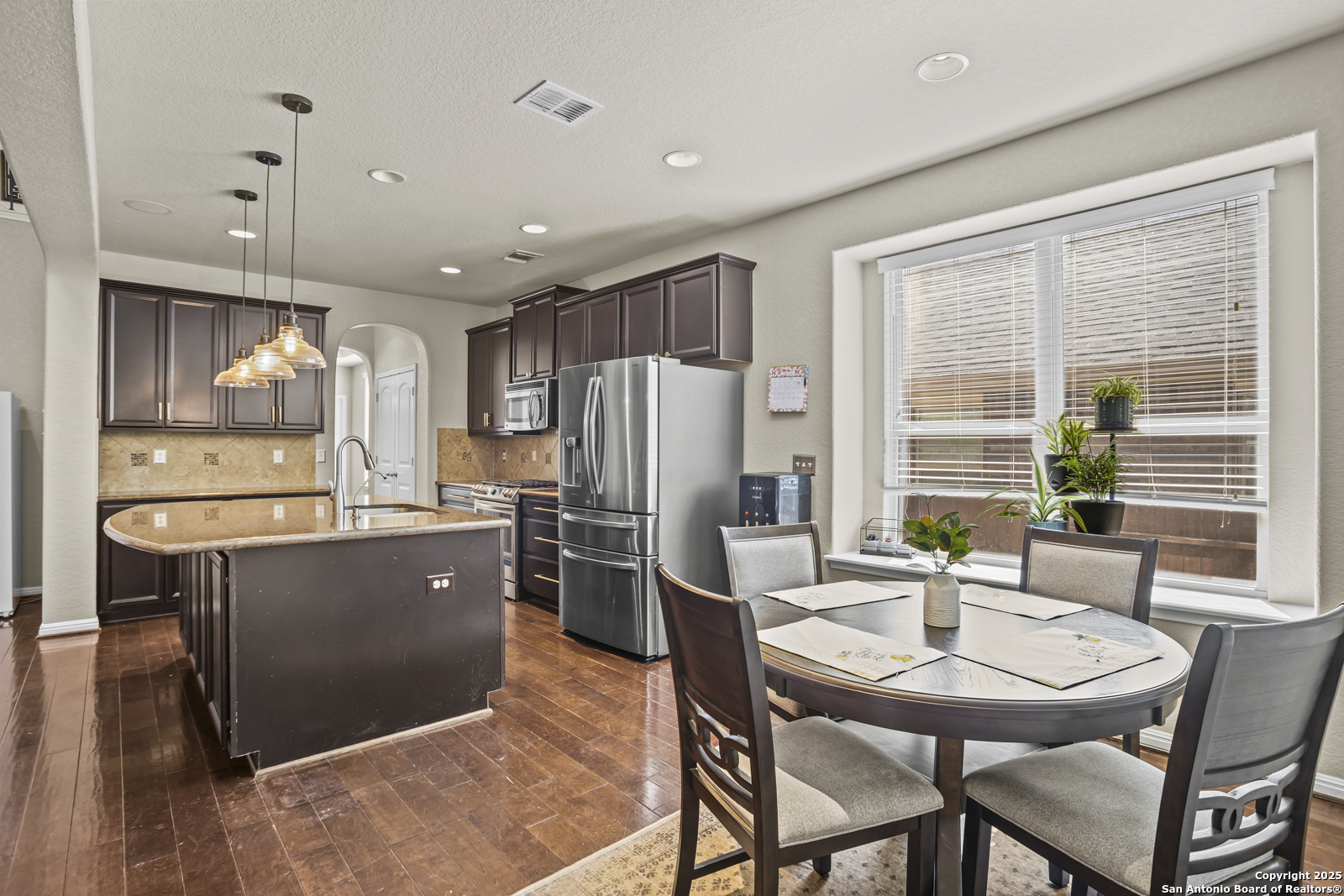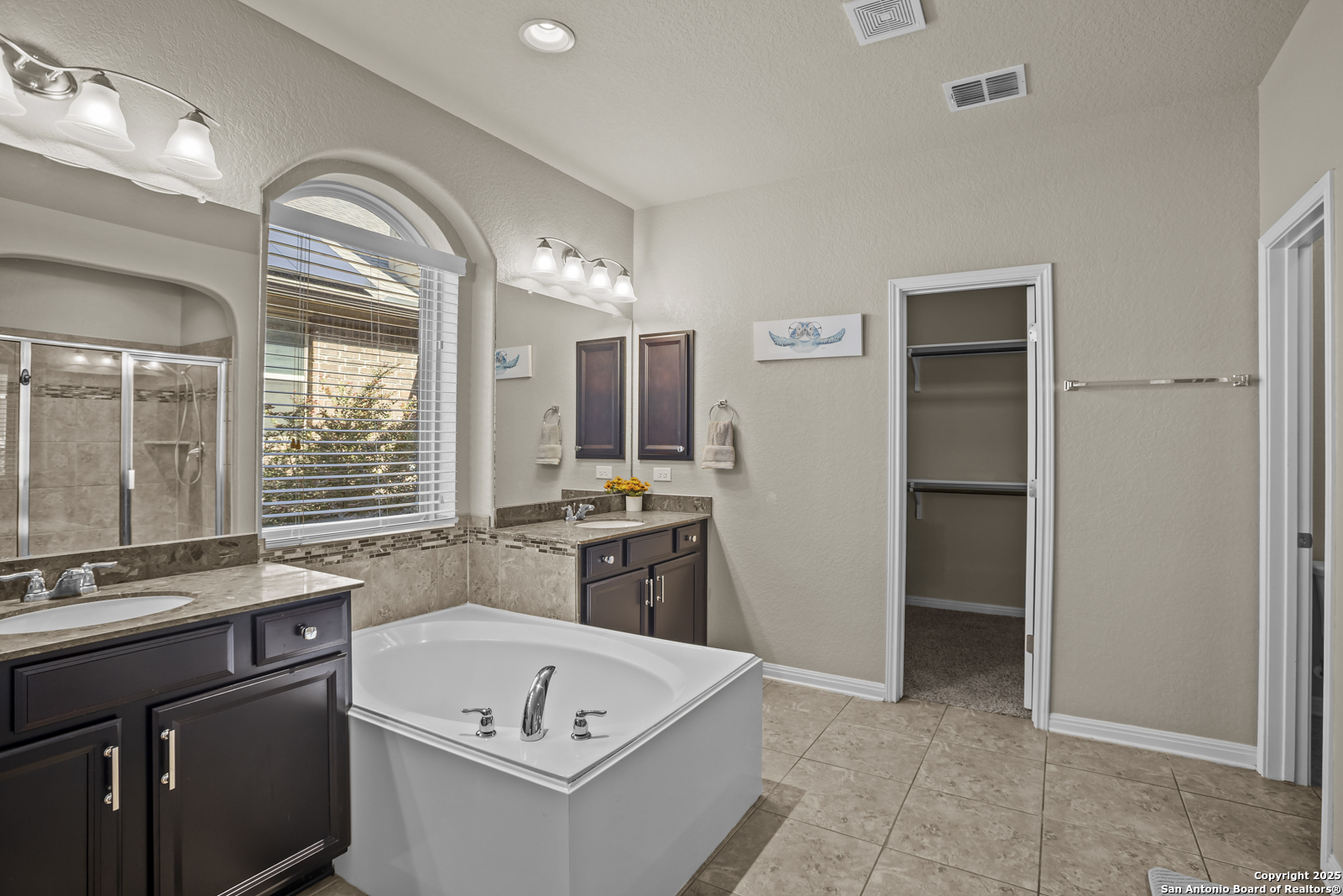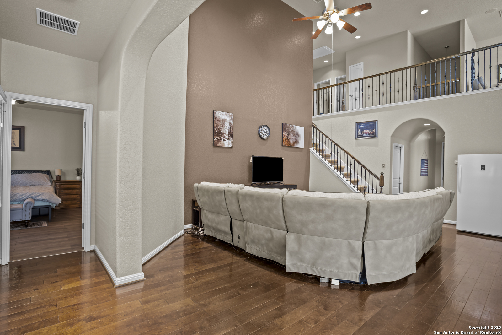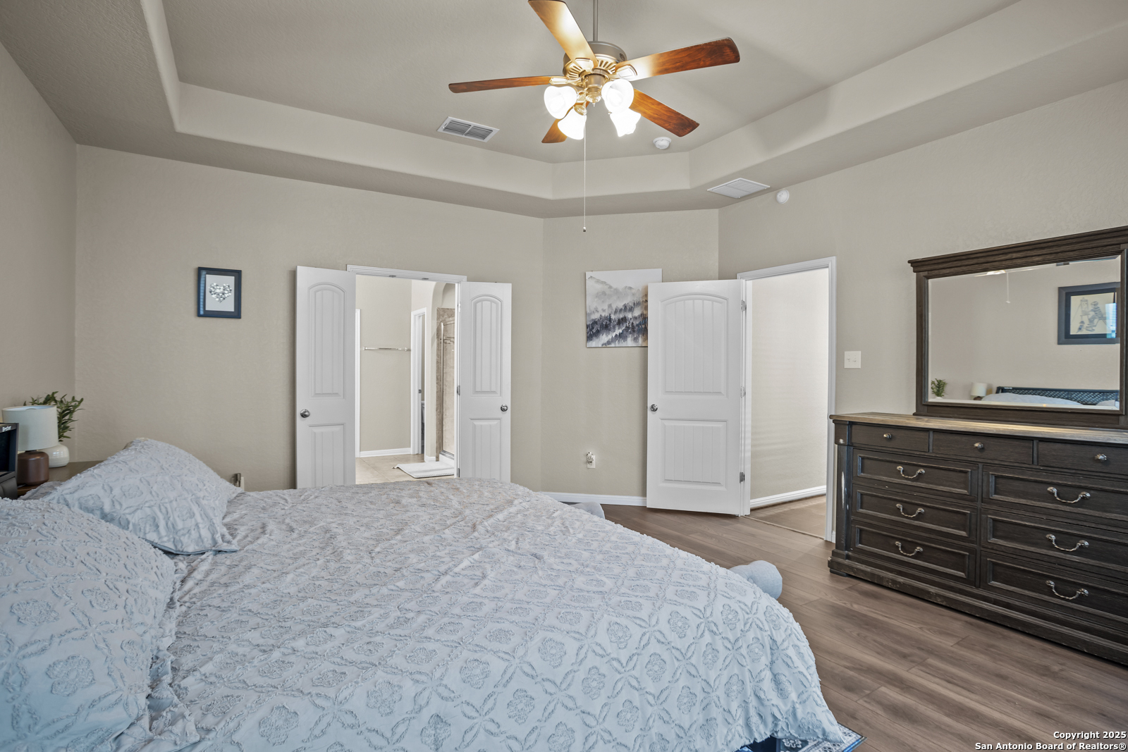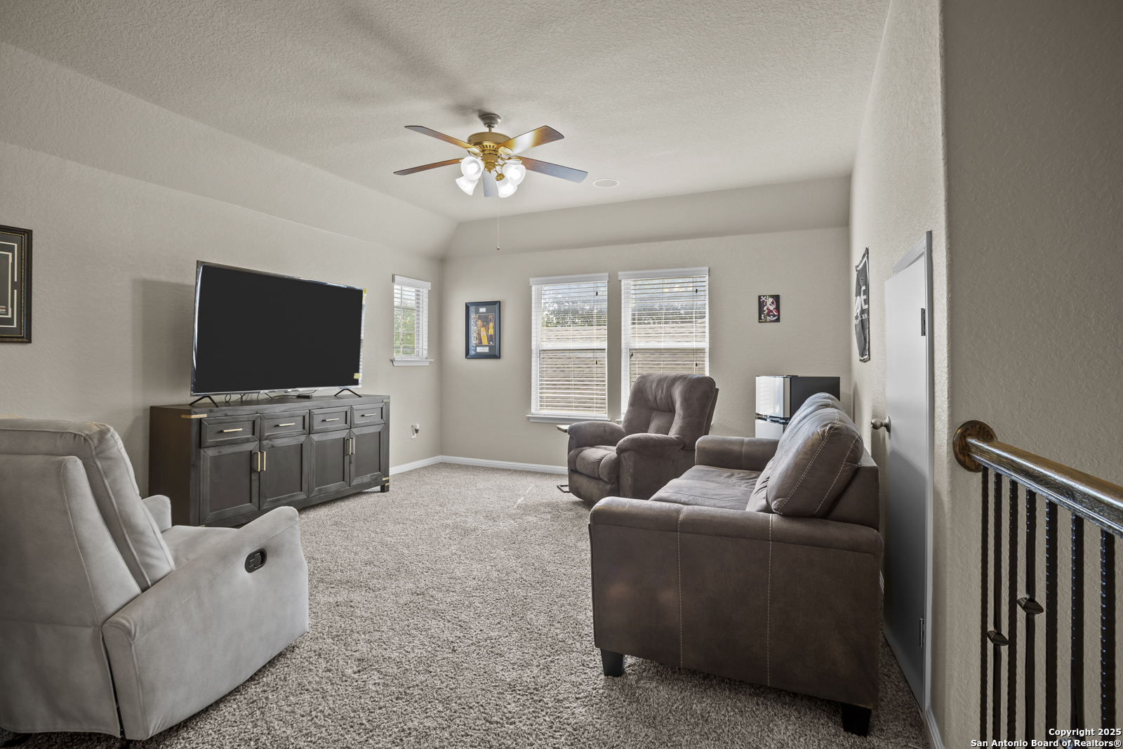 Welcome to this stunning 4-bedroom, 2.5-bathroom home located on the west side of San Antonio, near the vibrant Alamo Ranch dining and shopping district. Upon entering, you'll find a private office at the front of the house-perfect for working away from the main living areas. Next, a spacious dining room seamlessly connects to the kitchen, making it ideal for hosting gatherings. The grand kitchen boasts granite countertops, ample cabinet space, a large island, and gas cooking on a range stove with built-in stainless steel appliances. The adjacent living room features high ceilings and an abundance of natural light, offering a comfortable space for relaxing and entertaining. The downstairs master suite, located just off the living room, also enjoys high ceilings and plenty of natural light. The ensuite bath includes a double vanity, a separate shower and tub, and a walk-in closet. Upstairs, you'll be welcomed by an expansive loft that connects the remaining bedrooms, ensuring a great flow throughout the upper level. In the backyard, a large covered patio awaits, complete with ceiling fans for added comfort as well as stone walkways through the backyard.