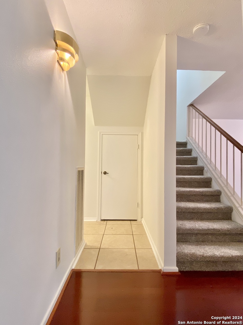 READY to move-in. Security guard gated community, garden home on a greenbelt. Well maintained 4 bedroom/2.5 baths/2 car garage. Master bedroom downstairs, all bathrooms with granite and updated cabinets, carpet only on stairs, upstairs bedrooms and hall, measurements are approximate. Downstairs has wood floor and ceramic tile. Separate Dining Area, kitchen has a peninsula with breakfast bar, granite countertops, refrigerator. Nice deck with sliding door from breakfast area. Amenities include Club House, swimming pool, picnic area. Near shopping and restaurants.