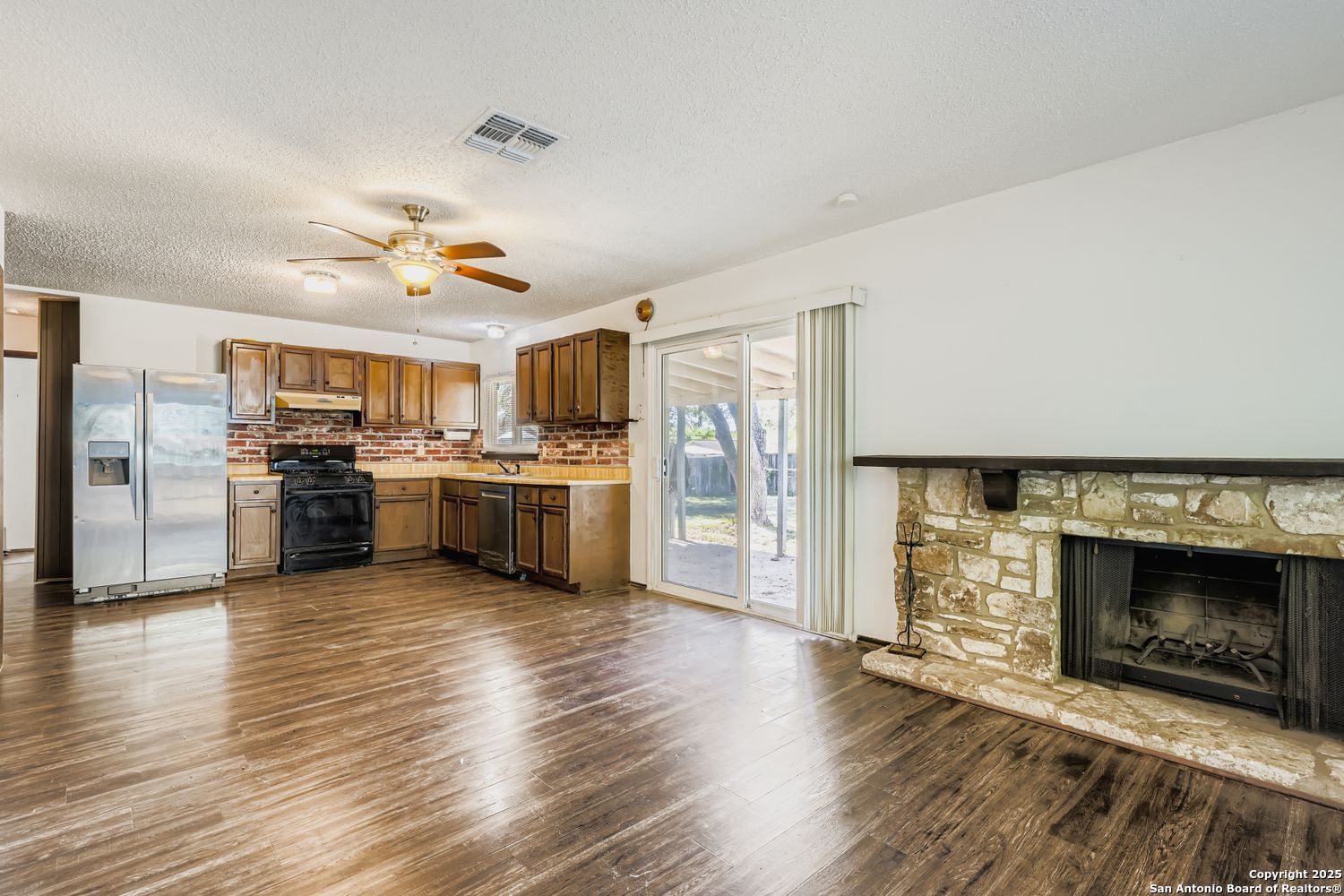 Step into a home that truly stands apart. where character, quality, and care come together seamlessly. Perfectly situated in the peaceful and established community of Live Oak Village, this beautifully maintained residence offers a blend of classic Texas charm and modern comfort, just minutes from Randolph Air Force Base, Fort Sam Houston, and the premier shopping and dining at The Forum at Olympia Parkway. From the moment you enter, the attention to detail is undeniable. Rich, updated wood flooring flows throughout the main living areas, creating a warm and refined atmosphere. The spacious living room showcases an oversized natural rock fireplace with a thick live-edge wood mantle, adding both grandeur and rustic elegance. It's a space designed for relaxing evenings or entertaining in style. The kitchen is a perfect mix of vintage charm and modern functionality, featuring a classic exposed brick backsplash and gas cooking, ideal for culinary enthusiasts. Every element feels intentional, blending personality and practicality in equal measure. This home has been exceptionally well maintained inside and out. It comes complete with warranties on major appliances and detailed maintenance records, including regular A/C servicing and system checks, giving you confidence in its long-term reliability. Pride of ownership is evident in every corner. Set on an oversized lot, the property features a huge backyard with mature trees and a covered patio, offering plenty of space for entertaining, gardening, or future expansion. Whether you envision peaceful evenings outdoors or hosting gatherings with friends and family, this backyard delivers both beauty and possibility. Residents of Live Oak Village enjoy tree-lined streets, community parks, walking trails, and an inviting neighborhood feel, all with easy access to I-35, Loop 1604, Morgan's Wonderland, Retama Park, and Live Oak Lake Park. Whether you're searching for a gracefully maintained primary home, a turnkey rental investment, or a high-upside renovation opportunity, 11817 Splintered Oak offers the best of all worlds. With its unmatched blend of craftsmanship, care, and location, this home is truly one of Live Oak's finest hidden gems. Experience the pride, peace of mind, and potential that only a home like this can offer.