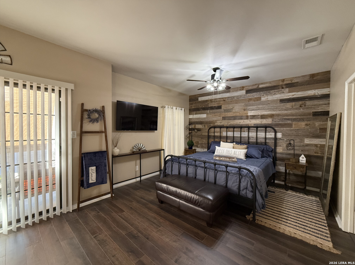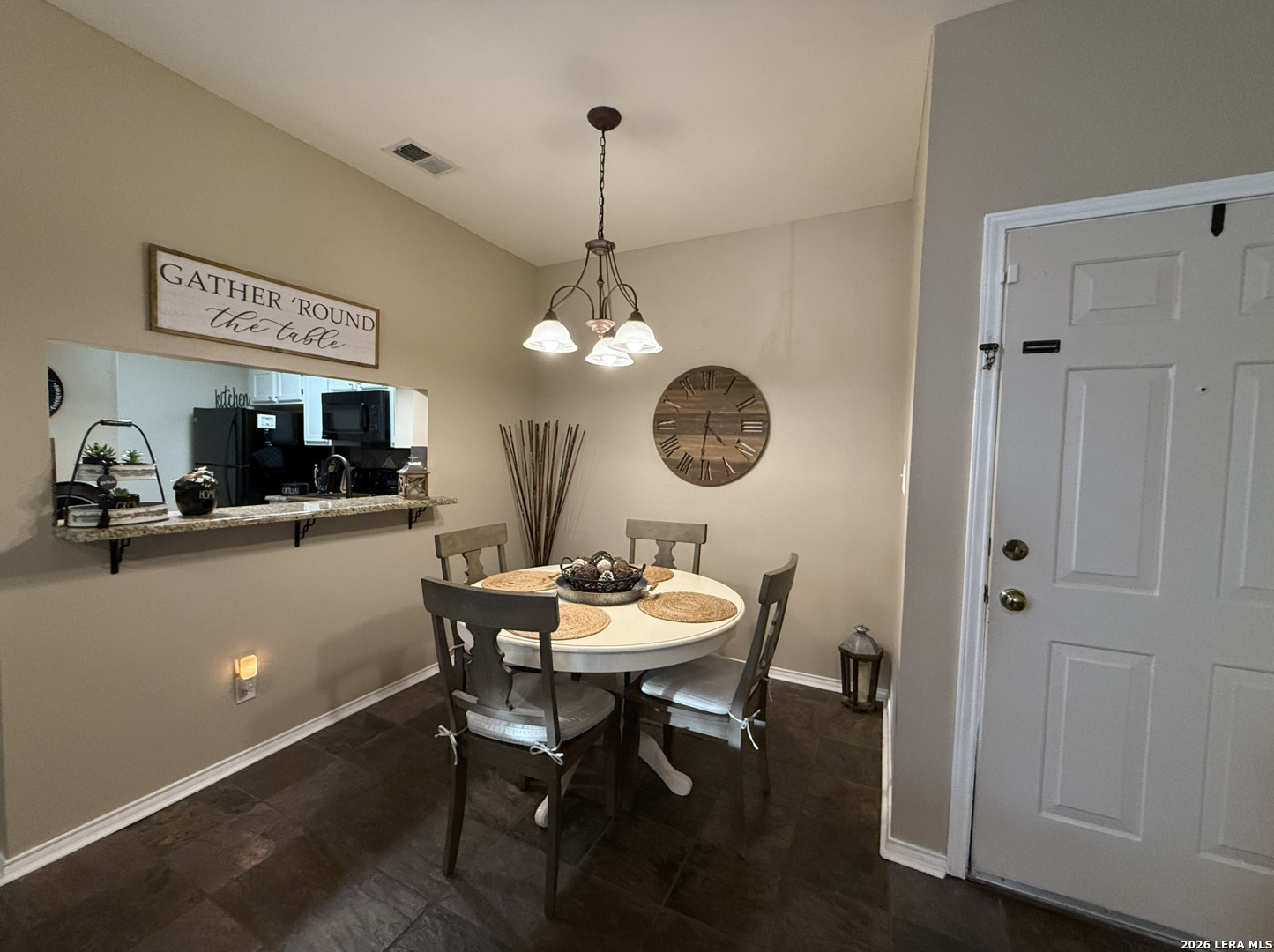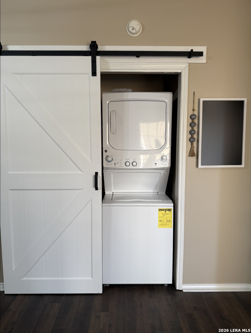Welcome to this charming one-bedroom, one-bathroom rustic-style condo, thoughtfully upgraded to offer both style and comfort. As you enter, you'll find beautiful slate tile flooring in the hall, kitchen, and dining area, creating a warm and inviting feel. The living area, bedroom, bathroom and walk-in closet feature brand new vinyl plank flooring, adding a touch of modern elegance to the rustic design. The kitchen offers granite countertops, a sleek new matte black faucet, and all appliances included, making it ready for all your culinary adventures. The cozy bedroom is a standout with its reclaimed wood accent wall, a built-in bookcase, and a stylish new barn door closes off the washer and dryer area, keeping everything tidy and adding a rustic touch. Solar screen panels provide energy efficiency, and the included washer and dryer make this home completely move-in ready. Plus, this condo includes a one-car garage, offering both convenience and extra storage. With these thoughtful upgrades and unique touches, this condo is a perfect blend of rustic charm and modern convenience-ready to welcome you home.