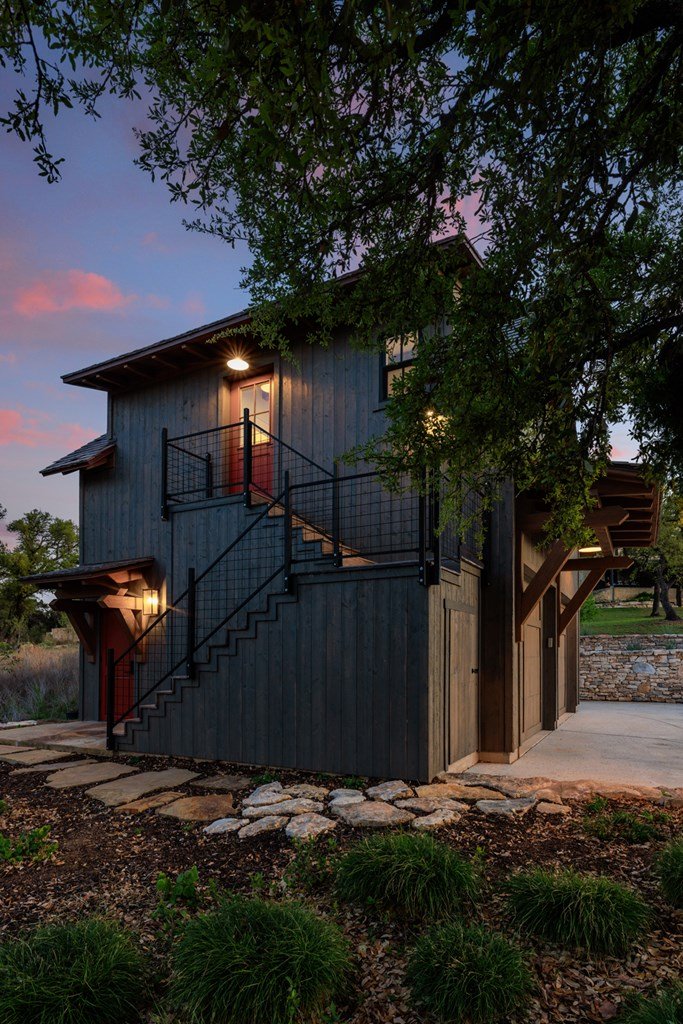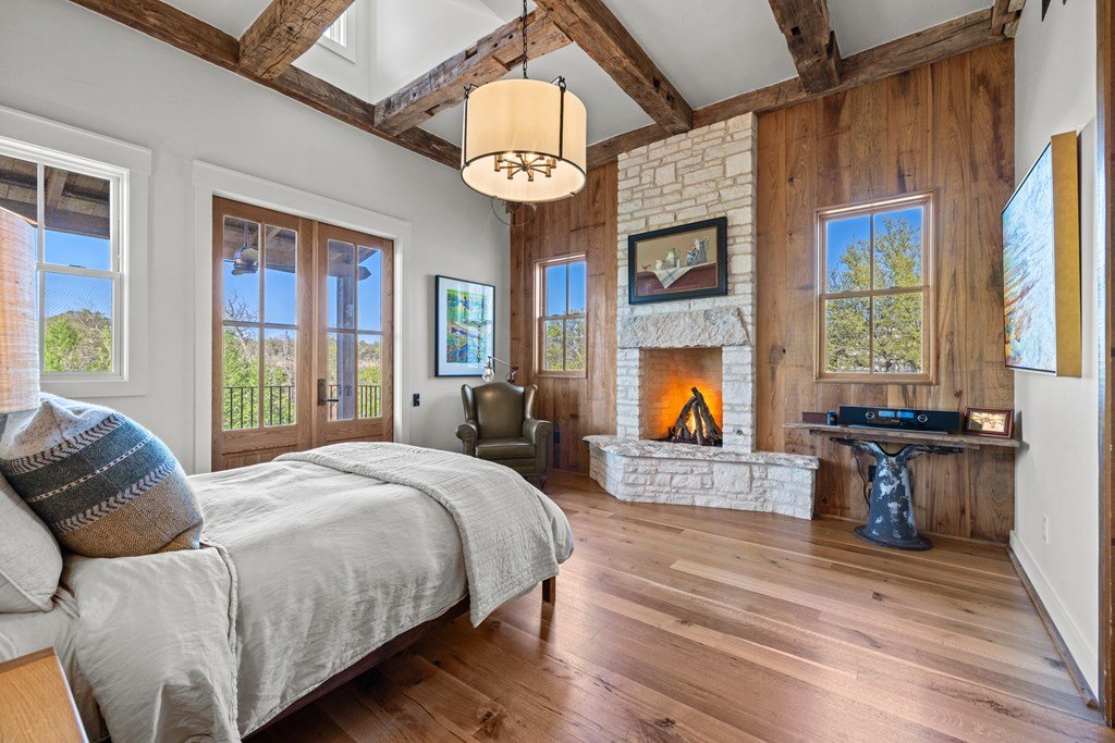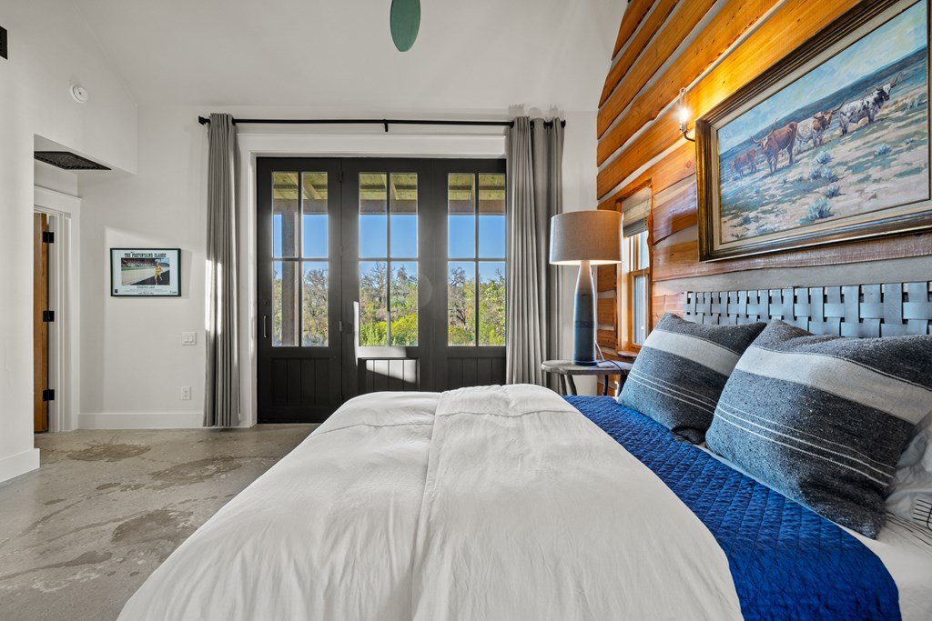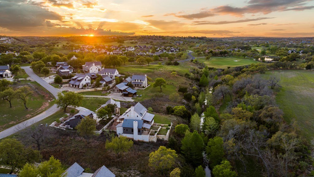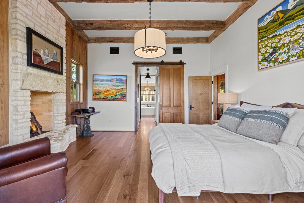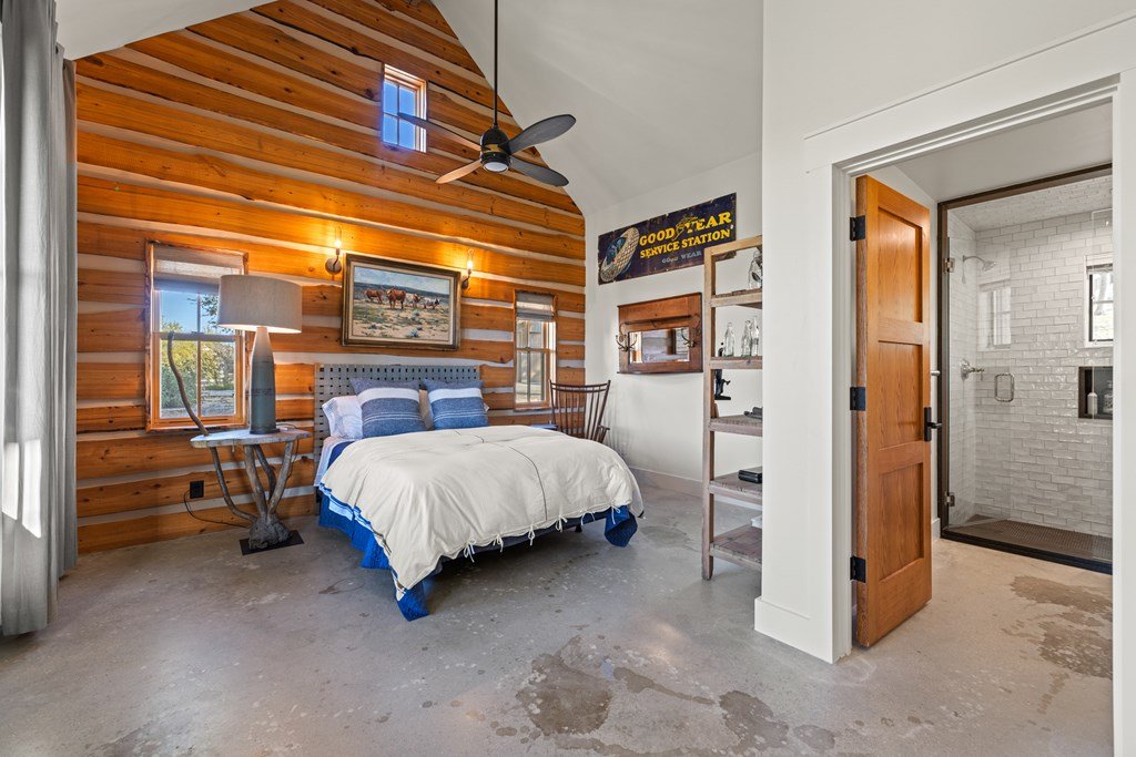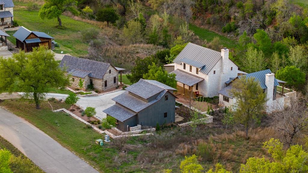 This beautifully designed residence in the Overlook Cabins at Boot Ranch reflects 19th-century Fredericksburg charm and features an authentic log cabin from a Pennsylvania dairy farm (circa 1800s). The residence, located along Palo Alto Creek, includes two bedrooms with ensuites and an additional guest bath. Built with reclaimed timbers, cypress, and longleaf pine, it showcases a floor-to-ceiling limestone fireplace and white oak flooring. The open-concept kitchen and living area, perfect for entertaining, features premium Wolf appliances, a six-burner gas range, an extensive island, and a spacious butler pantry. The combination of wood and native stone faades enhances the dining area, merging modern elements with historical materials. Details such as the hand-crimped ridges on the standing seam roof, unique copper details, and the porch roofs are crafted with fireproof Endurashake shingles prove attention to detail. The barn-style detached garage accommodates two cars and a golf cart, above offering a one-bedroom ensuite for privacy. Additionally there is the log cabin with two bedrooms and two full baths, providing further bedroom accommodations. Boot Ranch is a gated community exclusive to its members with multi-generational membership plans. The community includes multiple lakes, award winning Golf course, amazing lodge with award winning chefs, multiple pools, tennis and pickle ball courts, the list goes on! Come be a part of this amazing community.