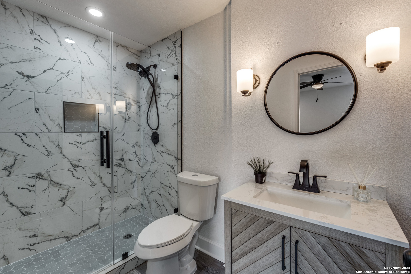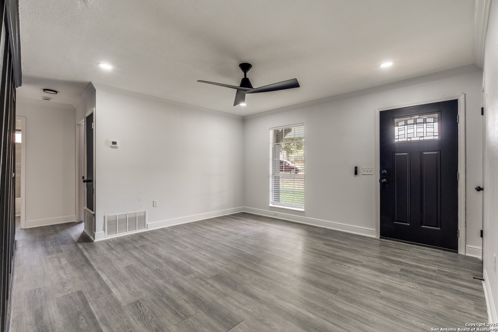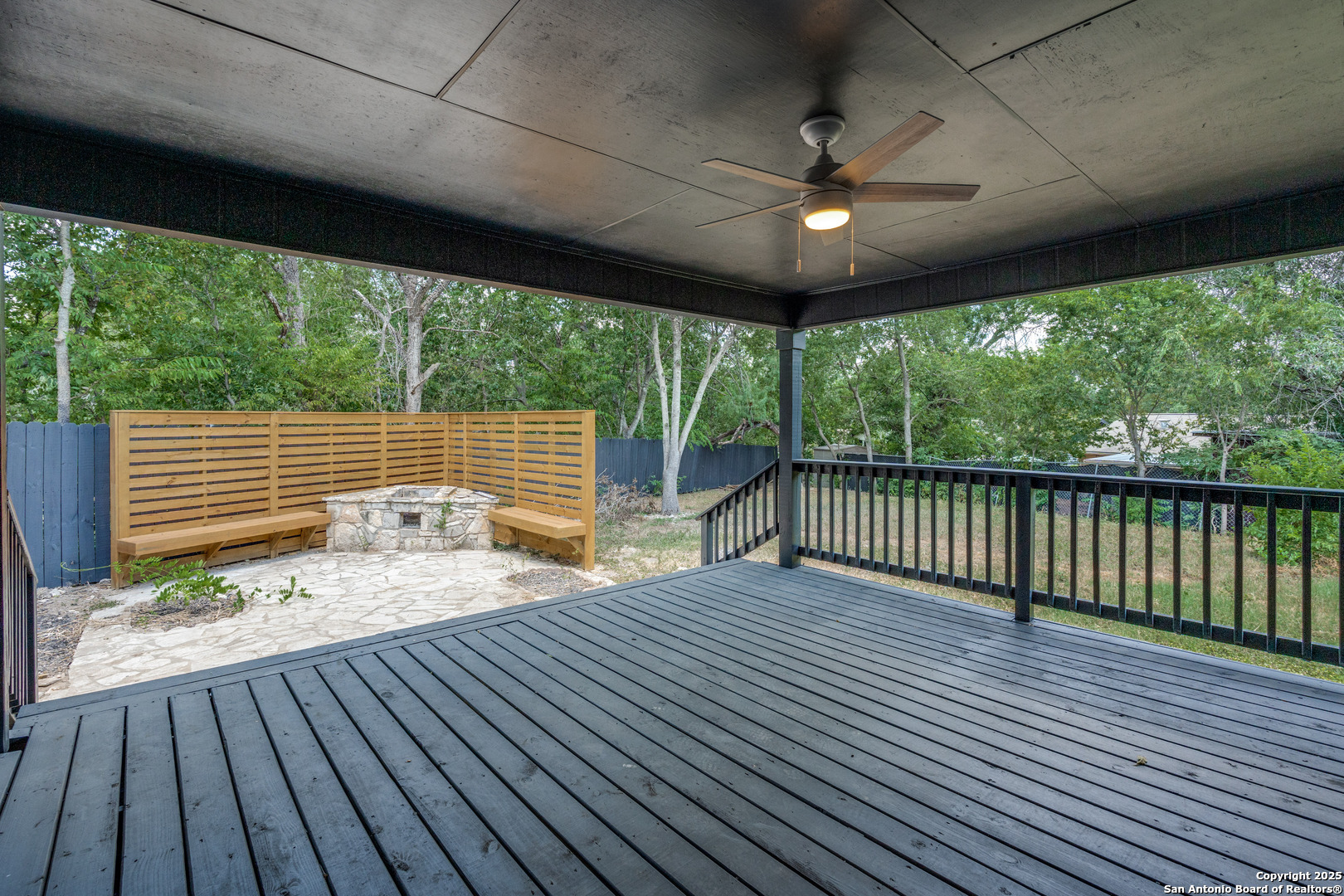 Stylish 4-bedroom, 2-bath home on a 0.25-acre lot in Northeast San Antonio. Features include vaulted ceilings, designer accent walls, and a striking black fireplace in the spacious living area. The kitchen offers quartz countertops, stainless steel appliances, and an open layout. Luxury vinyl plank flooring runs throughout. The large backyard includes a covered deck, custom bench, and stone fire pit-ideal for entertaining or relaxing.