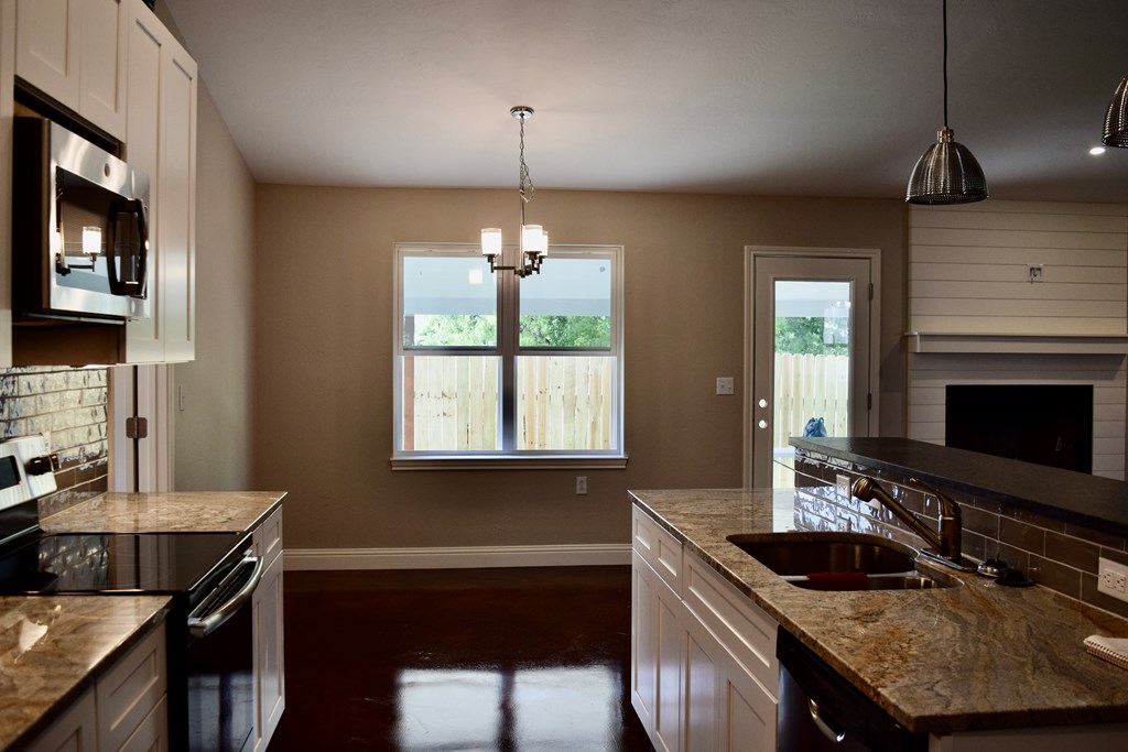Don't miss this one nearing completion. Your clients will love this quality constructed home outside the city limits in small subdivision only minutes to Kerrville amenities. Beautiful hill country style home of stone & stucco with open floor plan and split bedrooms. Very light w/double paned windows. Granite counters throughout kitchen and baths. Kitchen offers all electric stainless appliances, wired undercounter lighting, satin nickle fixtures and drawer pulls. Living room has cozy woodburning fireplace with shiplap accent. Stained concrete floors throughout home. Master suite has walk-in closet and spacious tiled walk-in shower and double sinks in bath. Lots of storage throughout home. The covered porch in fenced back yard is a spacious 21' x 10'. Perfect for outdoor dining & grilling. Oversized garage has extra space for storage. Front yard is nicely xeriscaped while back yard has grass. Texas energy efficiency rating. 15-seer multistage HVAC. Radiant barrier sheeting in attic with R-38 blown in fiberglass insulation.30-year Owens Corning Duration shingle roof.