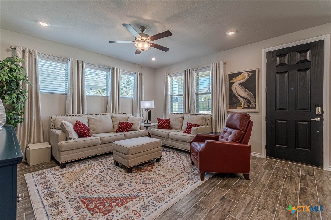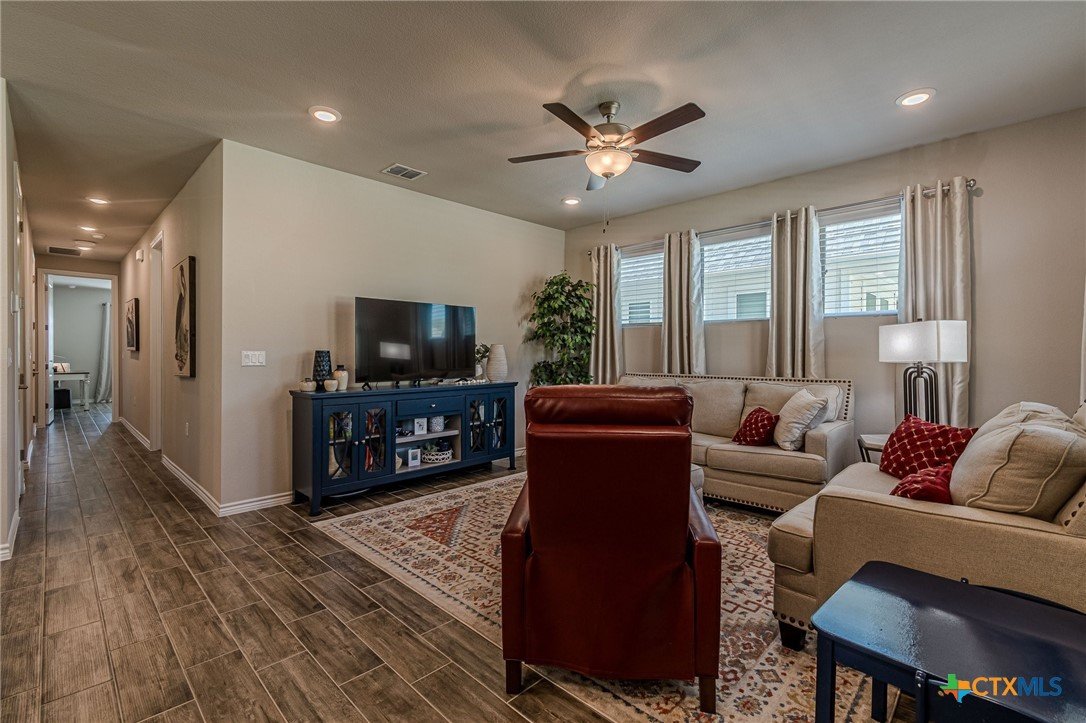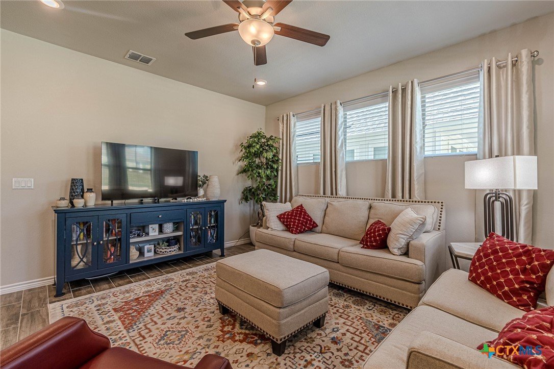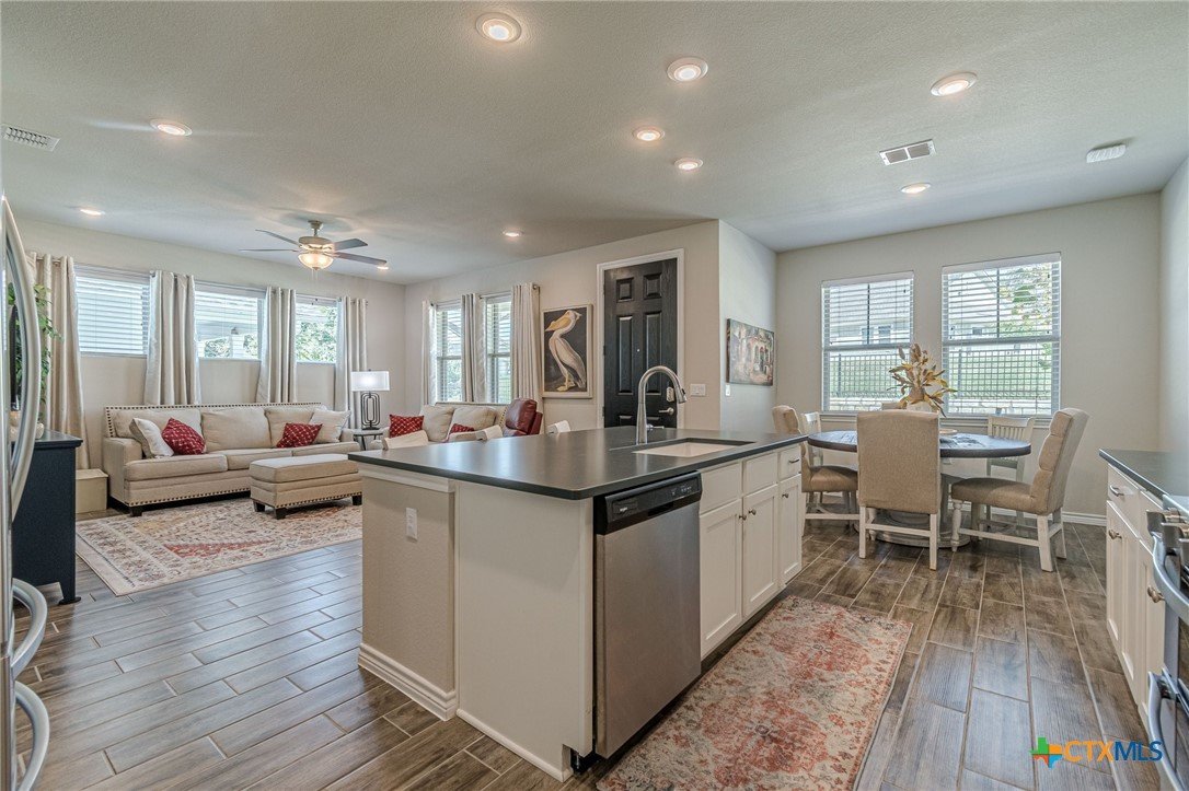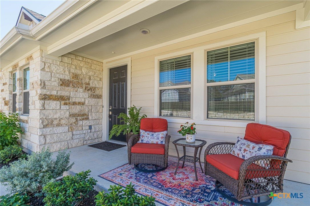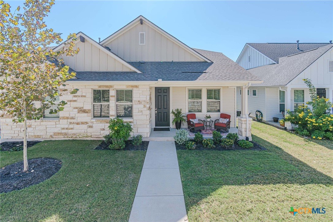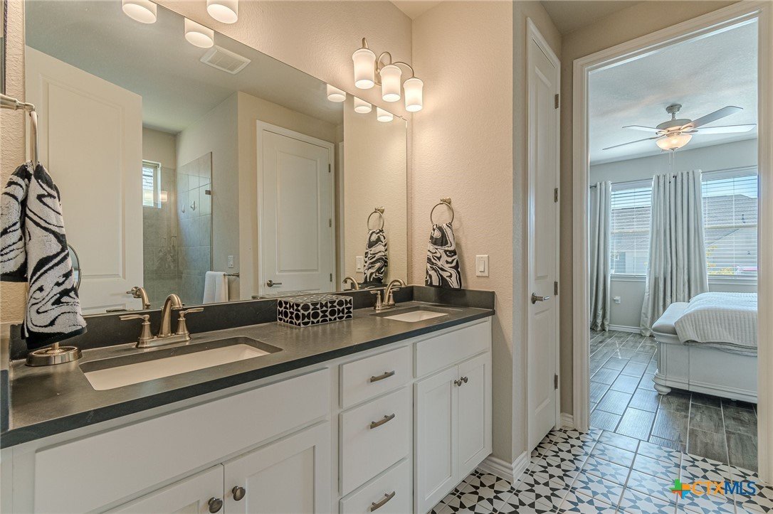 Perfect opportunity to own in this prestigious and very active 55 plus community. This Galvez floor plan offers spacious comfort, modern conveniences with lots of windows accented with beautiful and classy window treatments. Excellent neutral color scheme with ceramic tile wood look floors throughout, white cabinets with beautiful contrasting dark quartz countertops. Large main bedroom offers multiple furniture placement options with natural light. Main bathroom has dual vanities and a large oversized walk in shower. This location offers a short walk to the fitness center, community restaurant, and community swimming pools. These villas offer 24 hour security and a guard gated community with several outdoor enjoyment areas including built in bbq pits and quaint areas for relaxing, views, and enjoying your best life in this unmatched community. Exterior landscape maintained by HOA.