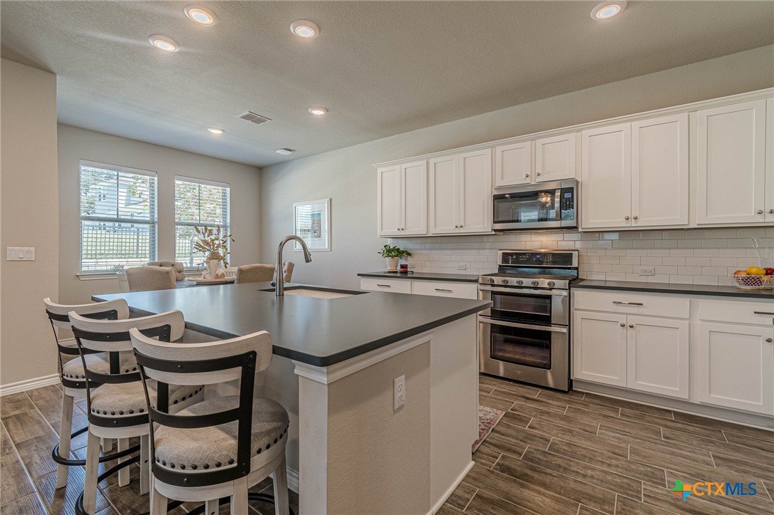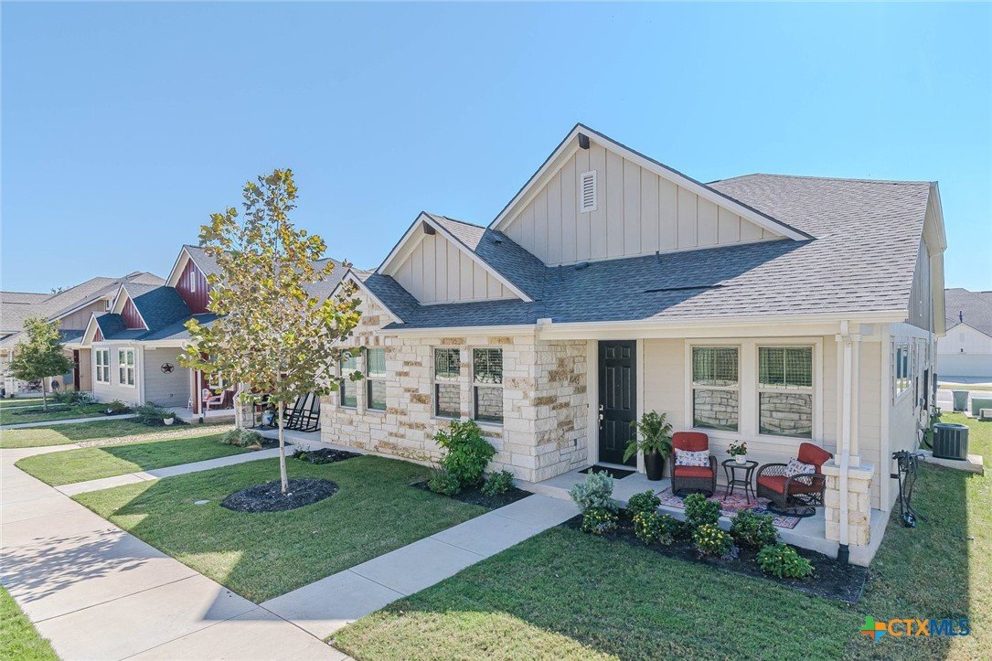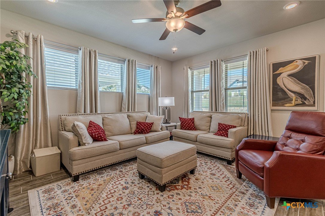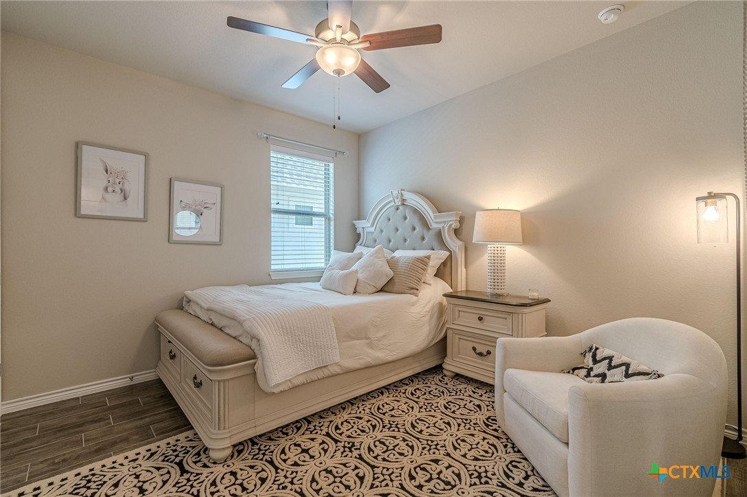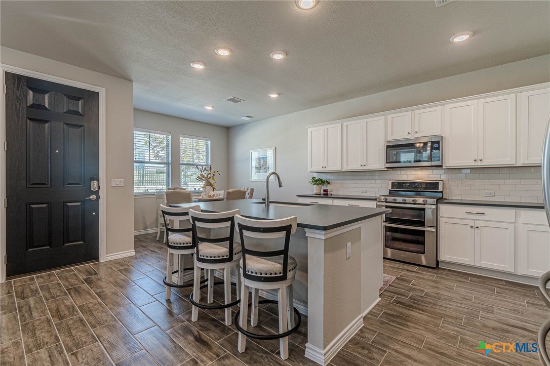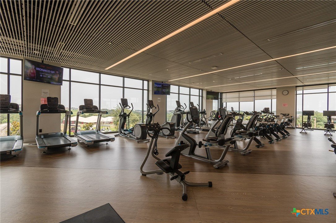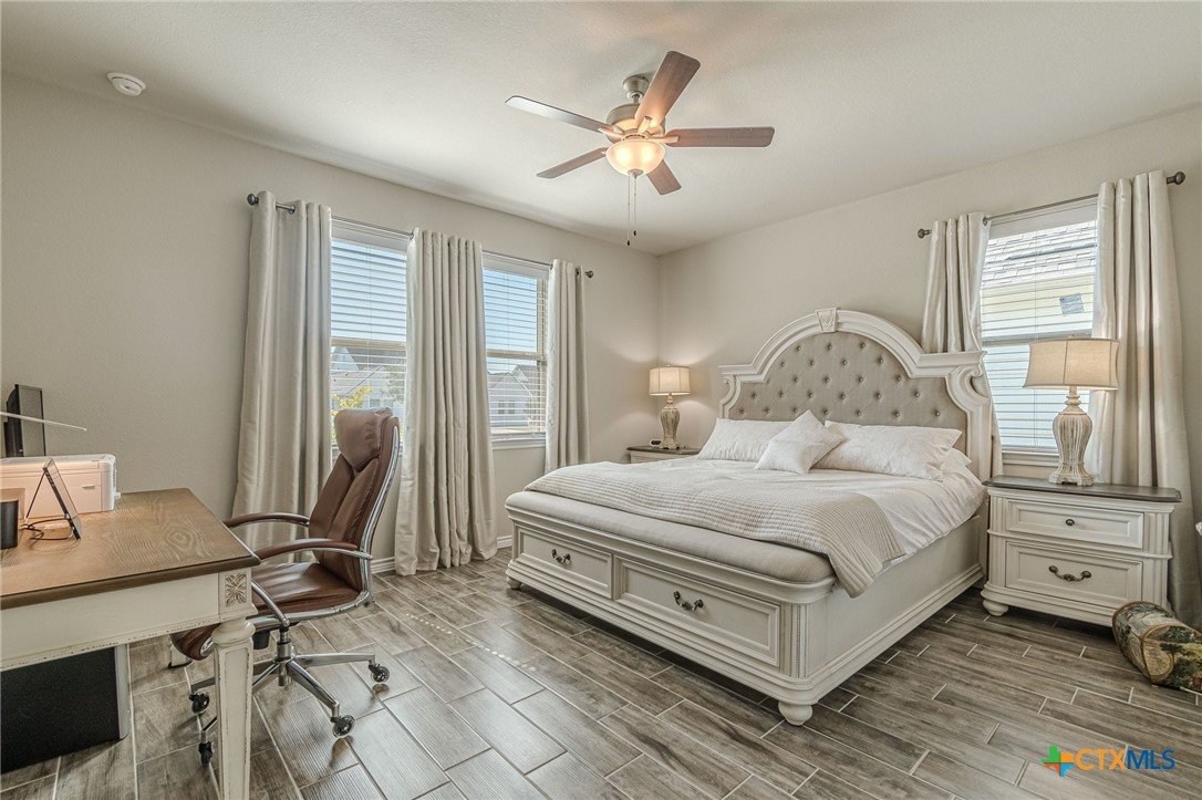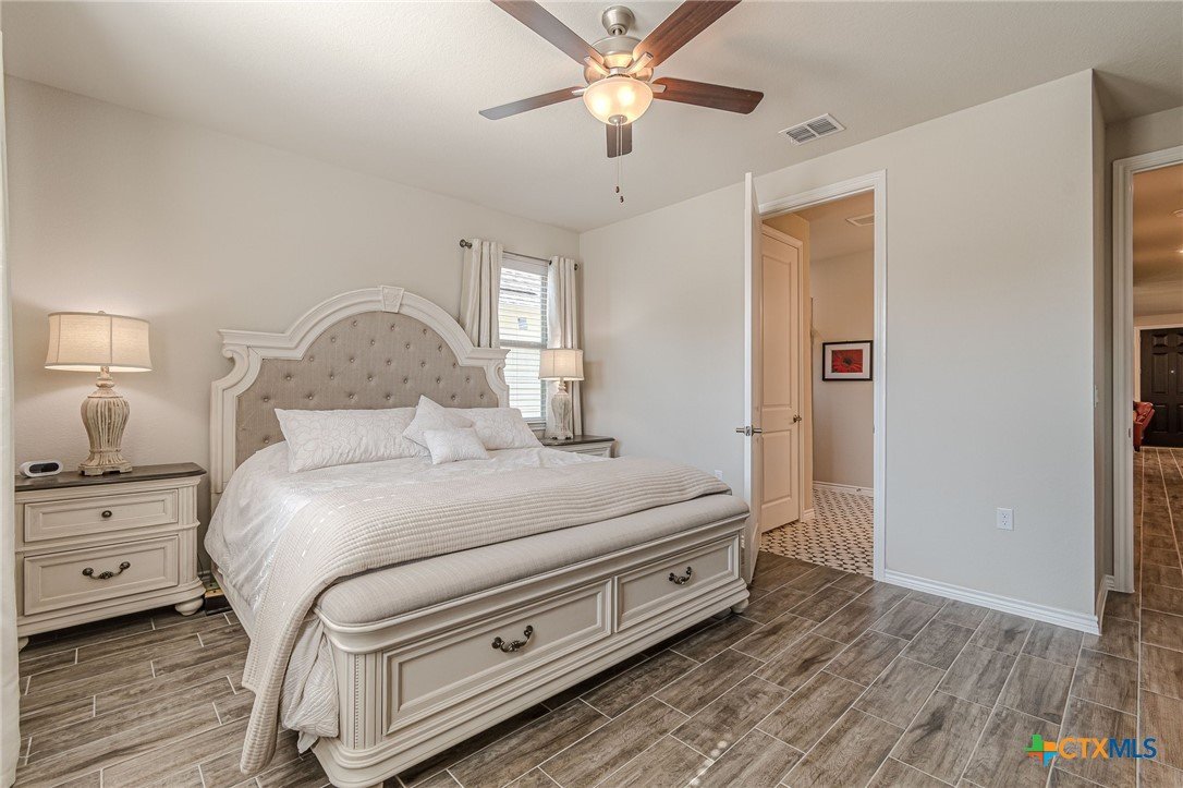 Perfect opportunity to own in this prestigious and very active 55 plus community. This Galvez floor plan offers spacious comfort, modern conveniences with lots of windows accented with beautiful and classy window treatments. Excellent neutral color scheme with ceramic tile wood look floors throughout, white cabinets with beautiful contrasting dark quartz countertops. Large main bedroom offers multiple furniture placement options with natural light. Main bathroom has dual vanities and a large oversized walk in shower. This location offers a short walk to the fitness center, community restaurant, and community swimming pools. These villas offer 24 hour security and a guard gated community with several outdoor enjoyment areas including built in bbq pits and quaint areas for relaxing, views, and enjoying your best life in this unmatched community. Exterior landscape maintained by HOA.