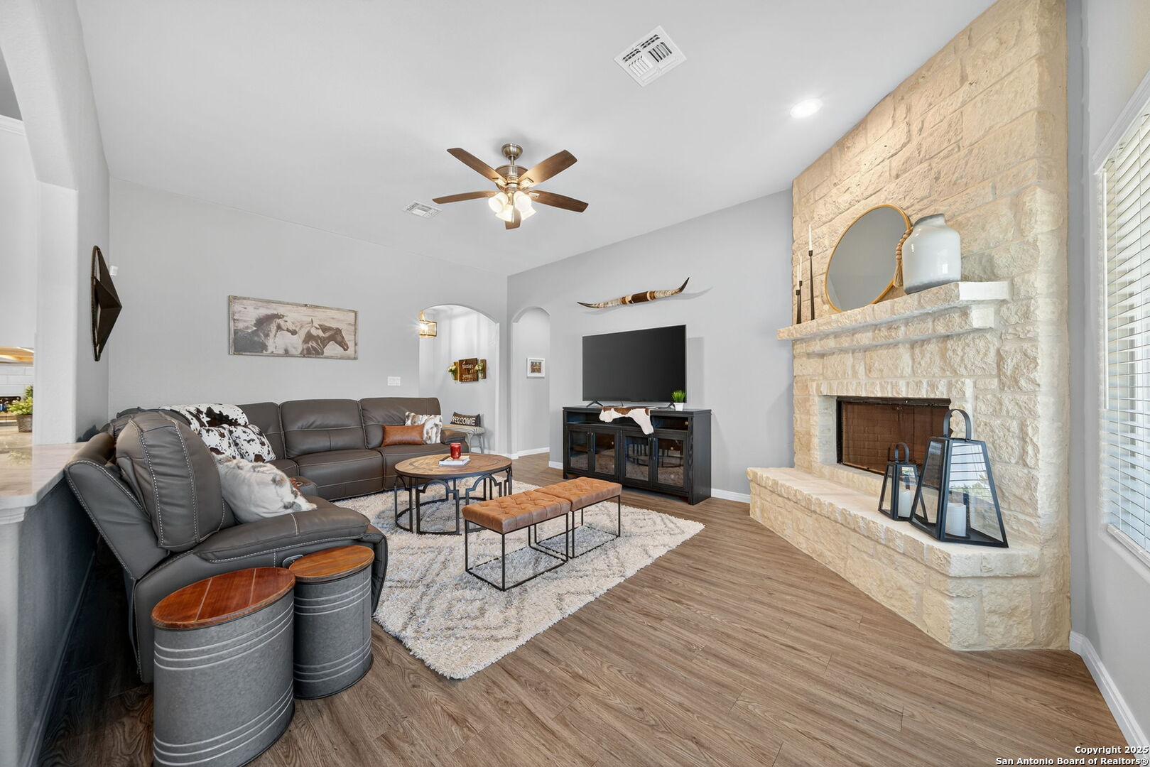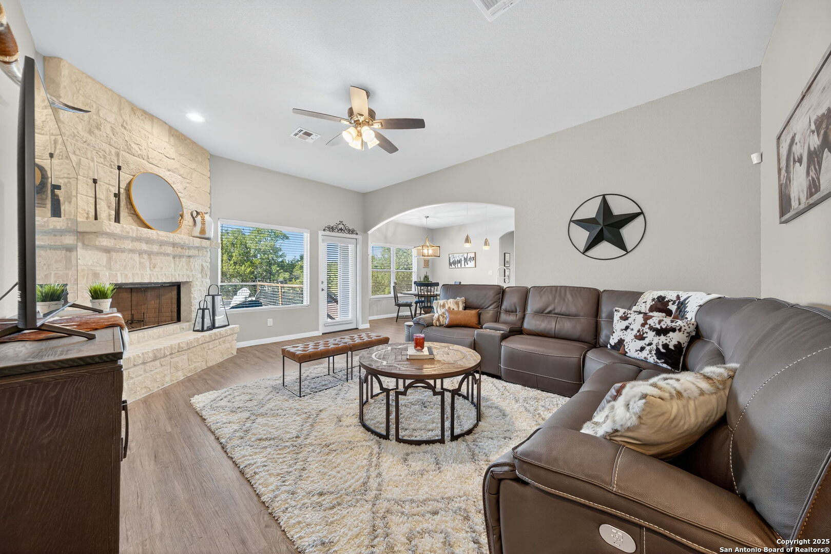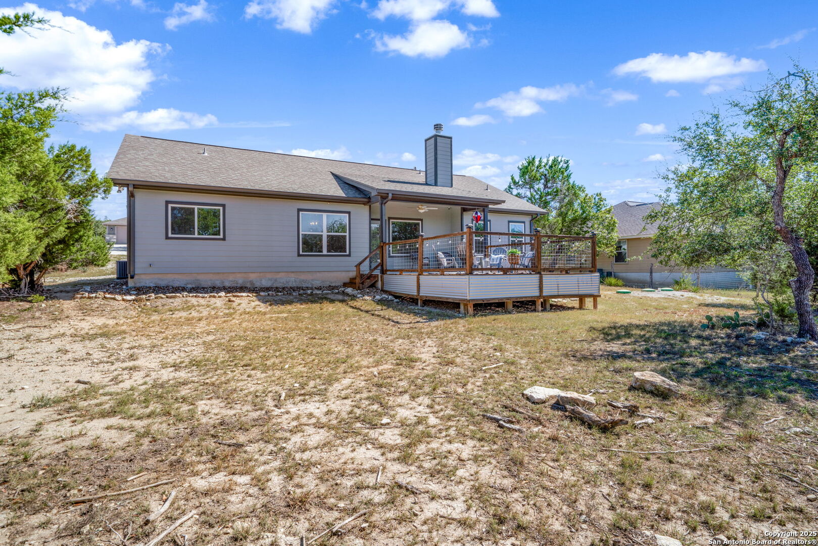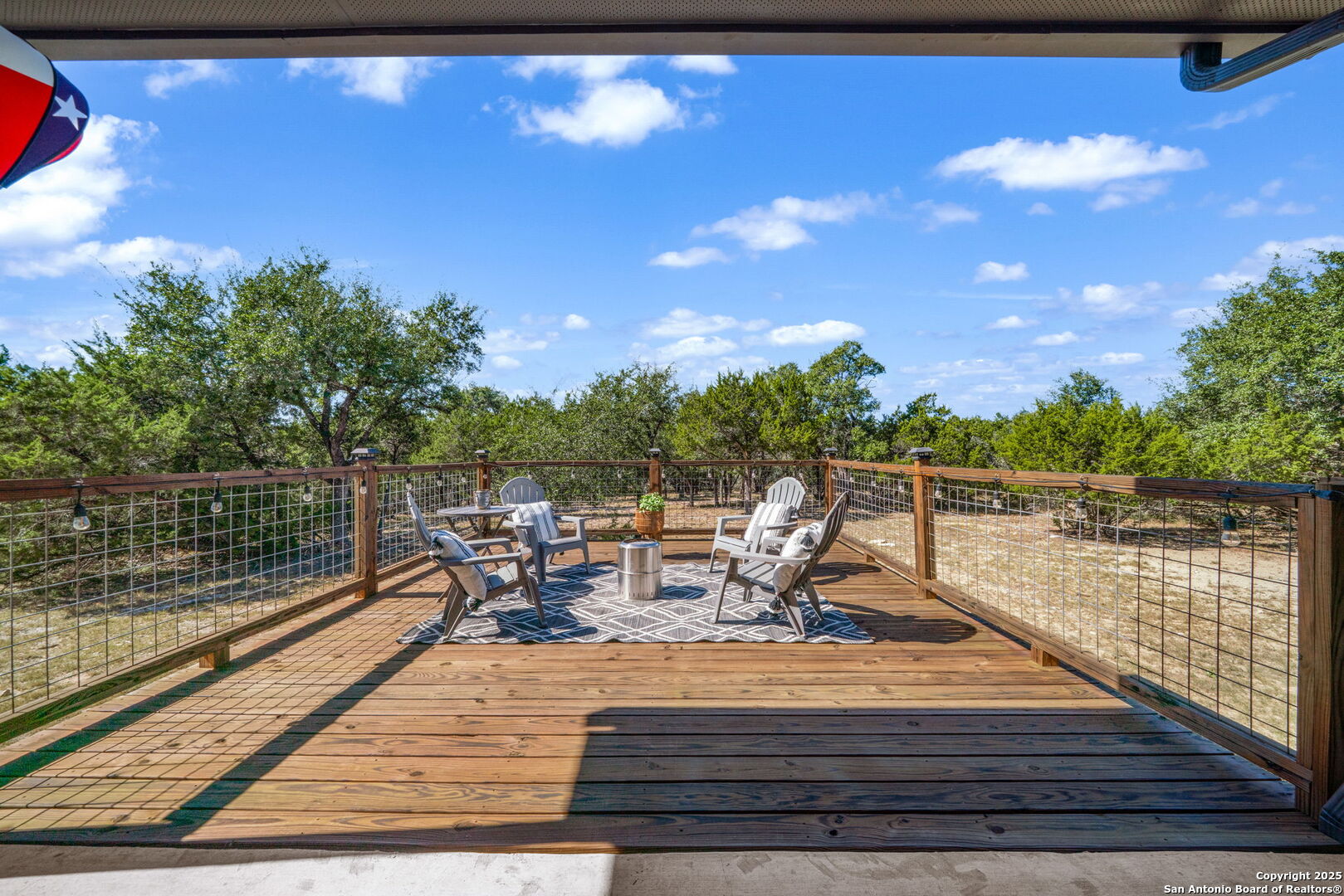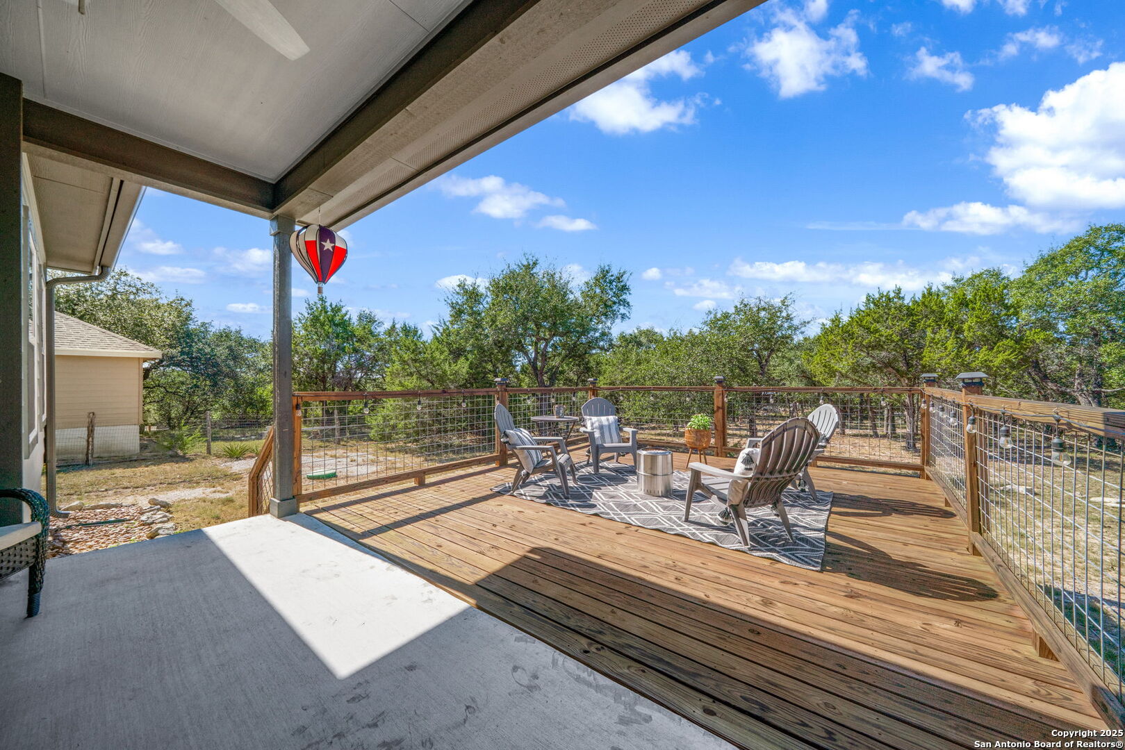 Immaculate Modern Lake Home Near Canyon Lake. Welcome to your dream retreat just minutes from the sparkling waters of Canyon Lake! This stunning single-story home, built just five years ago and lightly occupied, offers the perfect blend of modern comfort and timeless Hill Country charm. Step inside to an open-concept floor plan designed for easy living and effortless entertaining. The gorgeous kitchen features sleek finishes, generous counter space, and flows seamlessly into the spacious living area highlighted by a beautiful stone, wood-burning fireplace. A versatile flex room provides endless possibilities-ideal for a home office, fourth bedroom, or creative space to suit your needs. Throughout the home, you'll find upgraded flooring and no carpet, adding both style and practicality. Outside, enjoy the best of Texas living with a covered patio and an expansive deck, perfect for relaxing or entertaining guests. The oversized two-car garage features epoxy flooring for a clean, polished look, while the xeriscaped yard offers low-maintenance beauty year-round. This property comes move-in ready, with the refrigerator, washer, dryer, and all furniture available for sale-making it easy to start enjoying lake life right away. Don't miss this exceptional opportunity to own a nearly new home in a highly desirable location near Canyon Lake. Schedule your private showing today and experience lake living at its finest!