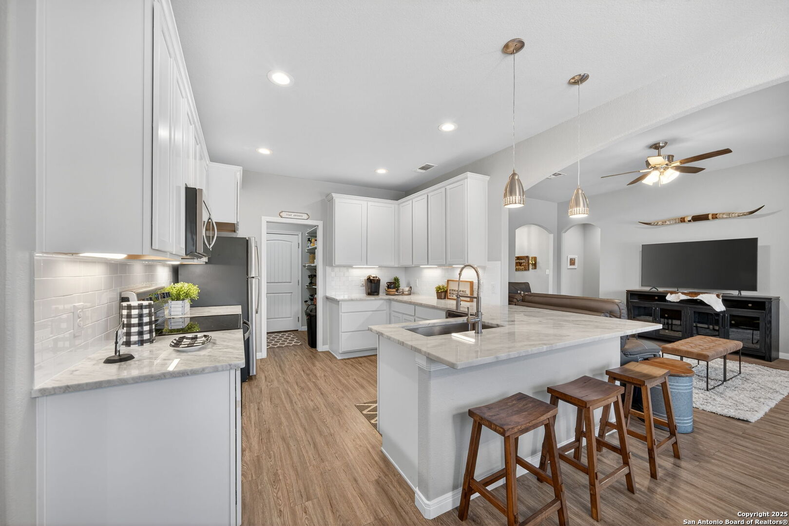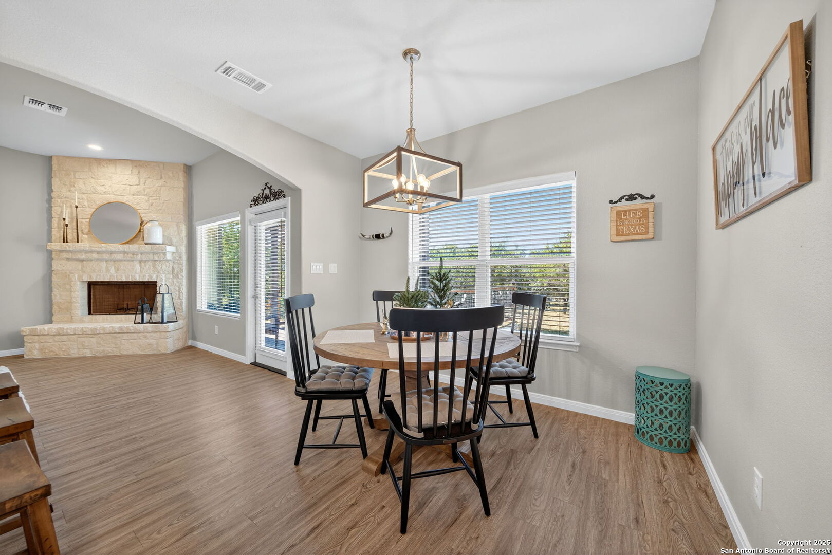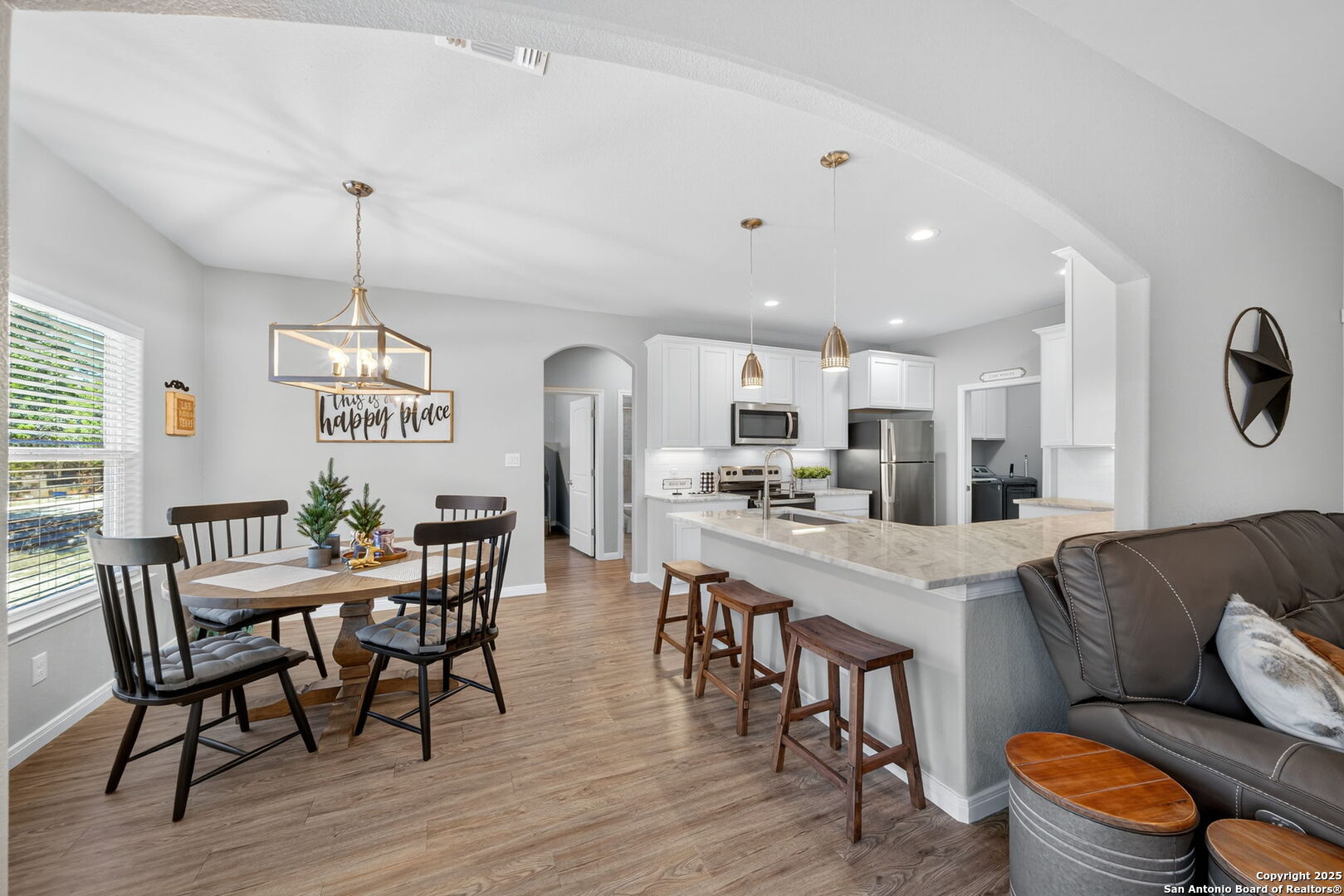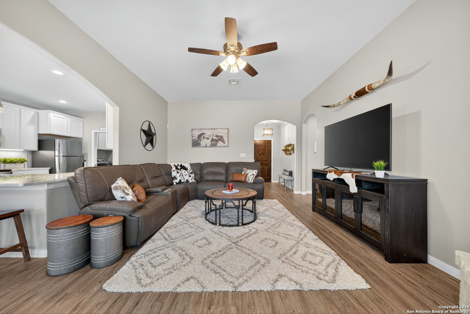 Immaculate Modern Lake Home Near Canyon Lake. Welcome to your dream retreat just minutes from the sparkling waters of Canyon Lake! This stunning single-story home, built just five years ago and lightly occupied, offers the perfect blend of modern comfort and timeless Hill Country charm. Step inside to an open-concept floor plan designed for easy living and effortless entertaining. The gorgeous kitchen features sleek finishes, generous counter space, and flows seamlessly into the spacious living area highlighted by a beautiful stone, wood-burning fireplace. A versatile flex room provides endless possibilities-ideal for a home office, fourth bedroom, or creative space to suit your needs. Throughout the home, you'll find upgraded flooring and no carpet, adding both style and practicality. Outside, enjoy the best of Texas living with a covered patio and an expansive deck, perfect for relaxing or entertaining guests. The oversized two-car garage features epoxy flooring for a clean, polished look, while the xeriscaped yard offers low-maintenance beauty year-round. This property comes move-in ready, with the refrigerator, washer, dryer, and all furniture available for sale-making it easy to start enjoying lake life right away. Don't miss this exceptional opportunity to own a nearly new home in a highly desirable location near Canyon Lake. Schedule your private showing today and experience lake living at its finest!