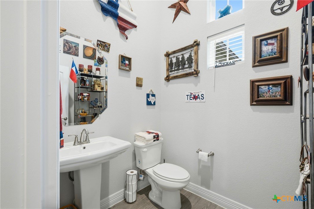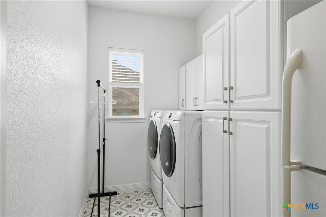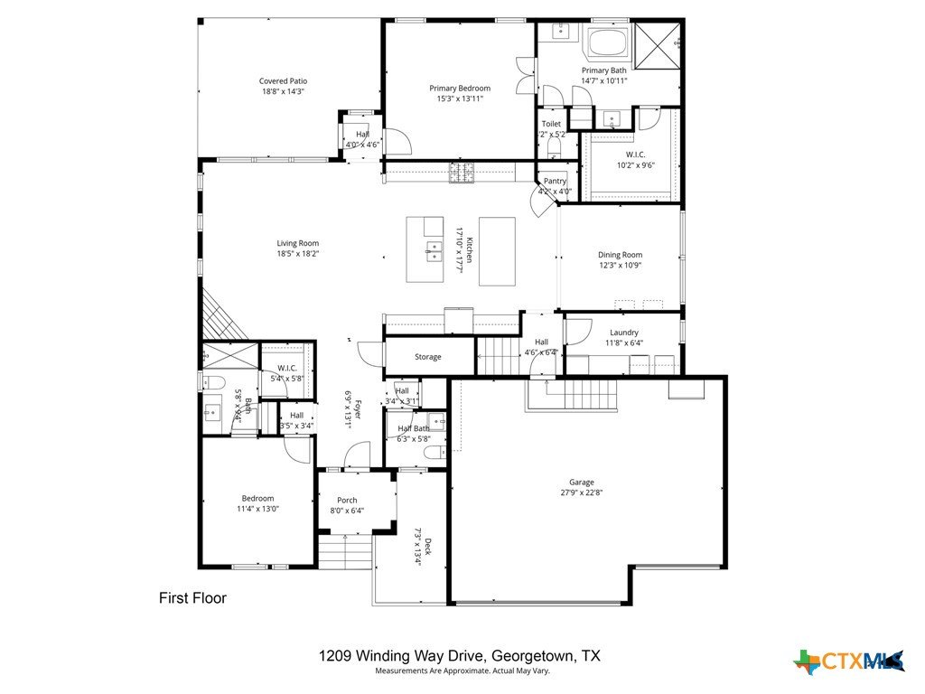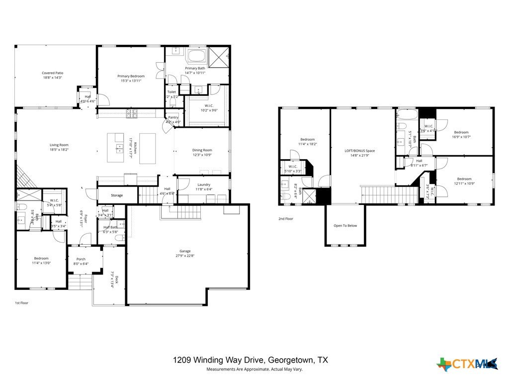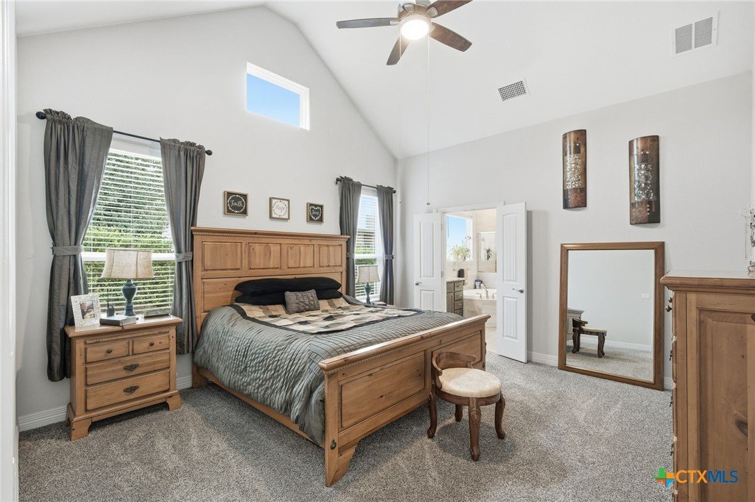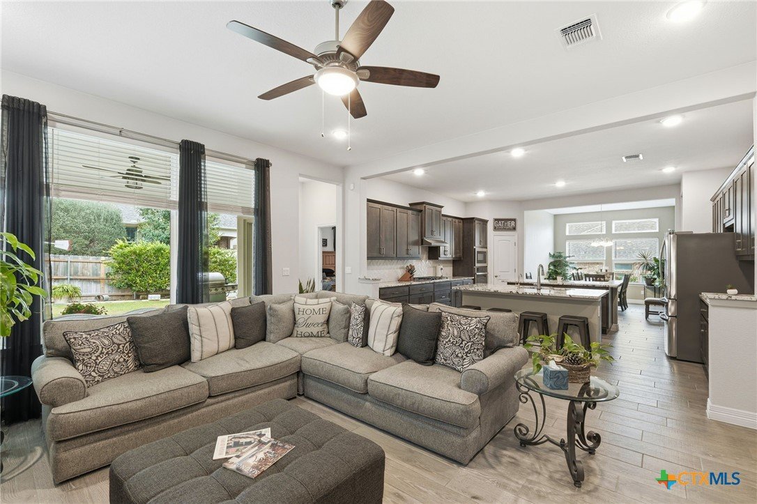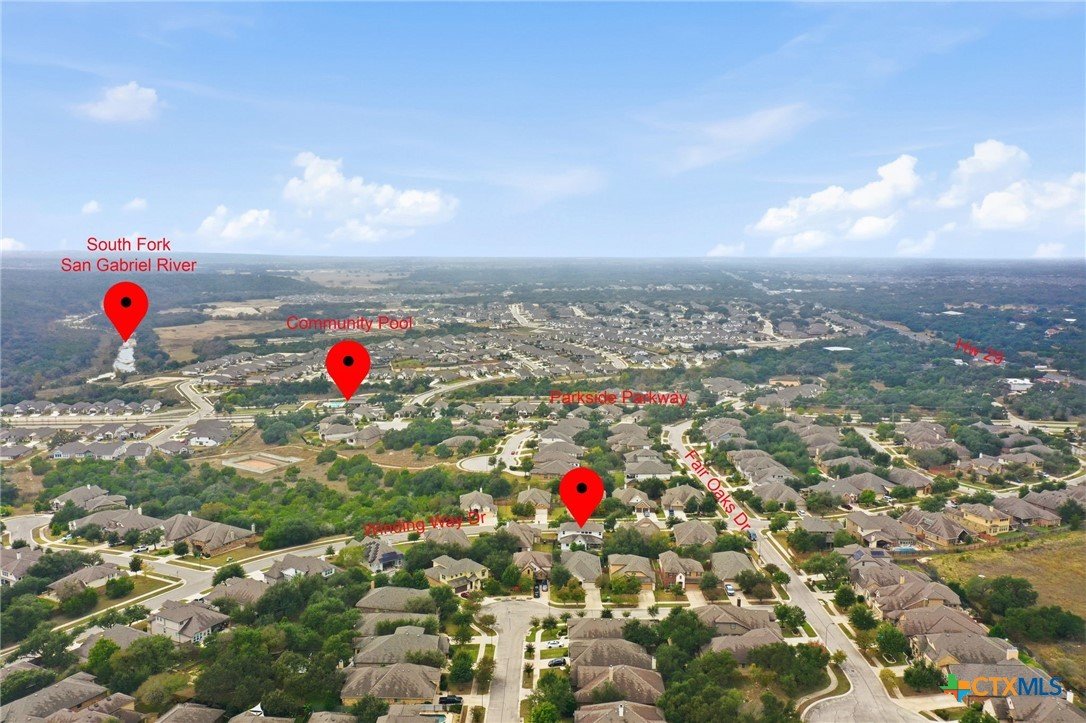 Beautifully crafted Chesmar home featuring an open-concept floor plan, spacious living areas, and a neutral designer palette throughout. Soaring ceilings in the entry welcome you into the heart of the home where the light-filled great room showcases a stunning artistic tile fireplace and flows seamlessly into the gourmet kitchen—perfect for entertaining. The kitchen is a chef’s dream with dual islands, abundant cabinetry and counter space, stainless steel appliances, and granite countertops. A large dining area just off the kitchen creates an inviting space for gatherings and everyday meals. The first floor offers a luxurious primary suite with vaulted ceilings and a ceiling fan, along with a spa-inspired bath featuring a walk-in shower, soaking tub, double vanities, and an oversized walk-in closet. A secondary bedroom downstairs includes its own private bath, making it ideal for guests or multi-generational living. Upstairs, enjoy a spacious loft and three additional bedrooms, each with private en-suite bathrooms—perfect for comfort and privacy. Nestled among mature trees on rolling streets with scenic views, this home is just minutes from the San Gabriel River, Lake Georgetown, premier shopping, dining, and entertainment. Welcome Home.