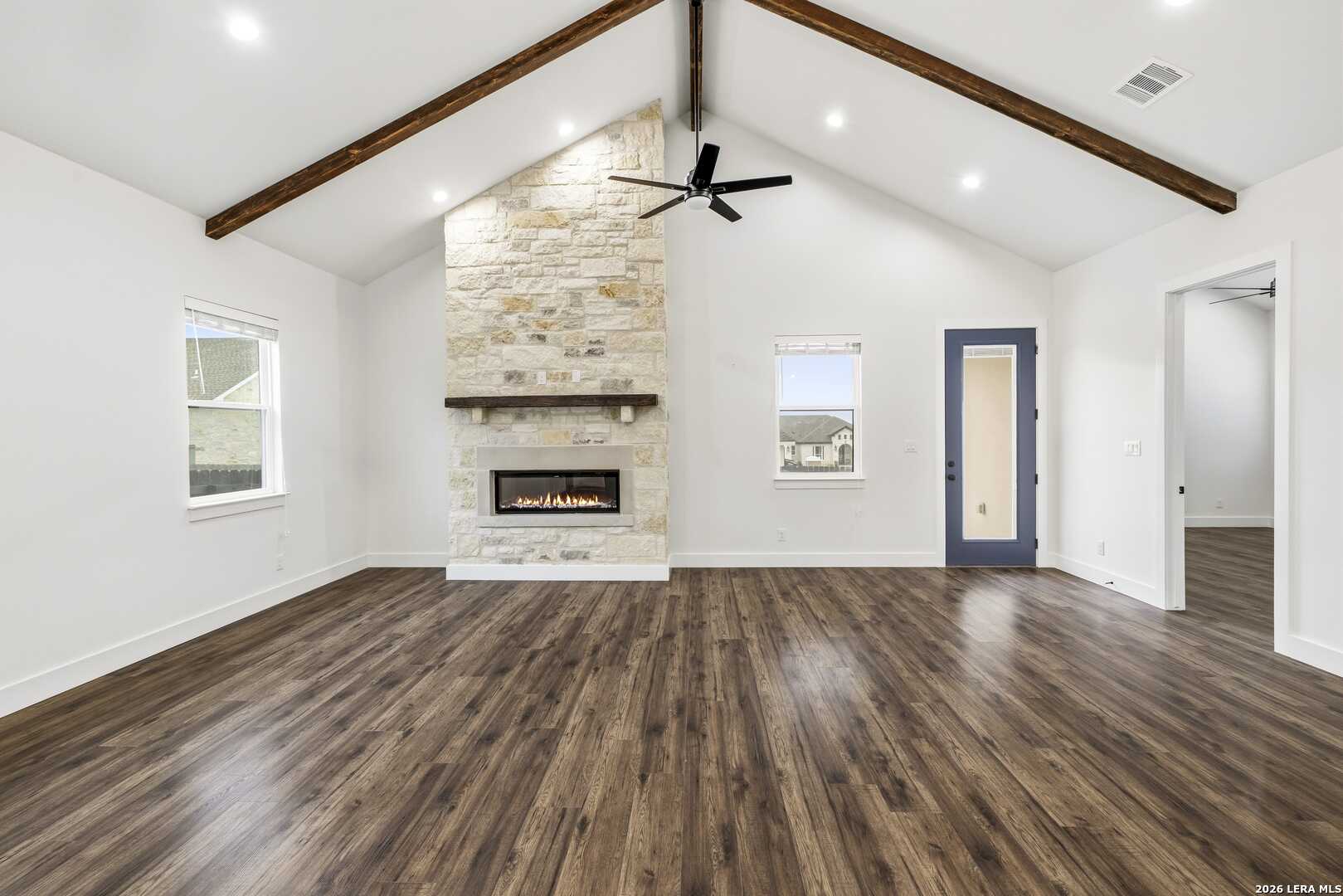 Built in 2023, this home blends modern comfort with timeless style. Vaulted ceilings are accented with rich dark wood beams, creating a warm and inviting atmosphere. High ceilings and 8' doors add air and light to the interior. The open floor plan offers over 1,700 sq. ft. of thoughtfully designed living space and ceiling fans throughout the home provide year-round comfort. Additional upgrades include soft close drawers, custom closets and quartz countertops. The primary suite features a vaulted ceiling, roomy shower, and a generous walk in closet. Outside, a privacy fence provides a secure and serene backyard retreat, perfect for relaxation or entertaining. Located in a quiet neighborhood on the edge of town, you'll enjoy the peace of country-style living just minutes from shops, dining, and other amenities.